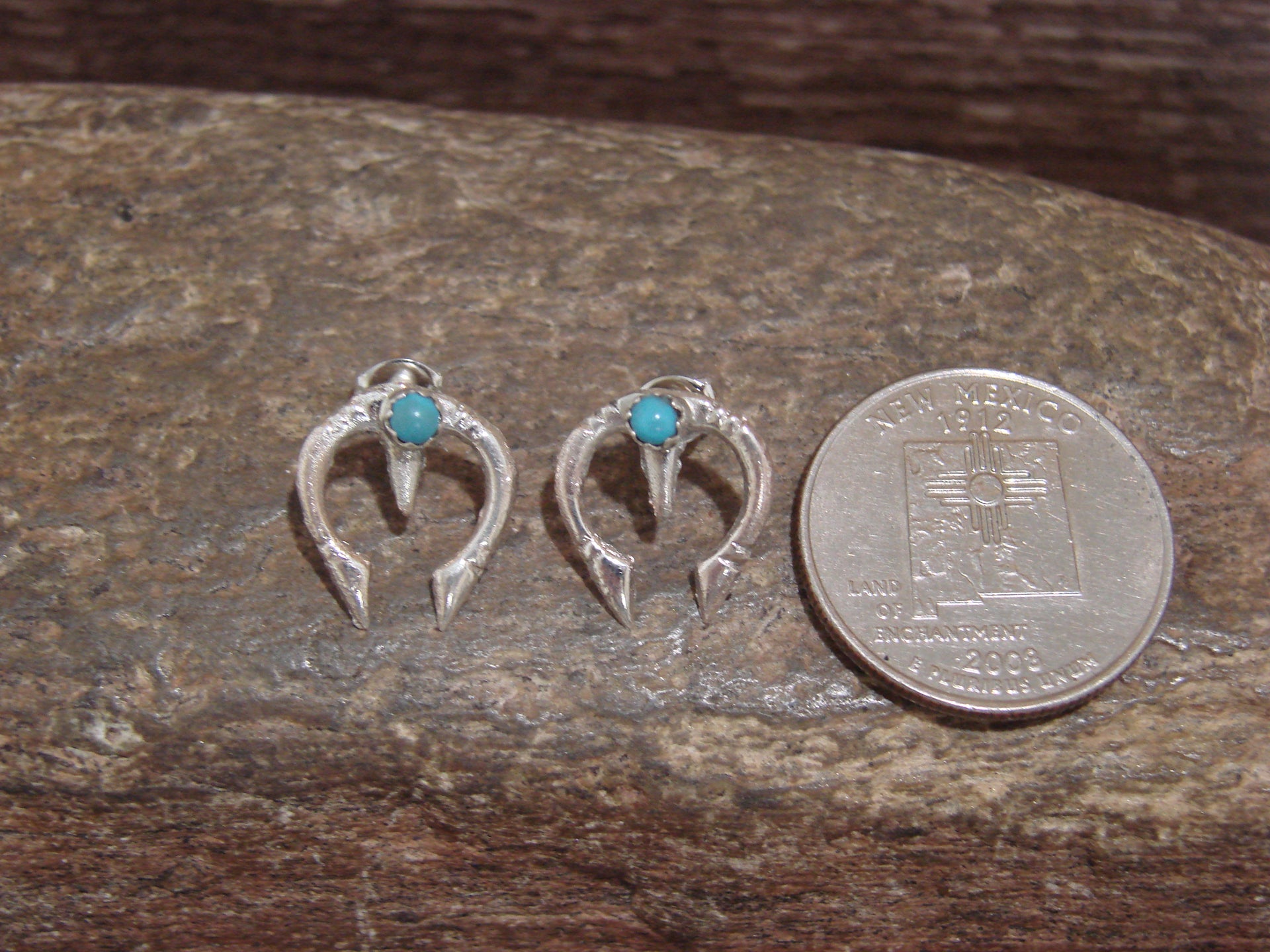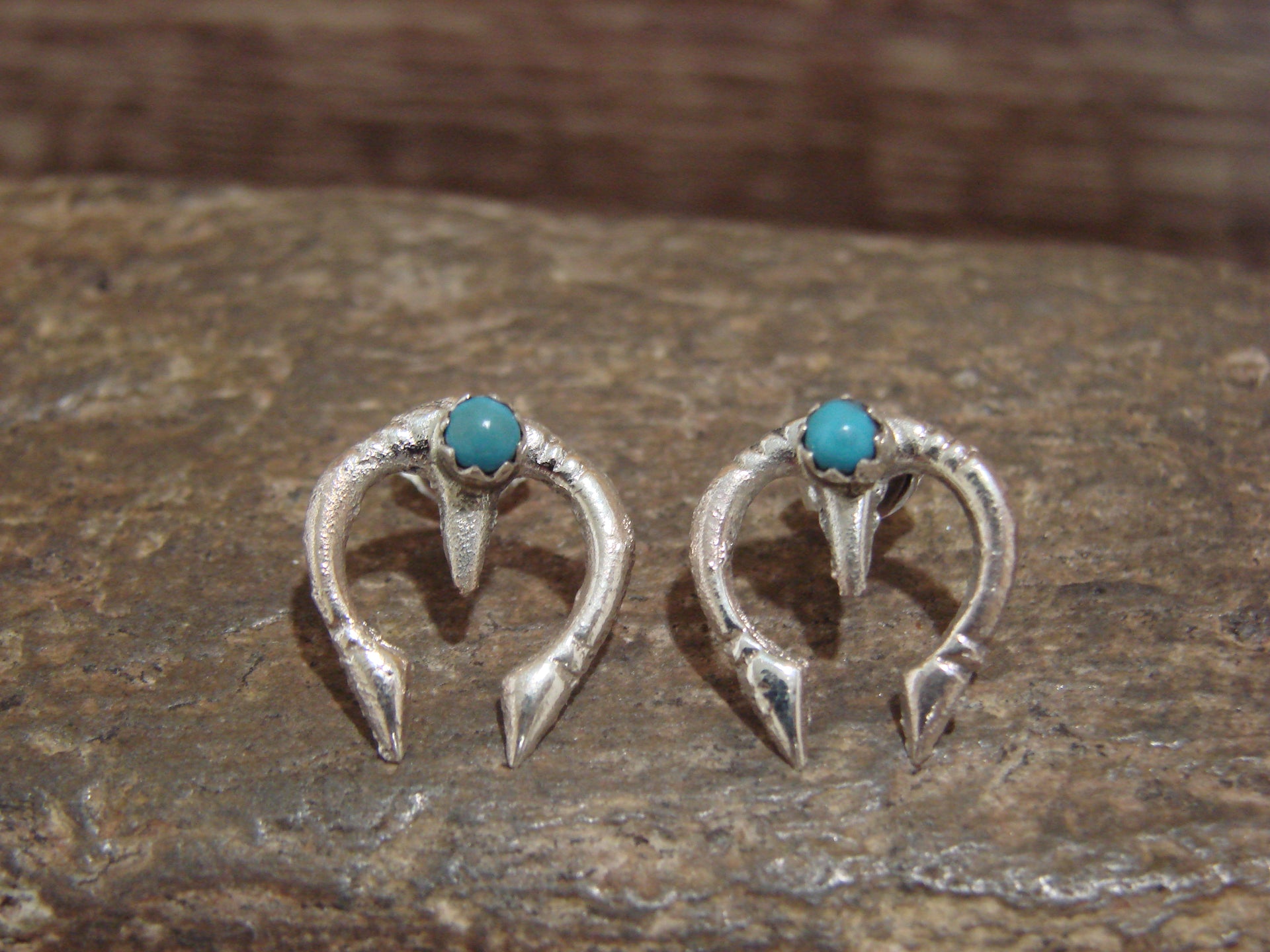 Native American Navajo Indian Sterling Silver & Turquoise Naja Post Earrings from Western New Mexico. These are absolutely gorgeous earrings featuring a Turquoise stone set into a crown bezel at the center of a cast sterling silver Naja. The Naja is detailed with hand stamping. Navajo Indian handmade by Michael Bitsie. Unsigned. Free shipping and gift box included!