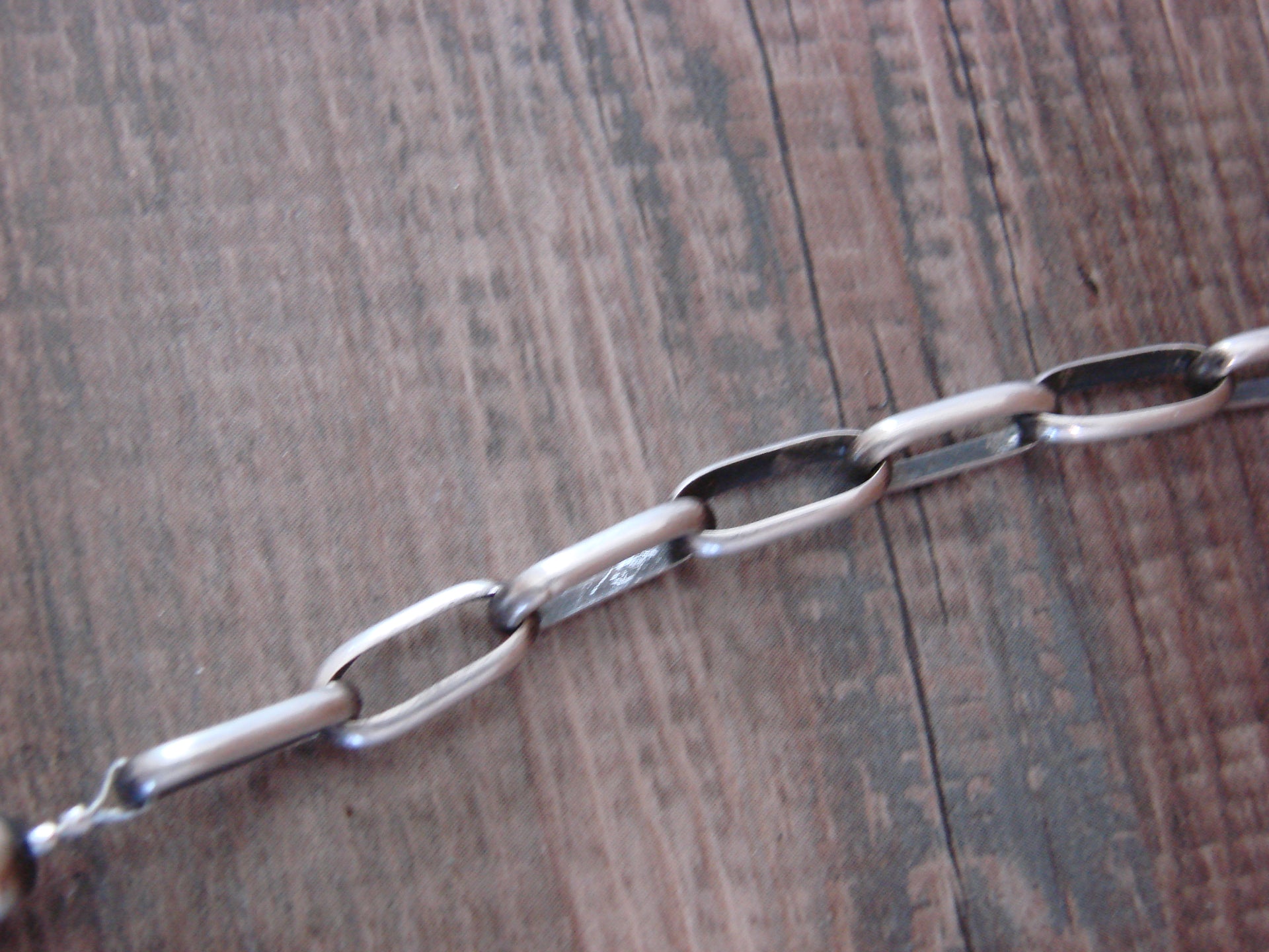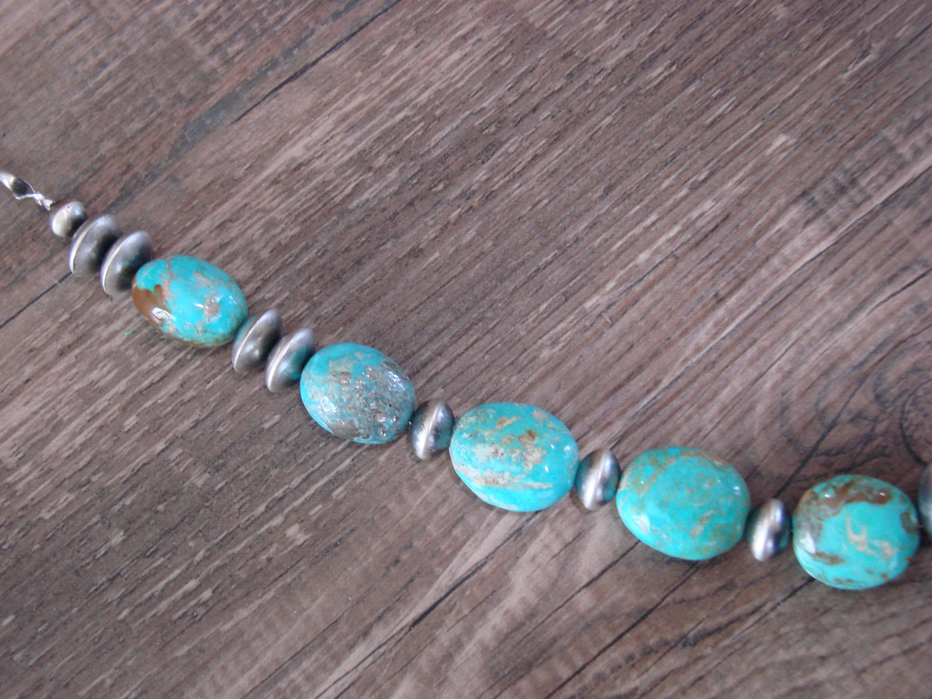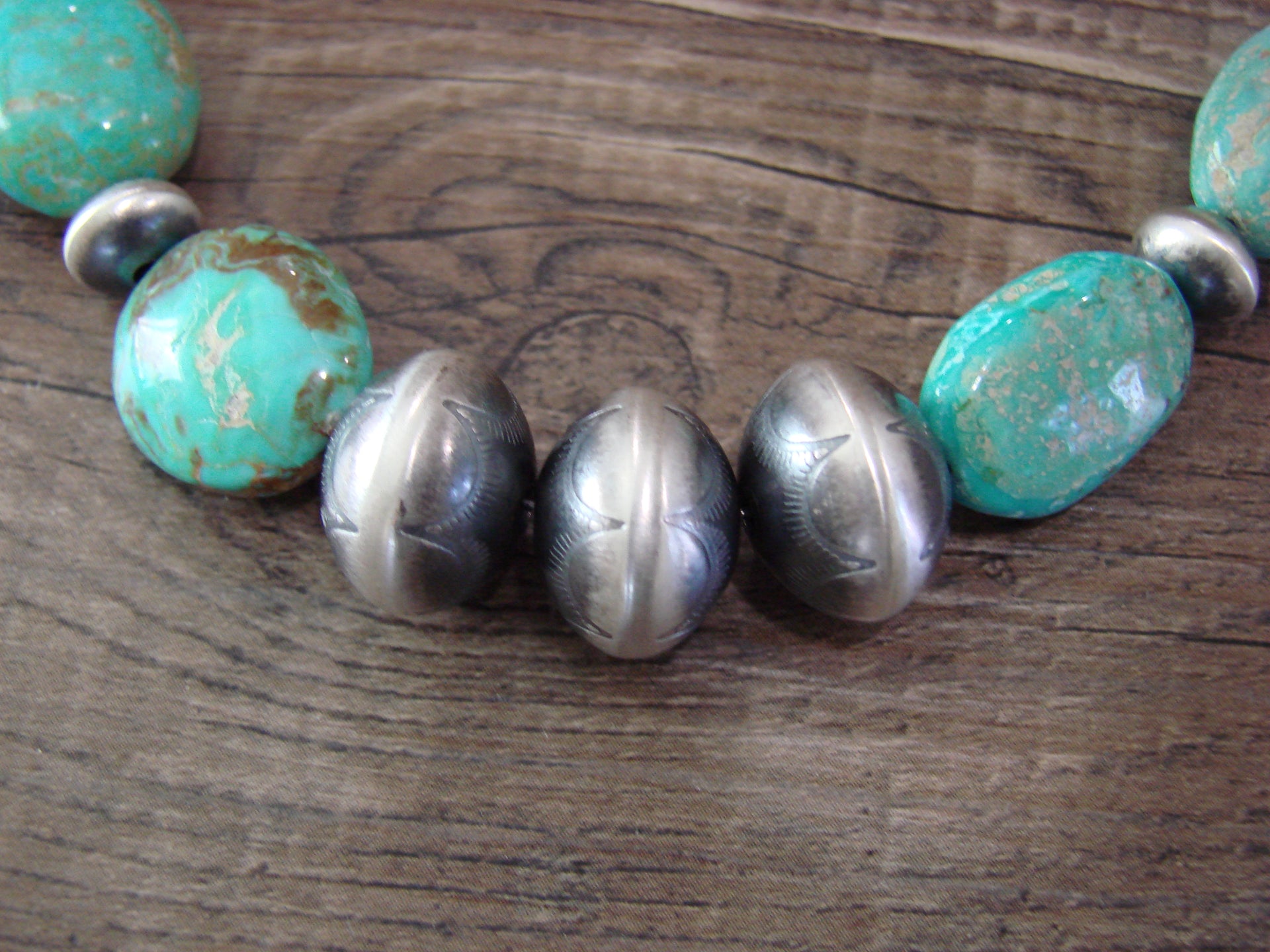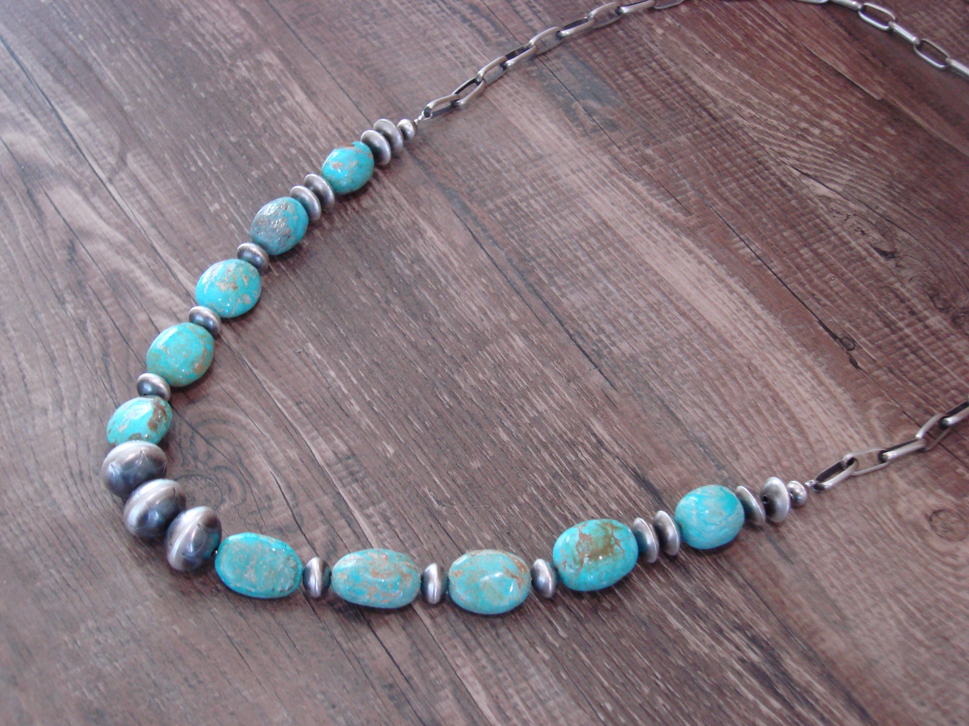 Genuine Native American Navajo Indian Sterling Silver Turquoise & Navajo Pearl Necklace from Western New Mexico. This Large necklace features Stunning, Genuine, High Quality Turquoise Nugget Stones beautifully accented with Sterling Silver Navajo Pearls. With Hand Made Sterling Silver links, this Necklace is Gorgeous! Fine Navajo Silversmith workmanship quality makes this necklace a beautiful hand made masterpiece! Handmade by Navajo Silversmith Isabelle John. Unsigned. Free gift box and shipping included!
