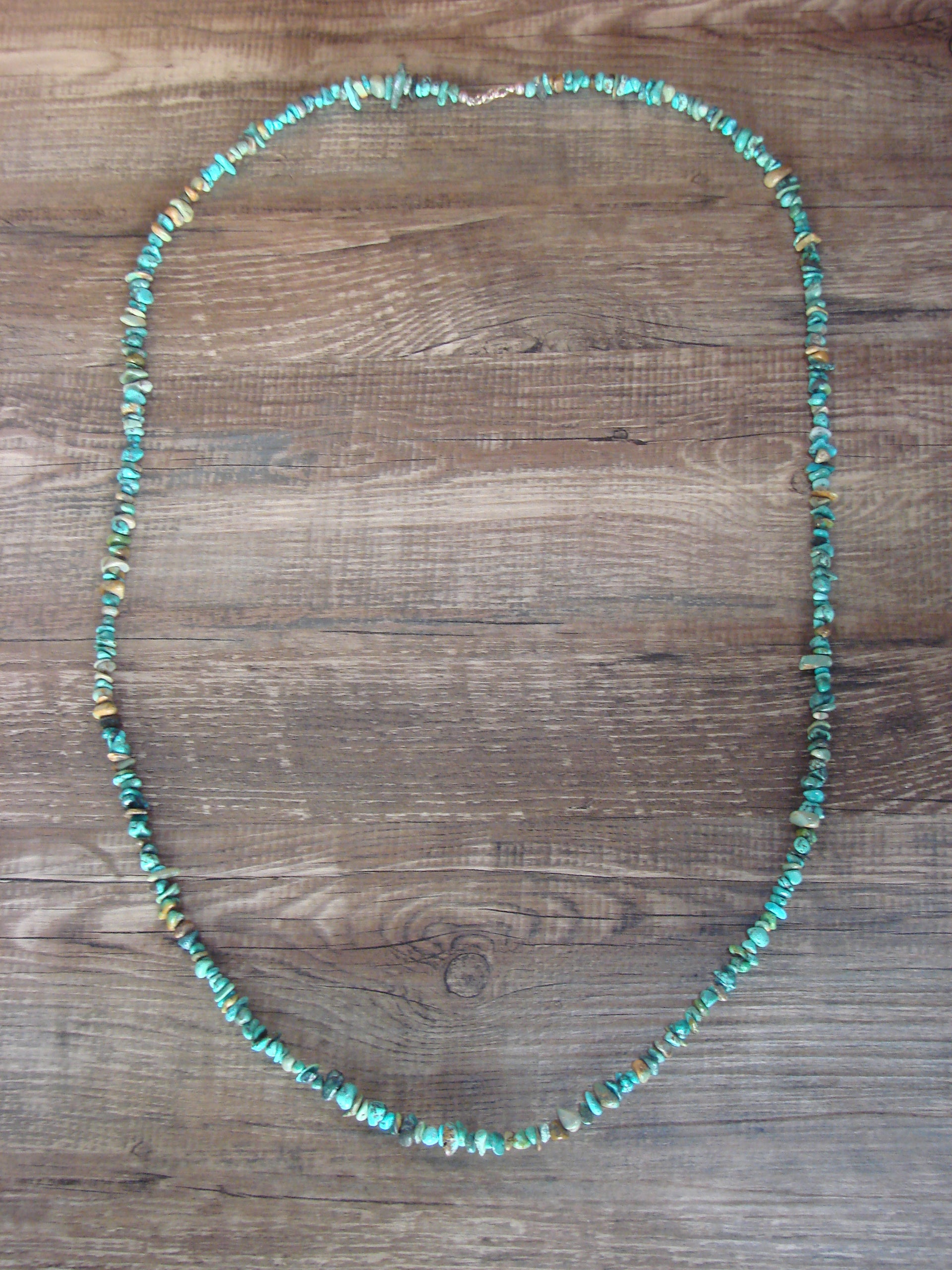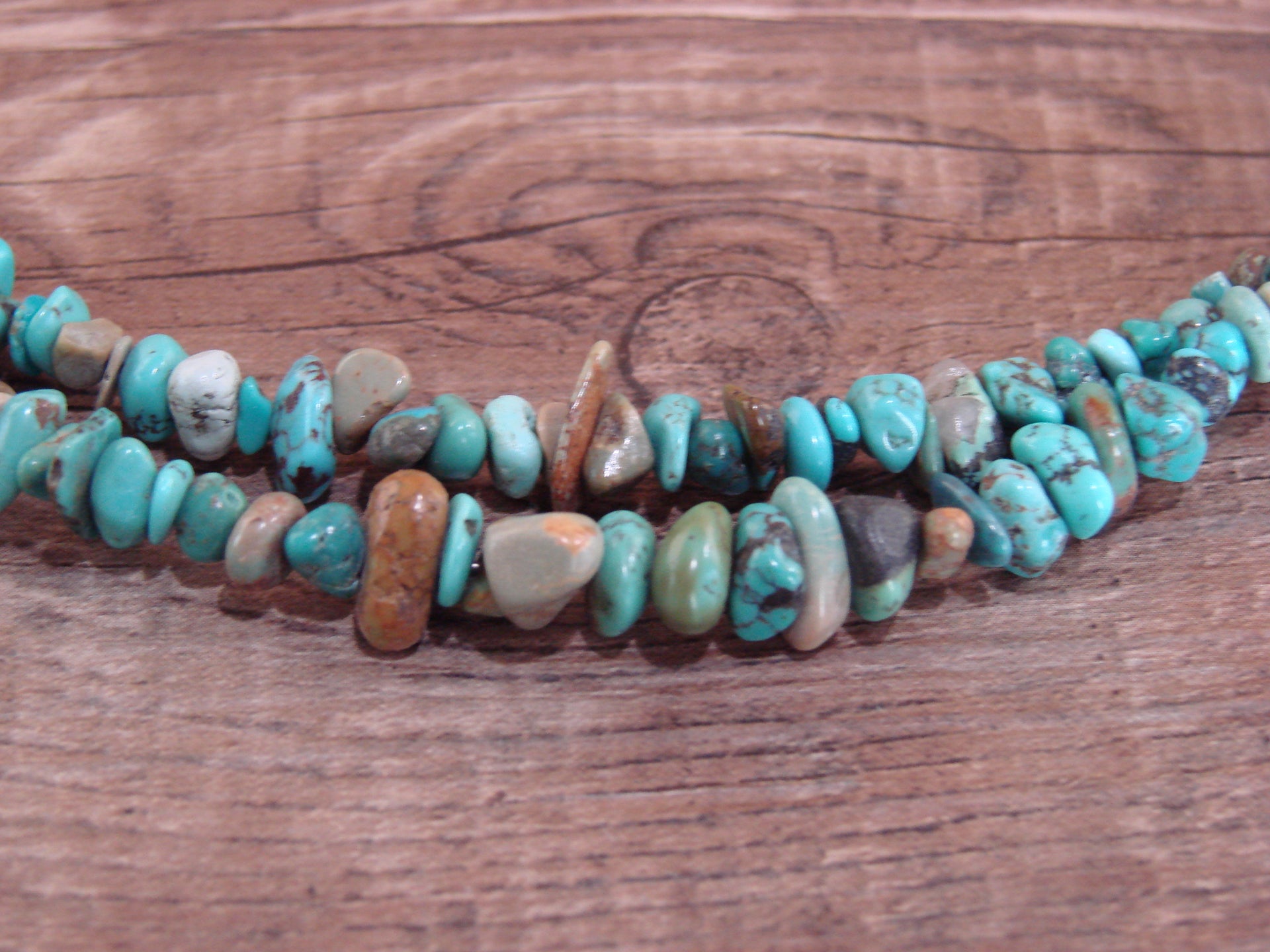Genuine Native American Navajo Indian Sterling Silver Turquoise Necklace from Western New Mexico. This Gorgeous necklace features Stunning, Genuine Turquoise Nugget Stones. This 36" Necklace can be worn at 36" or double wrapped to create 2 Strands as a shorter Necklace. When double wrapped, it falls as about the length of two 16" Strands. Fine Navajo Silversmith workmanship quality makes this Necklace a beautiful hand made masterpiece! Handmade by Navajo Silversmith Coreta Coriz. Unsigned. Free gift box and shipping included!