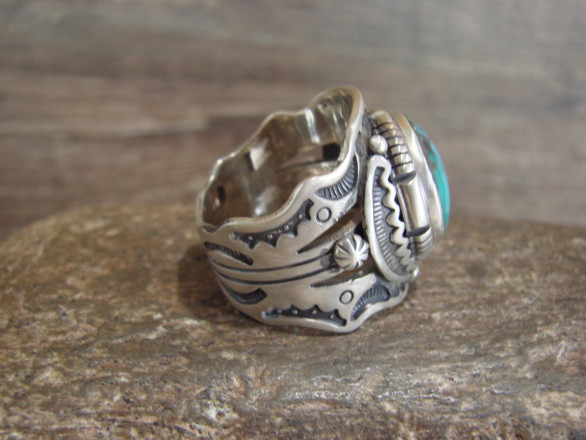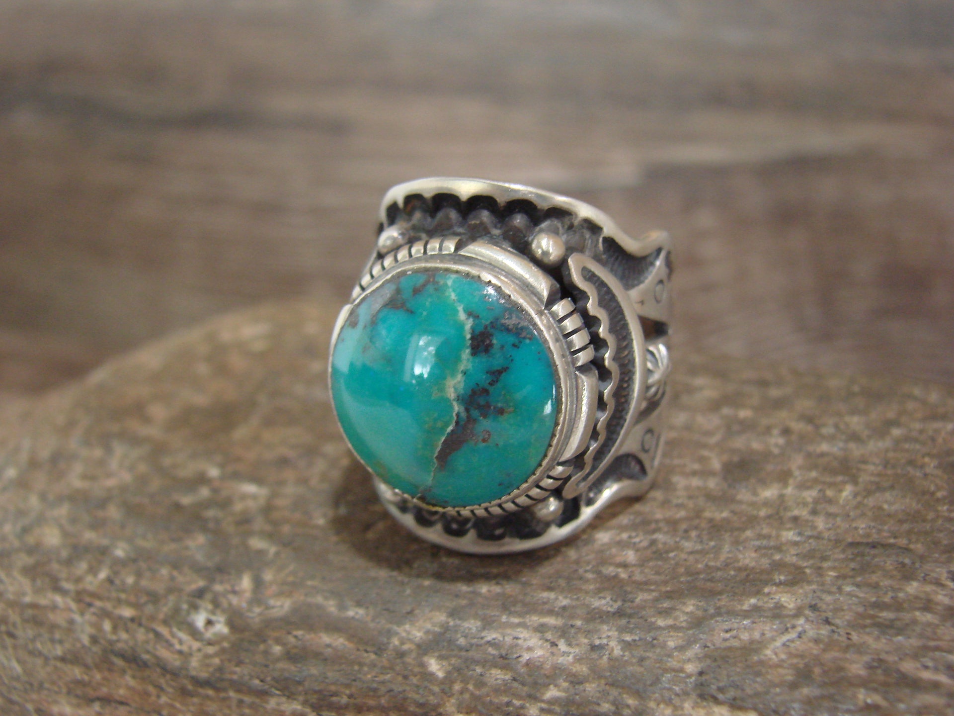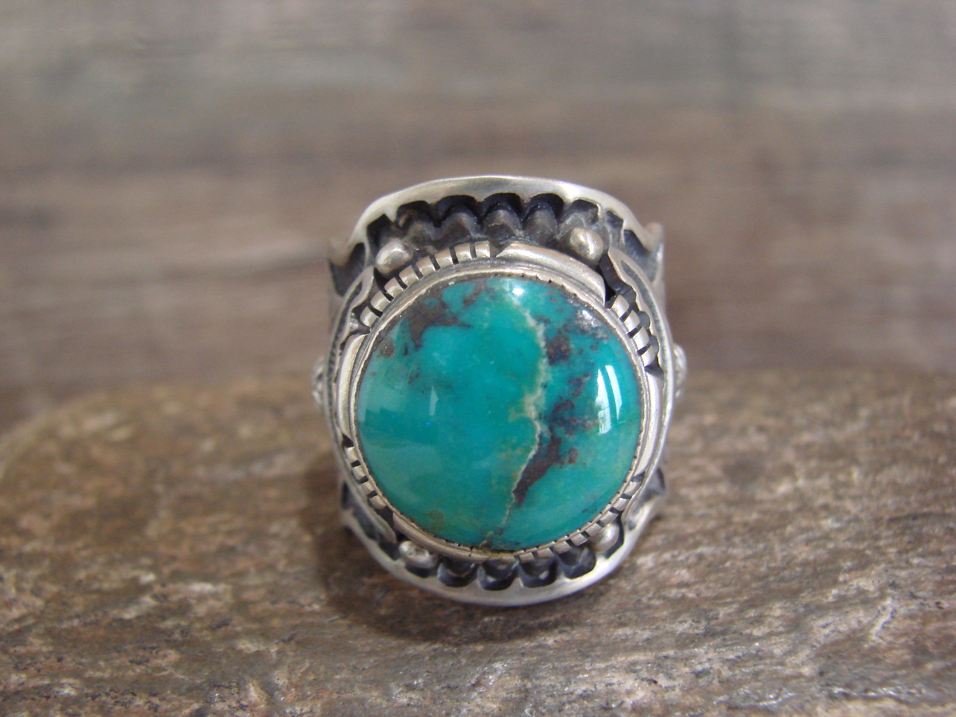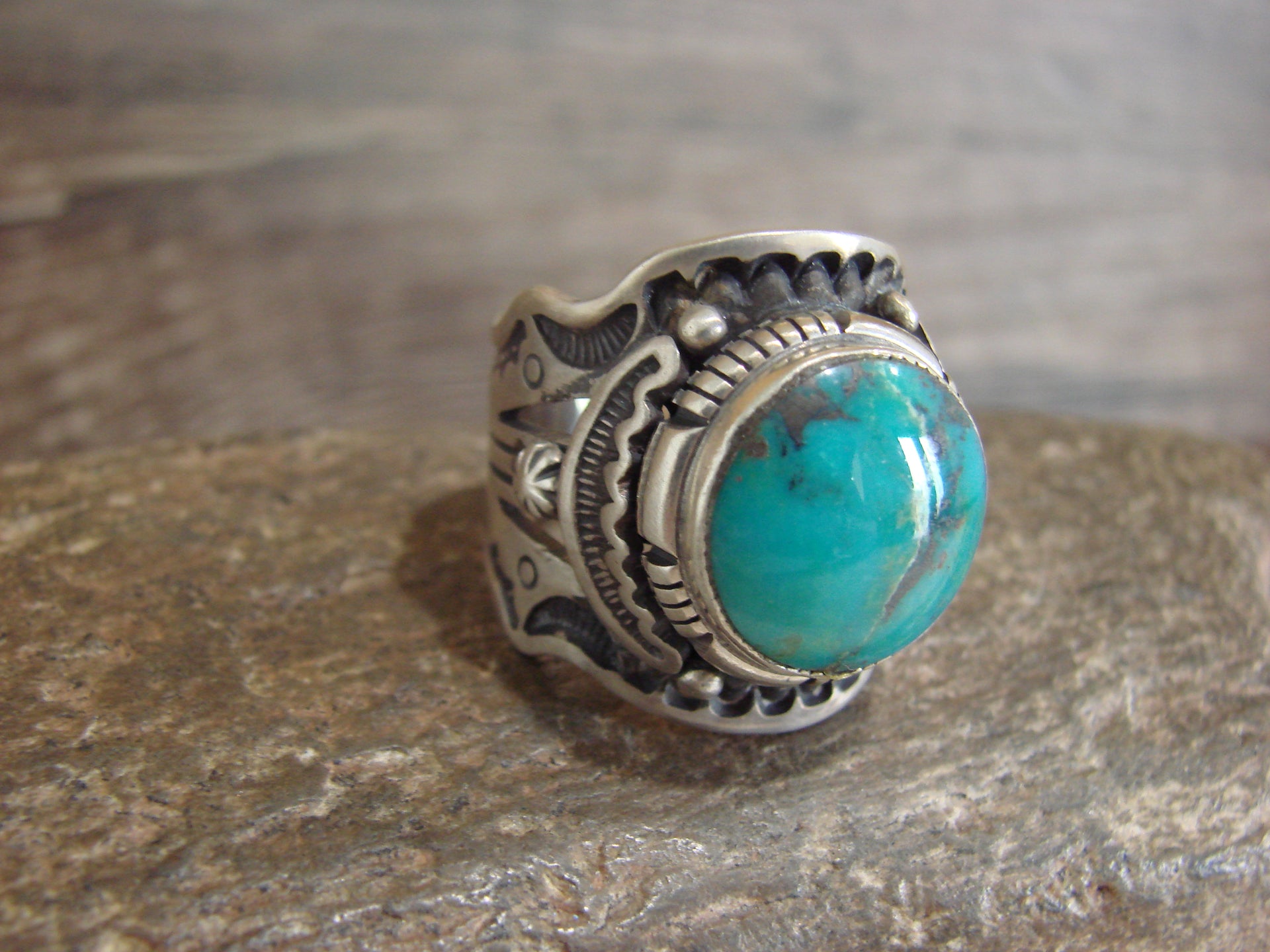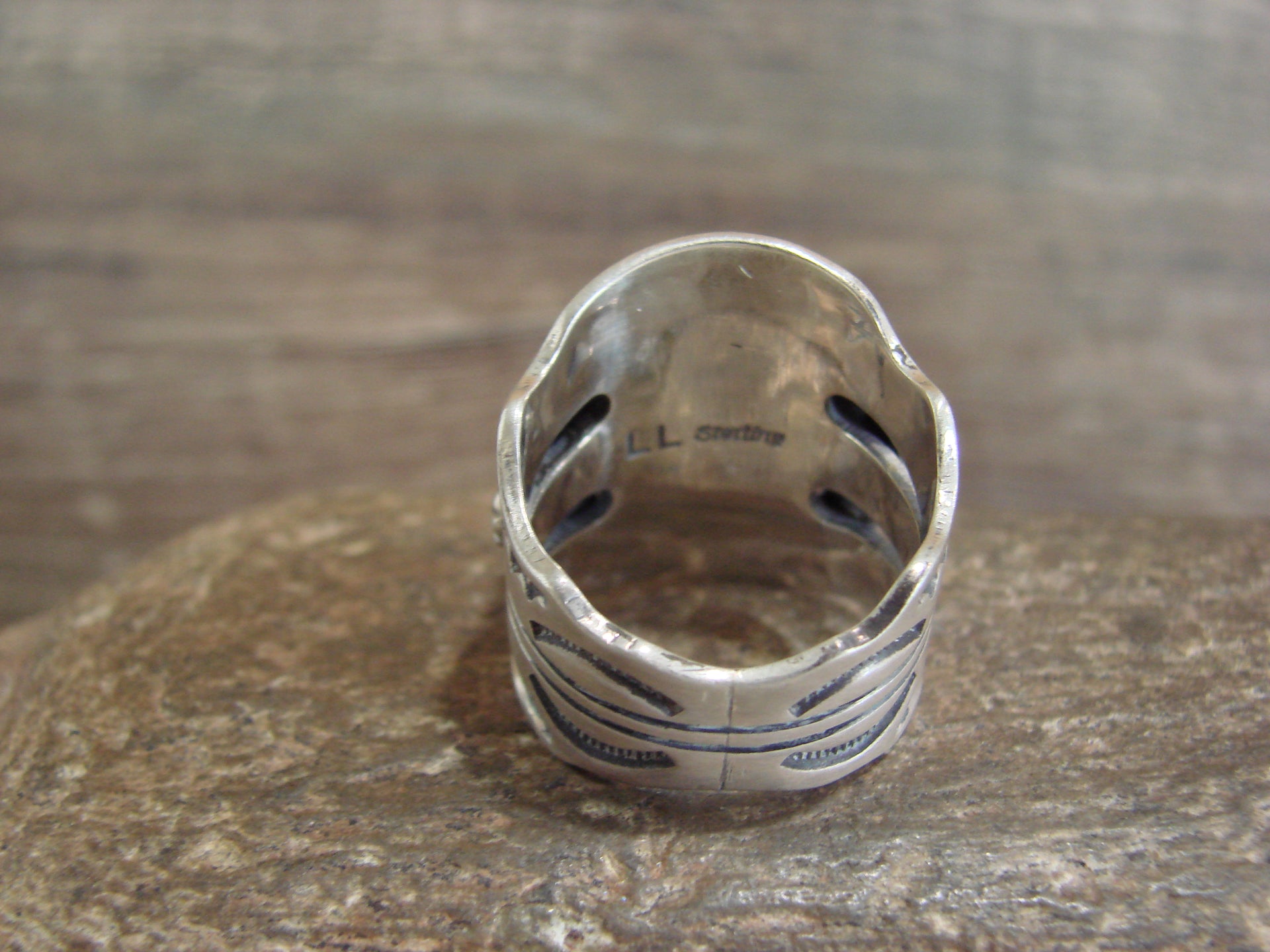 Genuine Native American Navajo Indian Sterling Silver & Turquoise Ring from Western New Mexico. This Large, Genuine ring features a single, stunning, high quality Turquoise stone set into a crown Sterling Silver bezel setting. Sterling Silver details & Hand Stamping surround this gorgeous stone. This ring is a Statement Piece! Navajo Indian handmade and Signed "LL" by Larson Lee. Stamped "Sterling" on the inner band. Free Shipping and Gift Box included!