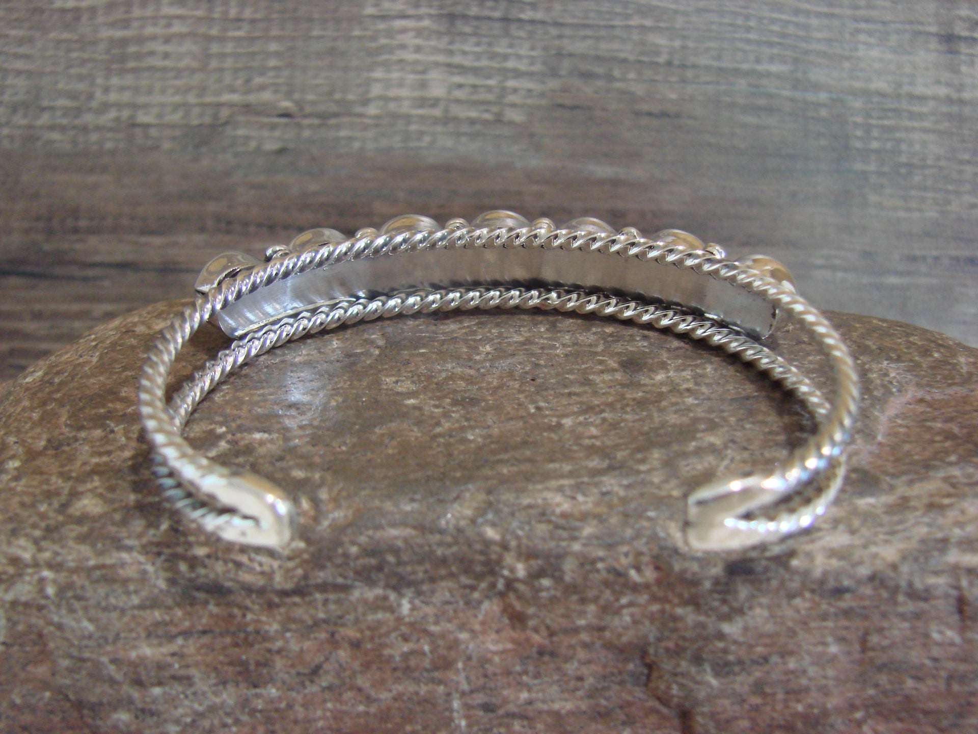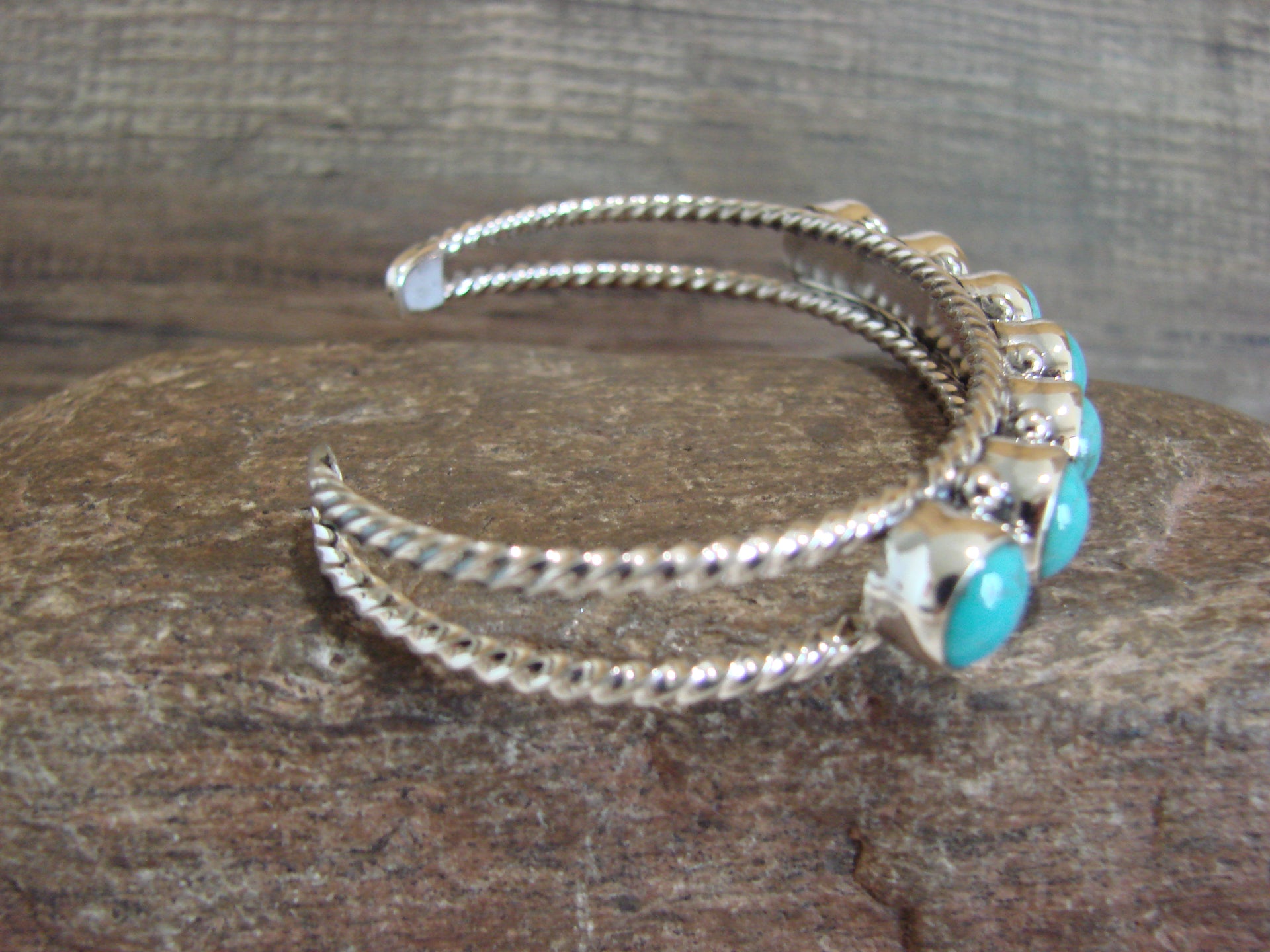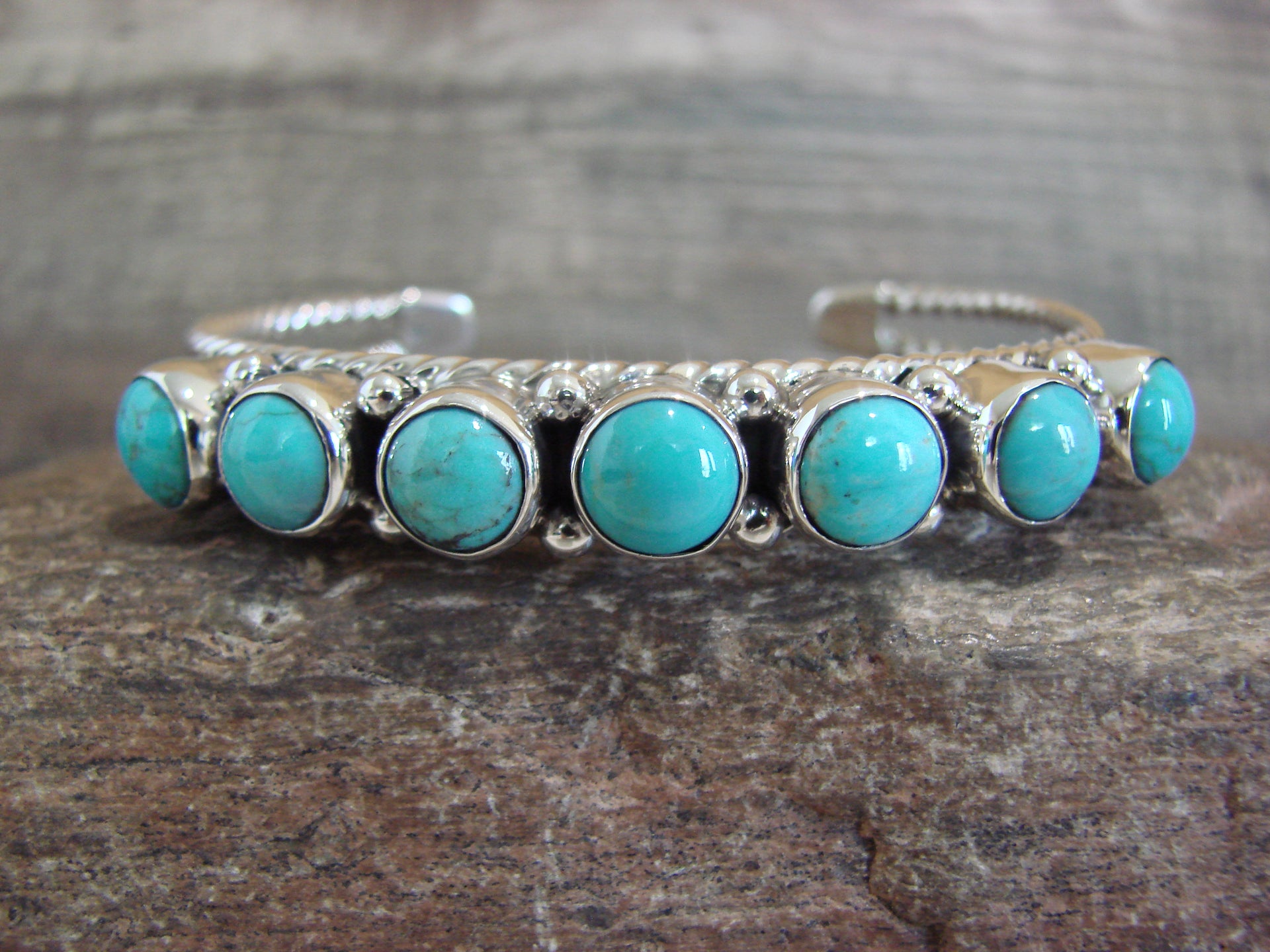 Genuine Native American Navajo Indian Sterling Silver & Turquoise Row Bracelet from Western New Mexico. This Stunning bracelet features a Single Row of beautiful high quality, Genuine, Turquoise stones intricately set into Smooth Sterling Silver bezel settings. Sterling Silver Details surround the stones. Fine Navajo Silversmith workmanship quality makes this bracelet a beautiful hand made masterpiece! Navajo Indian handmade by Sheena Jack. Stamped "Sterling" on the inner cuff. Free gift box and shipping included!