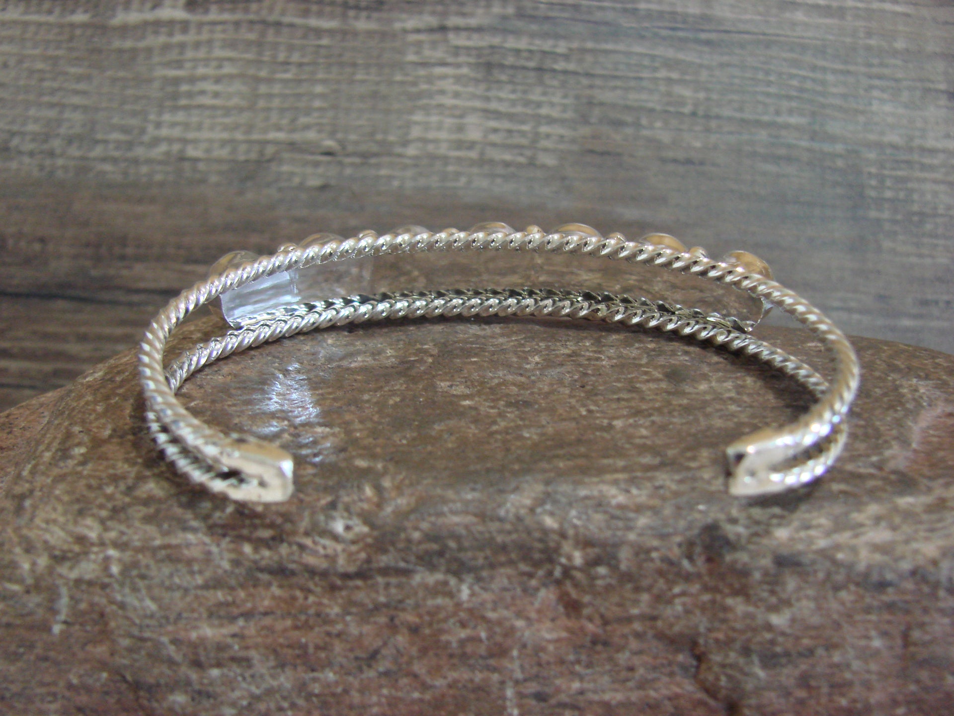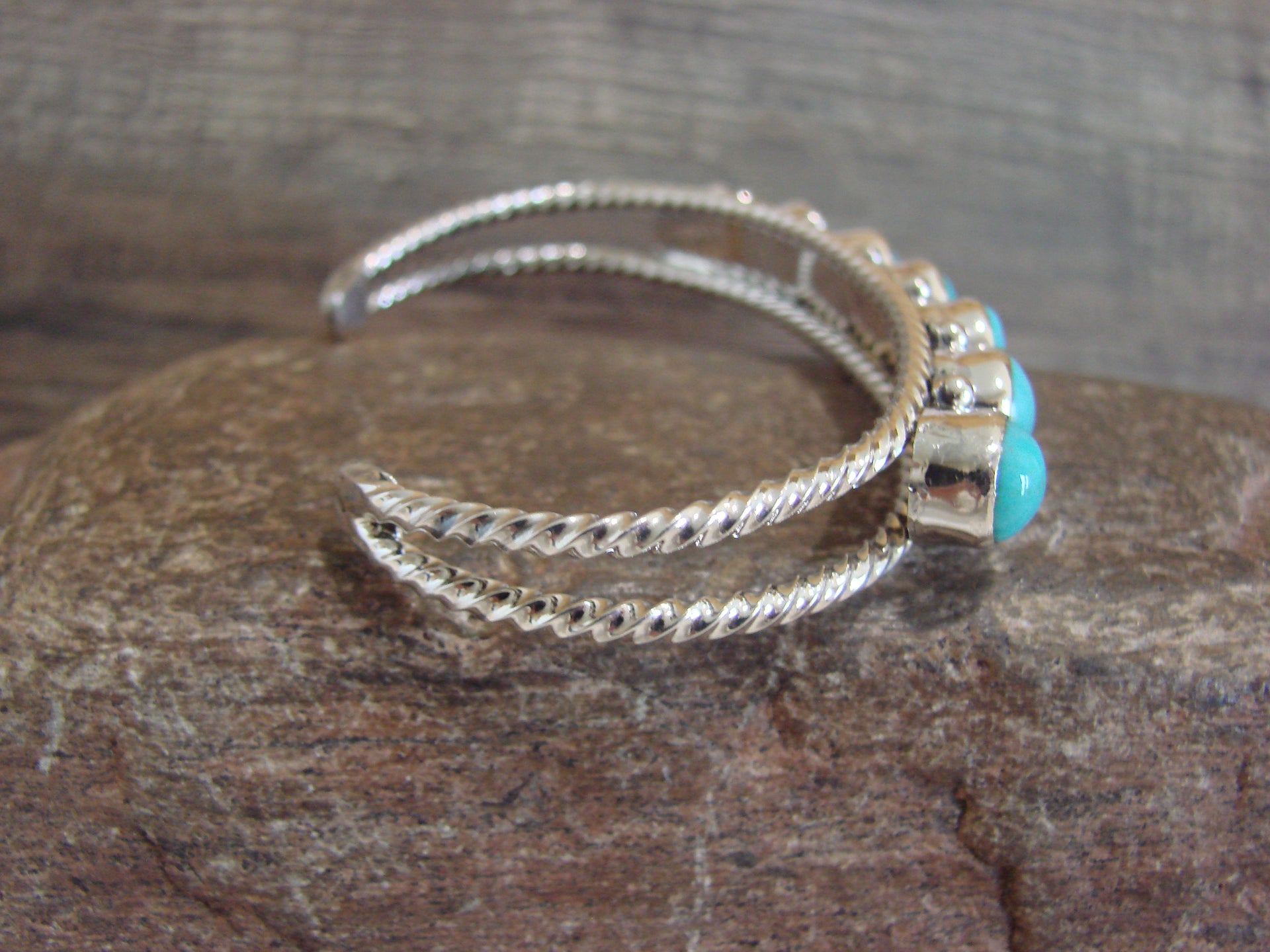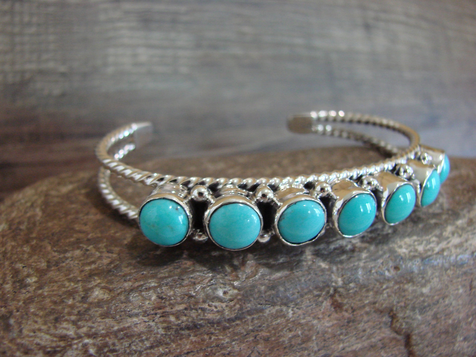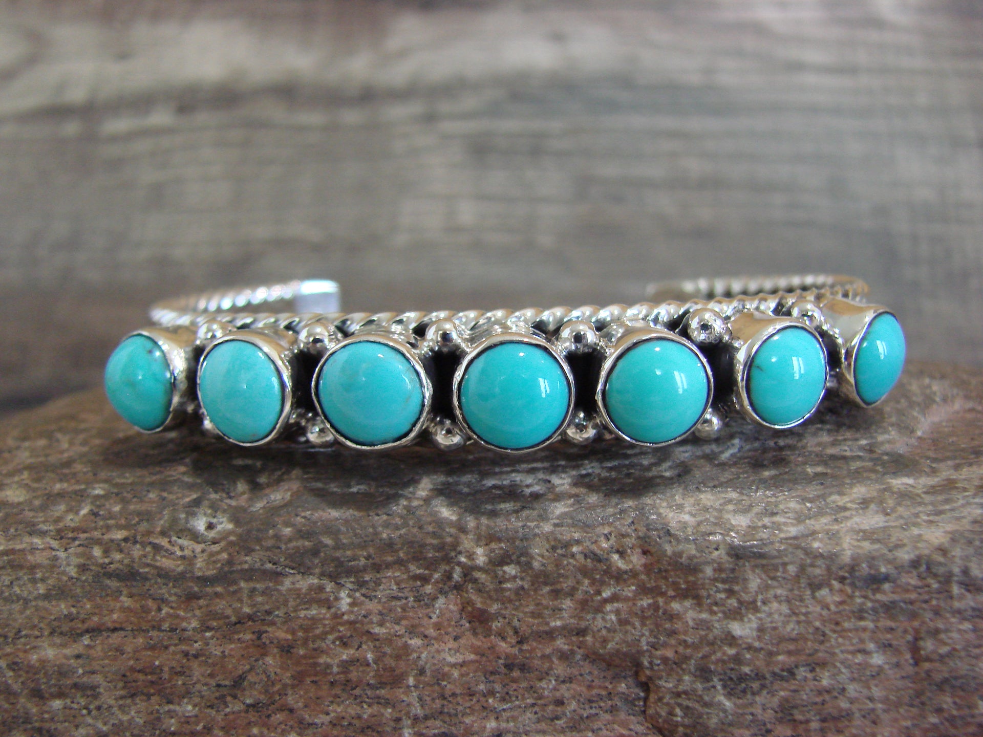 Genuine Native American Navajo Indian Sterling Silver & Turquoise Row Bracelet from Western New Mexico. This Stunning bracelet features a Single Row of beautiful high quality, Genuine, Turquoise stones intricately set into Smooth Sterling Silver bezel settings. Sterling Silver Details surround the stones. Fine Navajo Silversmith workmanship quality makes this bracelet a beautiful hand made masterpiece! Navajo Indian handmade by Sheena Jack. Stamped "Sterling" on the inner cuff. Free Gift Box and Shipping included!
