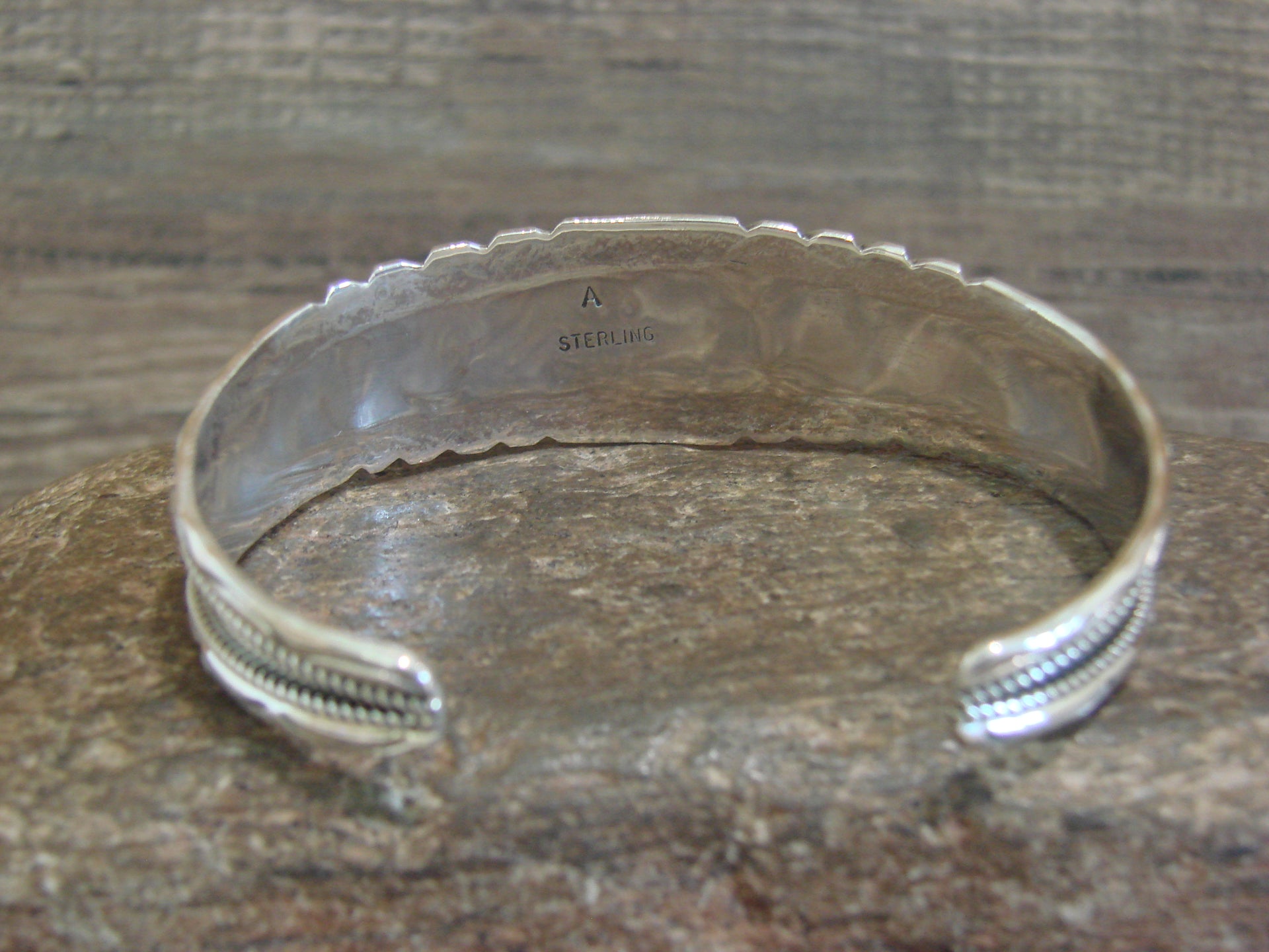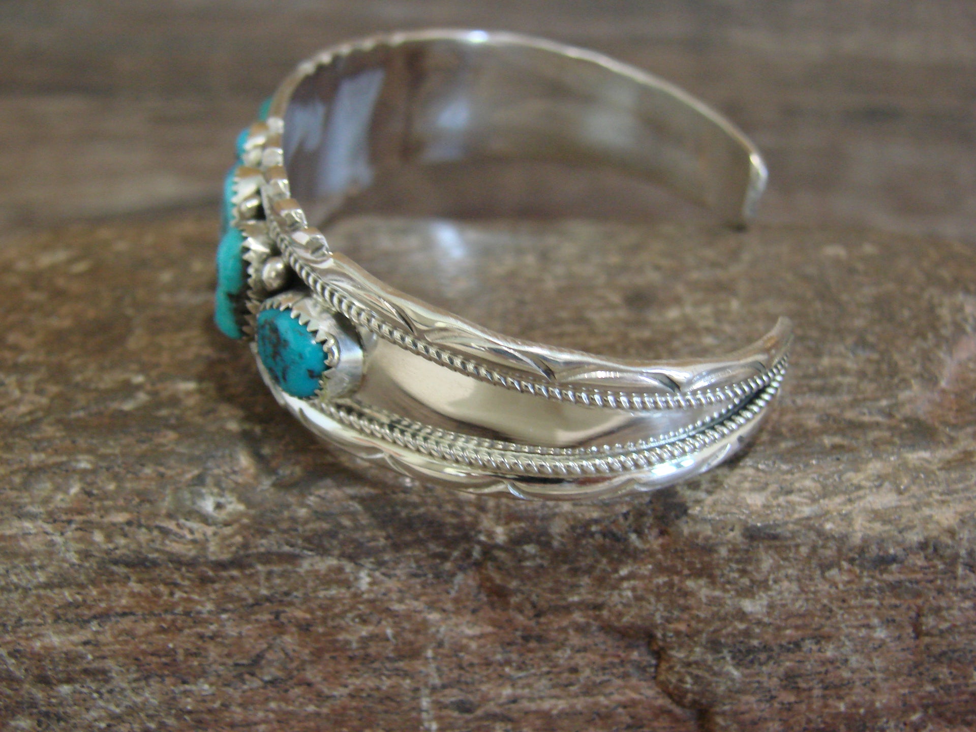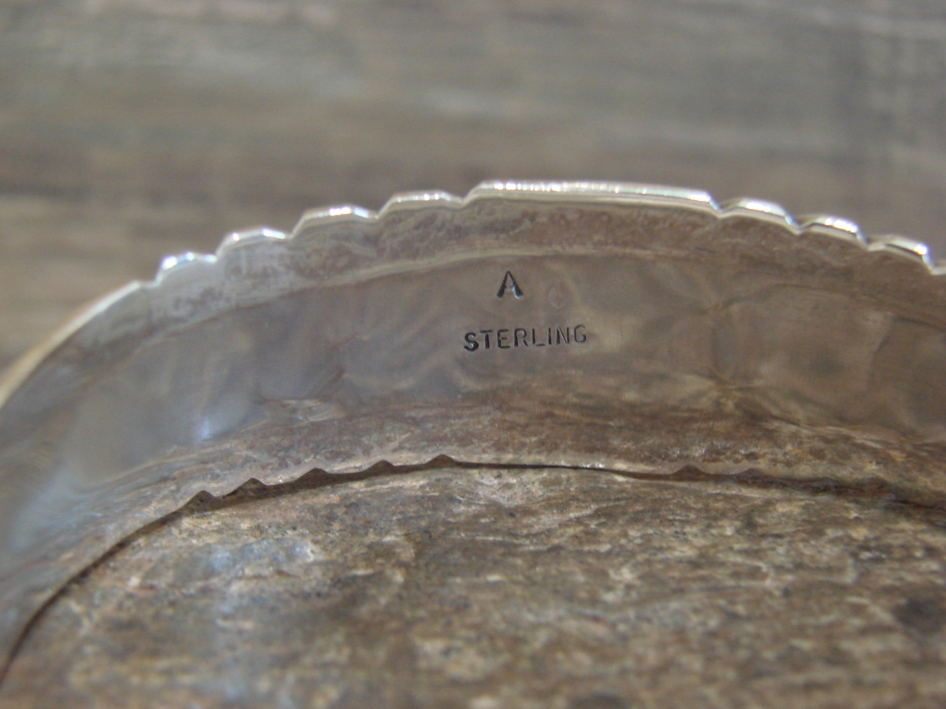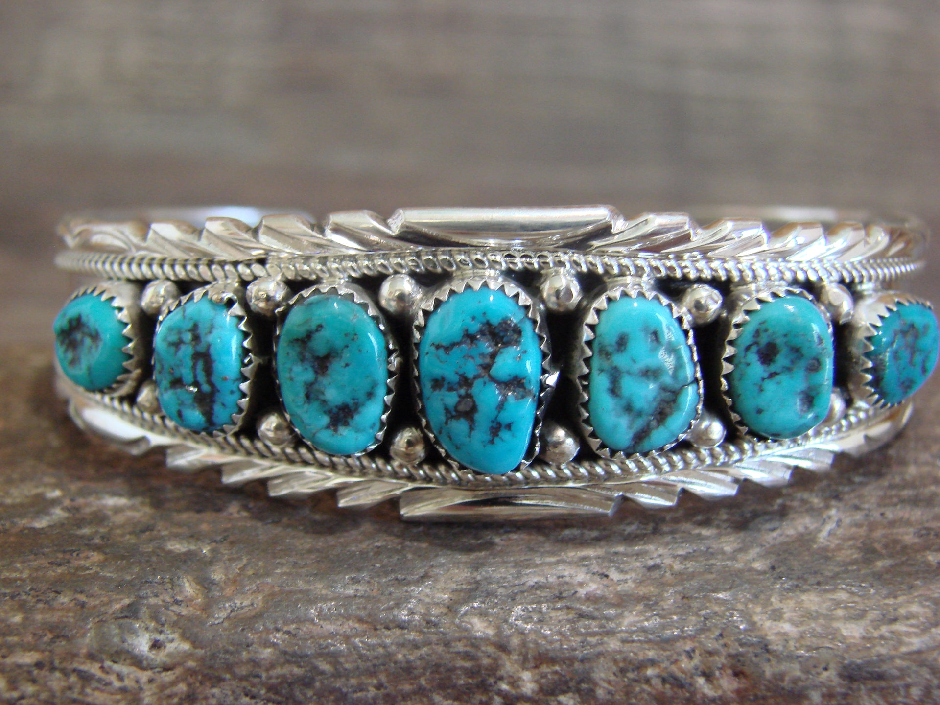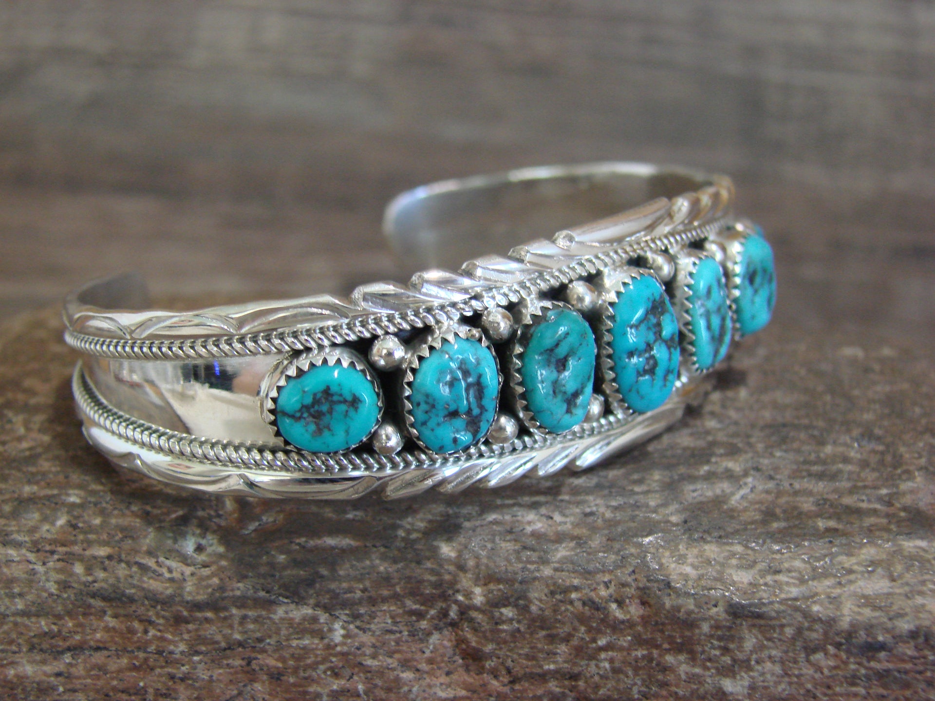 Genuine Native American Navajo Indian Sterling Silver & Turquoise Bracelet from Western New Mexico. This Stunning bracelet features a Single Row of beautiful high quality, Genuine, Turquoise stones intricately set into Crown Sterling Silver bezel settings. Hand Stamping and Sterling Silver Details surround the stones. Fine Navajo Silversmith workmanship quality makes this bracelet a beautiful hand made masterpiece! Navajo Indian handmade by Anita White Goat. Signed "A". Stamped "Sterling" on the back. Free gift box and shipping included!