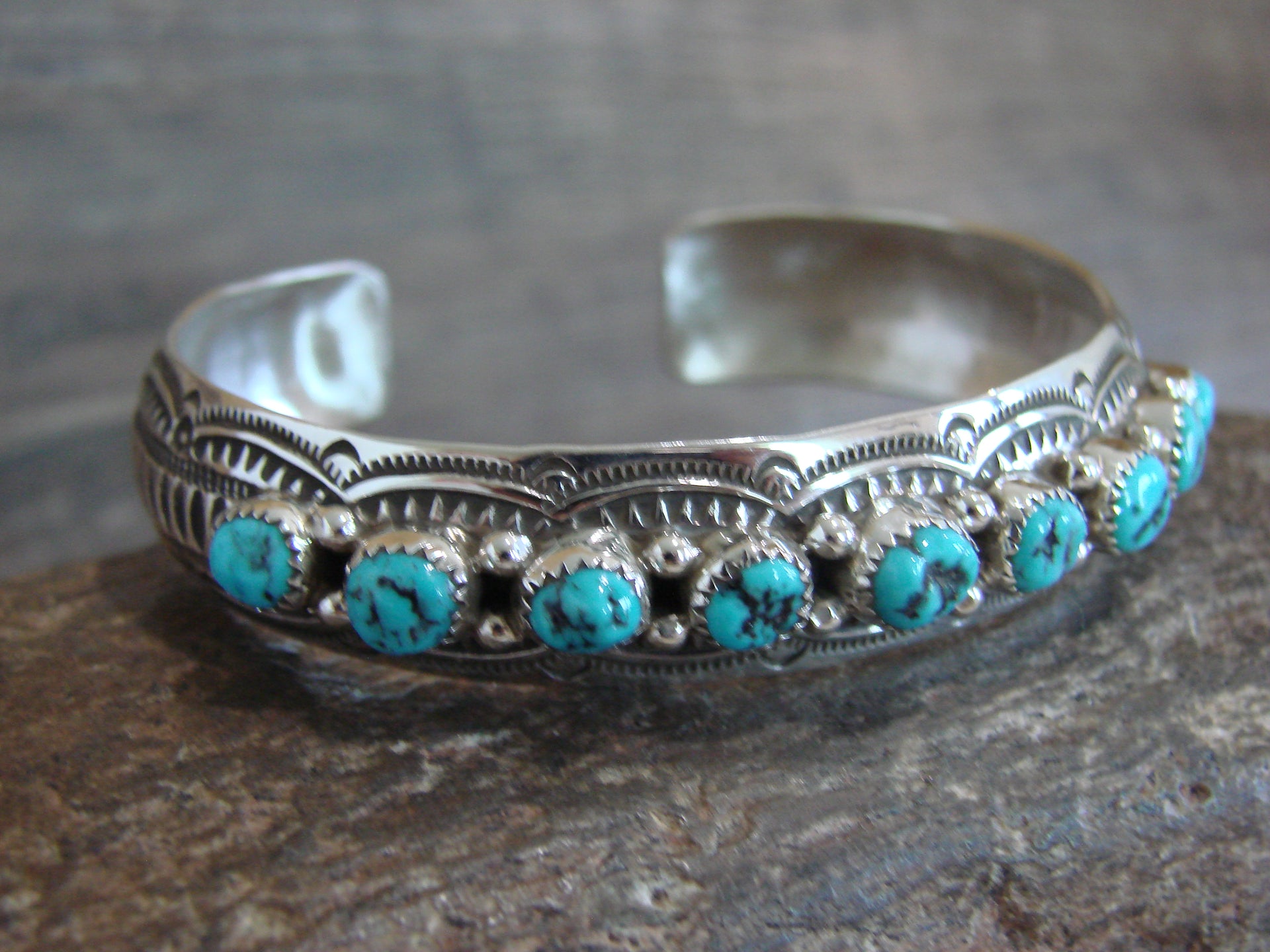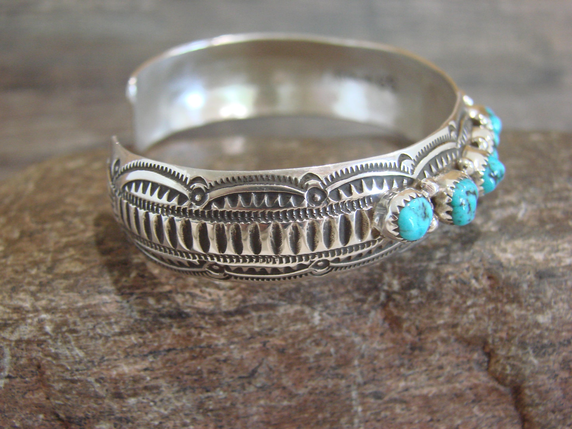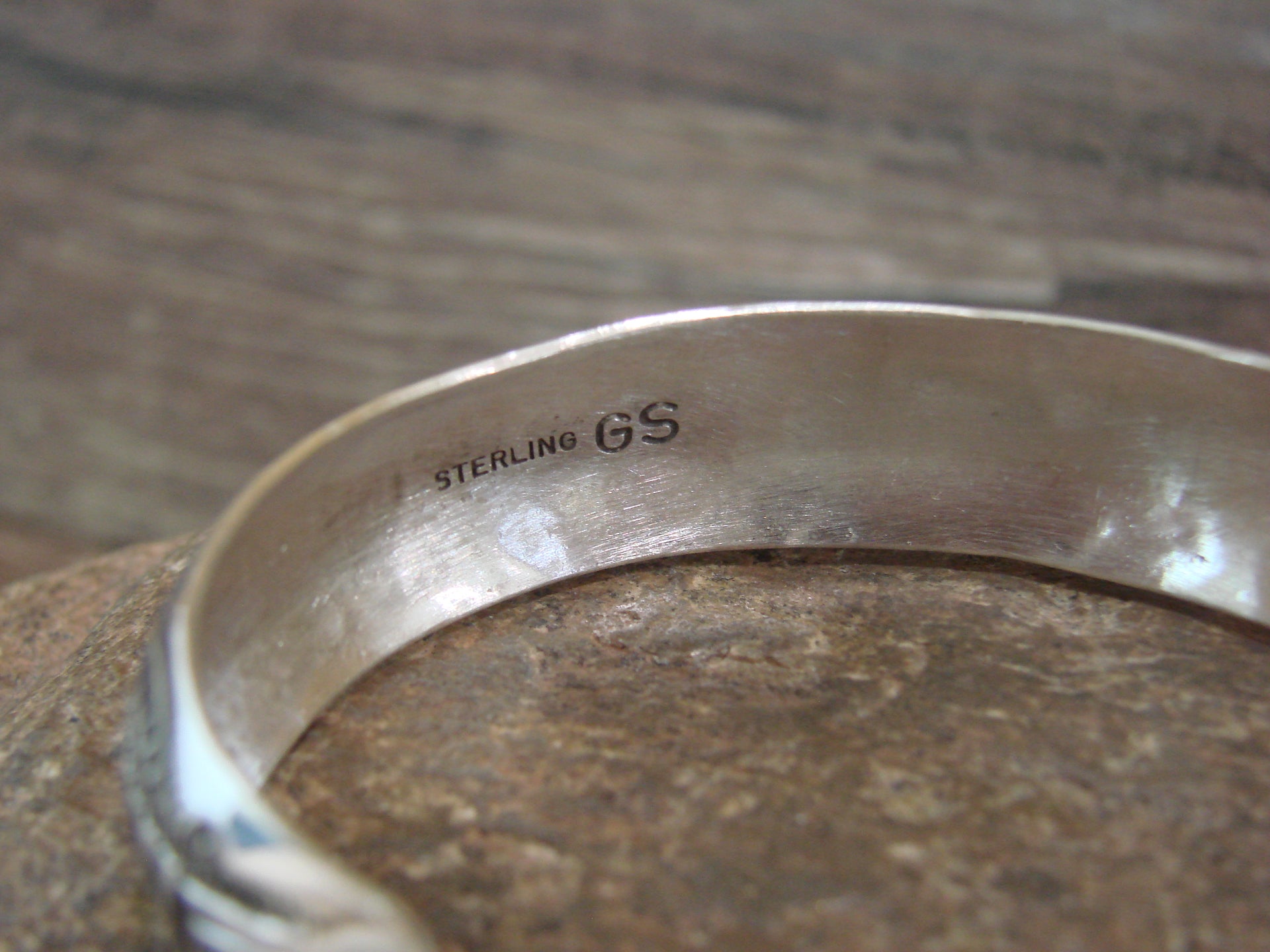 Genuine Native American Navajo Indian Sterling Silver & Turquoise Bracelet Cuff from Western New Mexico. This Stunning bracelet features a Single Row of beautiful high quality, Genuine, Turquoise stones intricately set into Crown Sterling Silver bezel settings. Hand Stamping and Sterling Silver Details surround the stones. Fine Navajo Silversmith workmanship quality makes this bracelet a beautiful hand made masterpiece! Navajo Indian handmade and Signed "GS". Stamped "Sterling" on the back. Free gift box and shipping included!