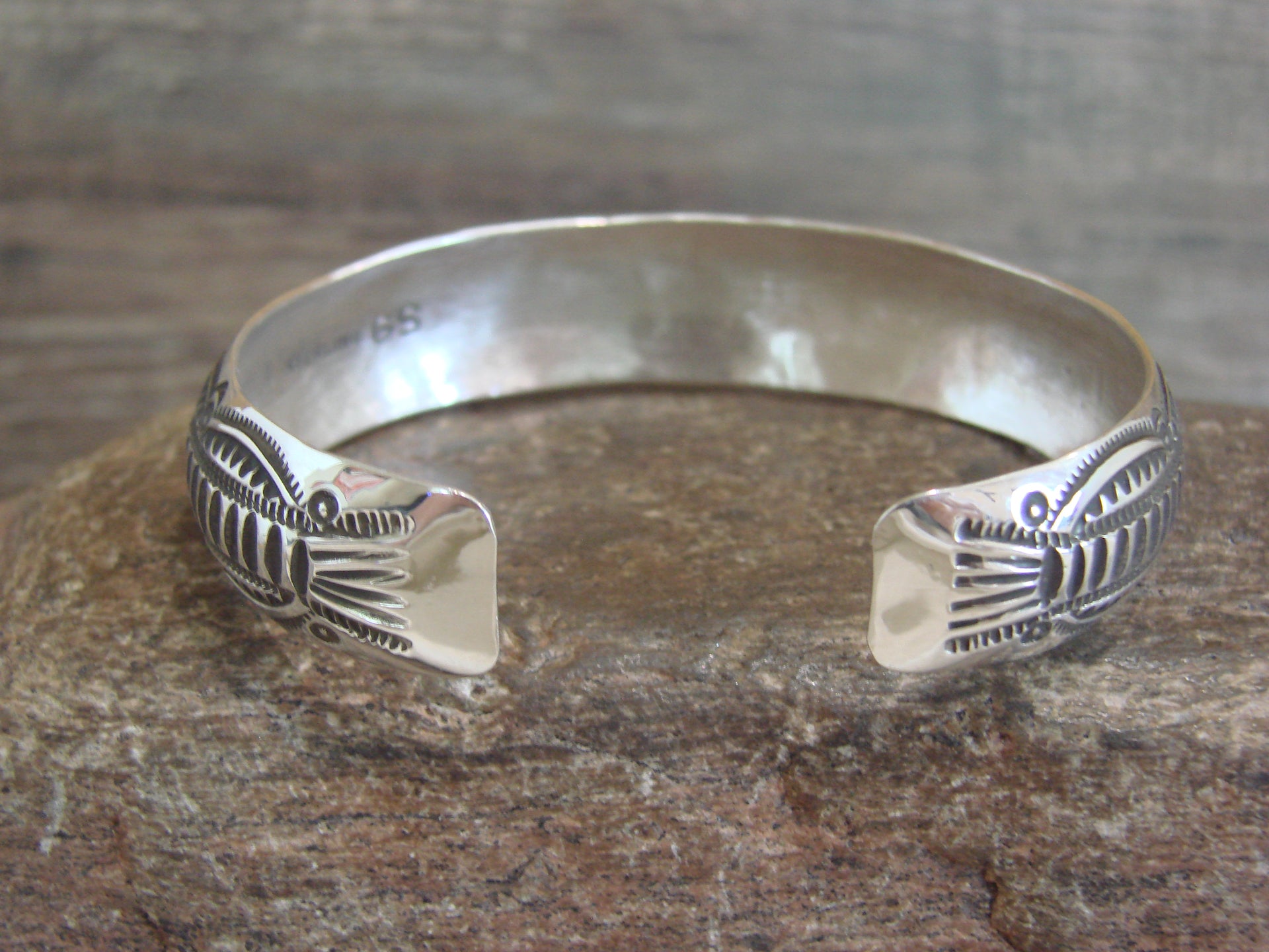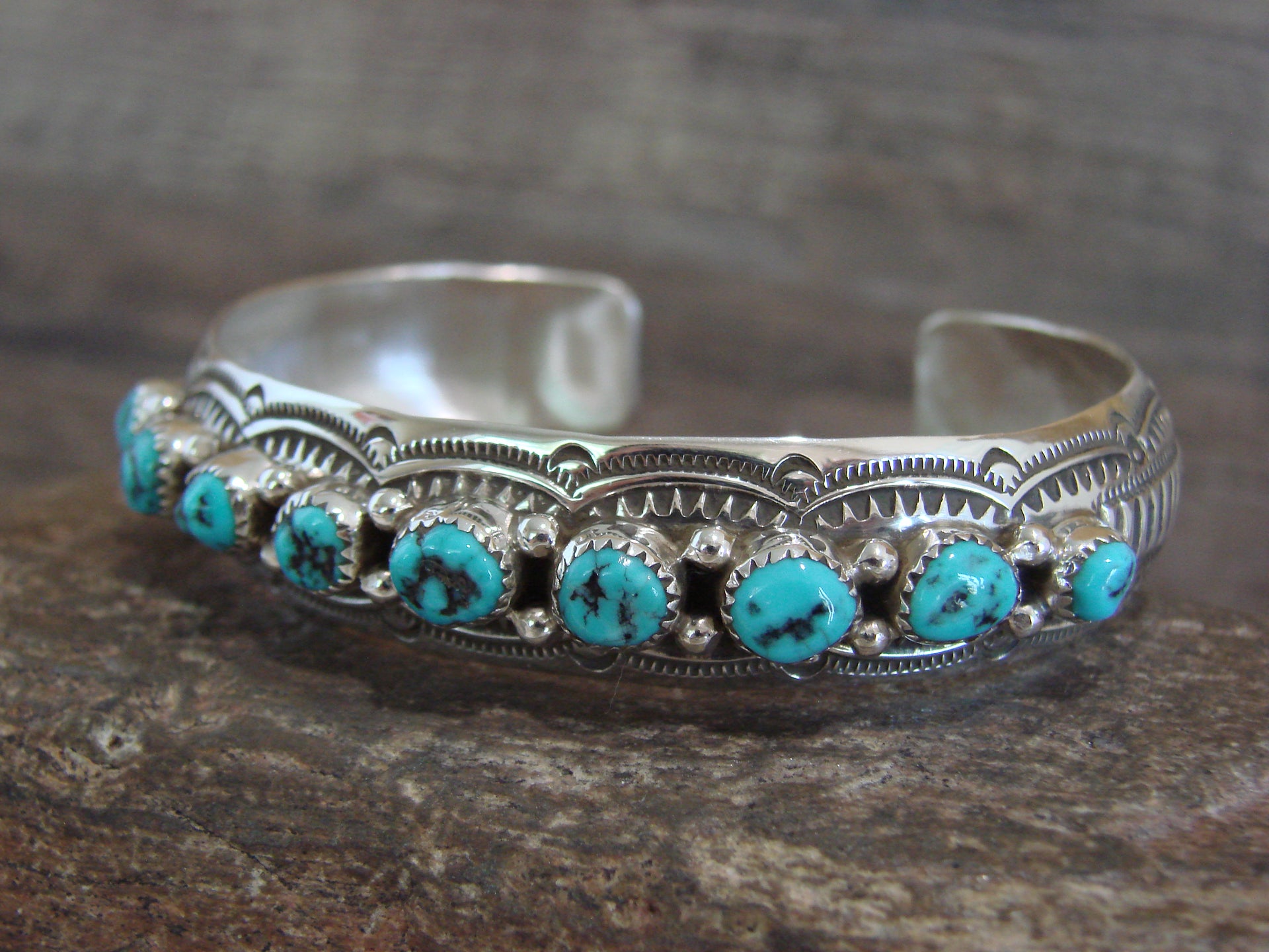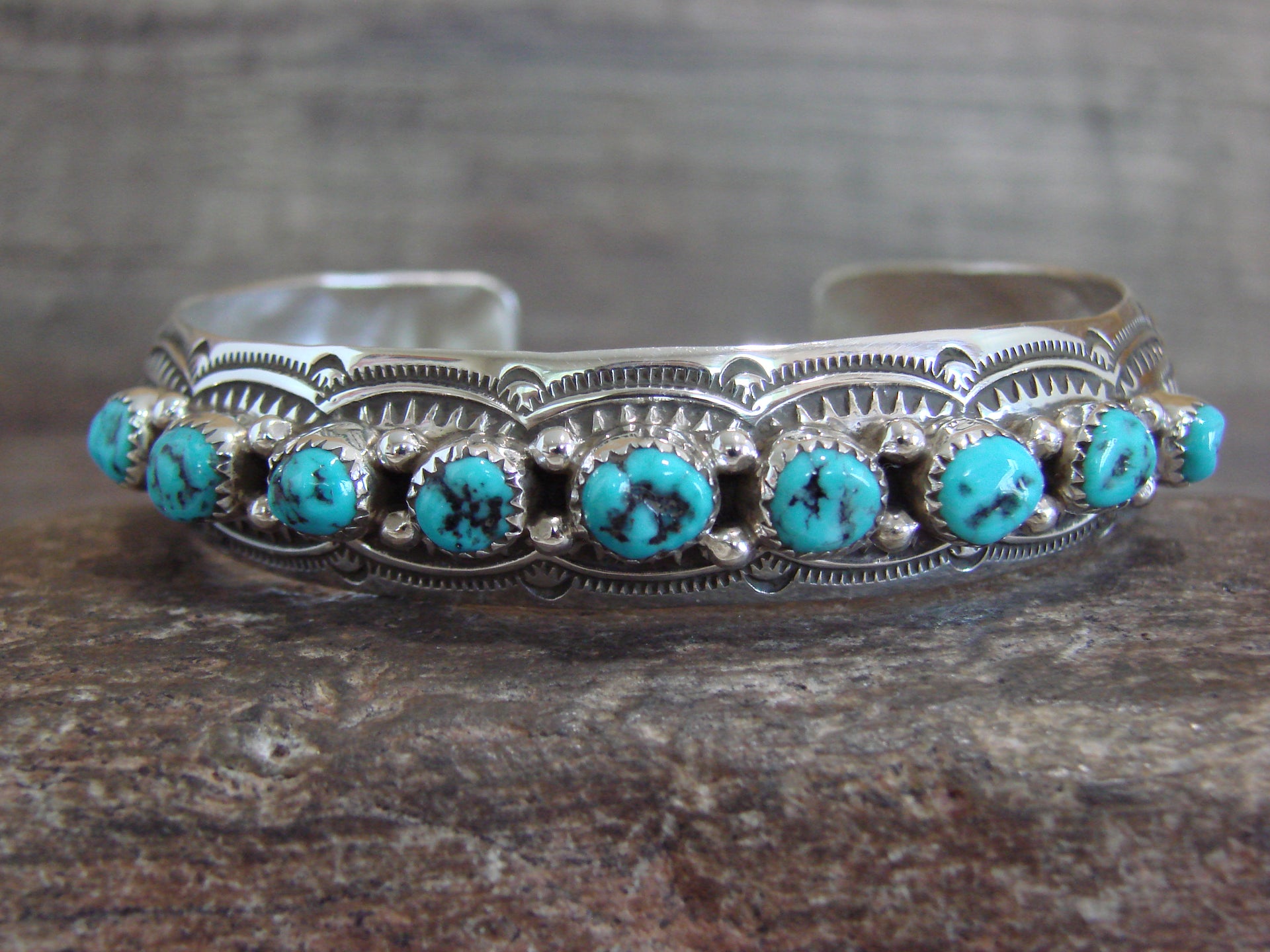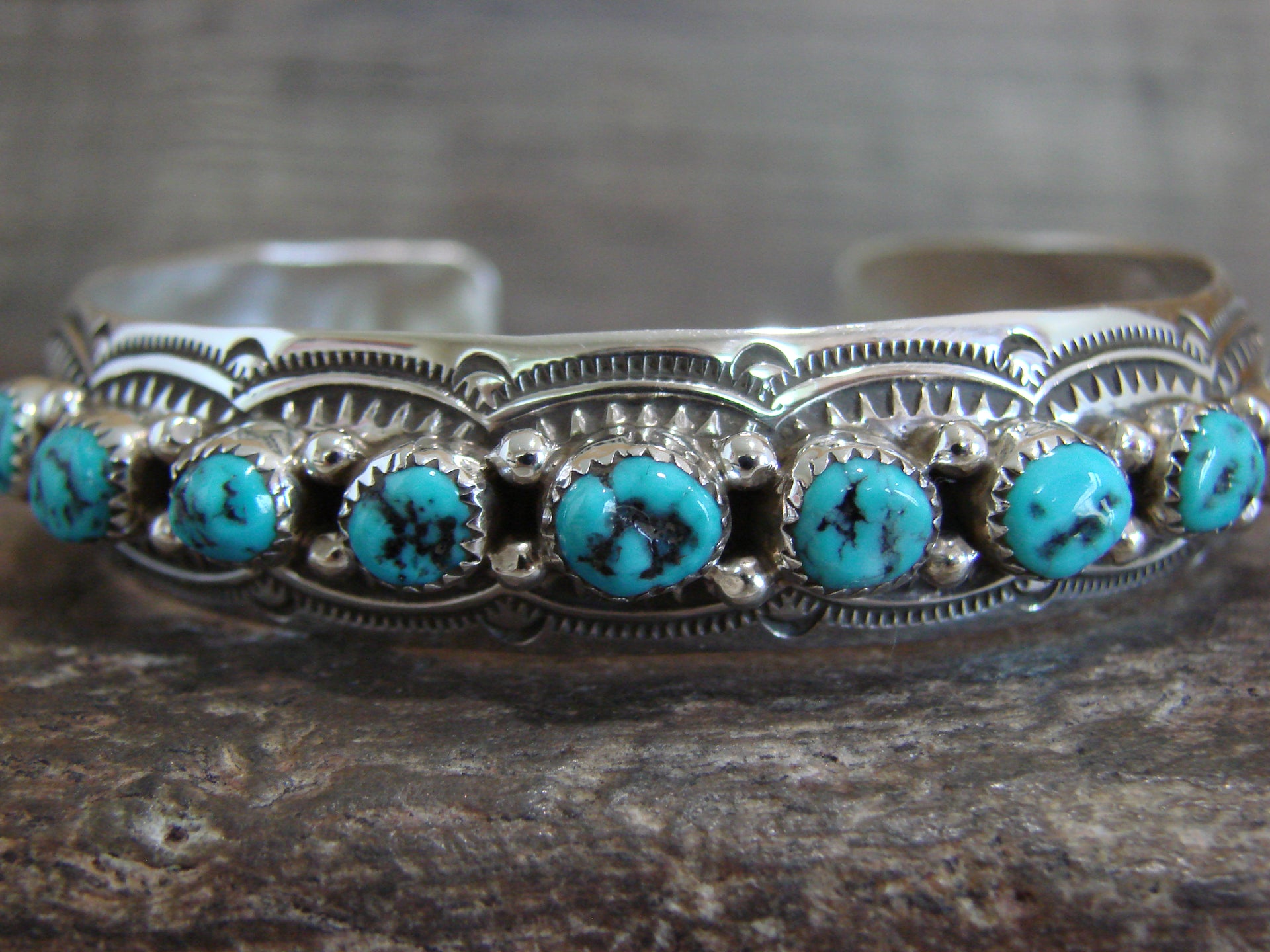 Genuine Native American Navajo Indian Sterling Silver & Turquoise Bracelet Cuff from Western New Mexico. This Stunning bracelet features a Single Row of beautiful high quality, Genuine, Turquoise stones intricately set into Crown Sterling Silver bezel settings. Hand Stamping and Sterling Silver Details surround the stones. Fine Navajo Silversmith workmanship quality makes this bracelet a beautiful hand made masterpiece! Navajo Indian handmade and Signed "GS". Stamped "Sterling" on the back. Free gift box and shipping included!