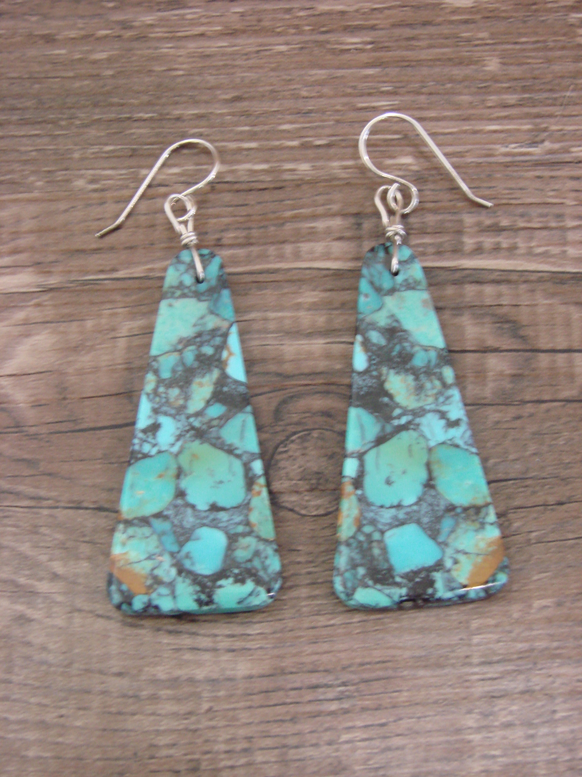 Genuine Native American Navajo Indian Handmade Sterling Silver & Turquoise Slab Earrings from Western New Mexico. These large earrings feature Genuine Turquoise stones. The stone is cut into a slab and has beautiful matrix throughout. Hand Made by Navajo Silversmith Ella Mae Garcia. Free Shipping and gift box included!