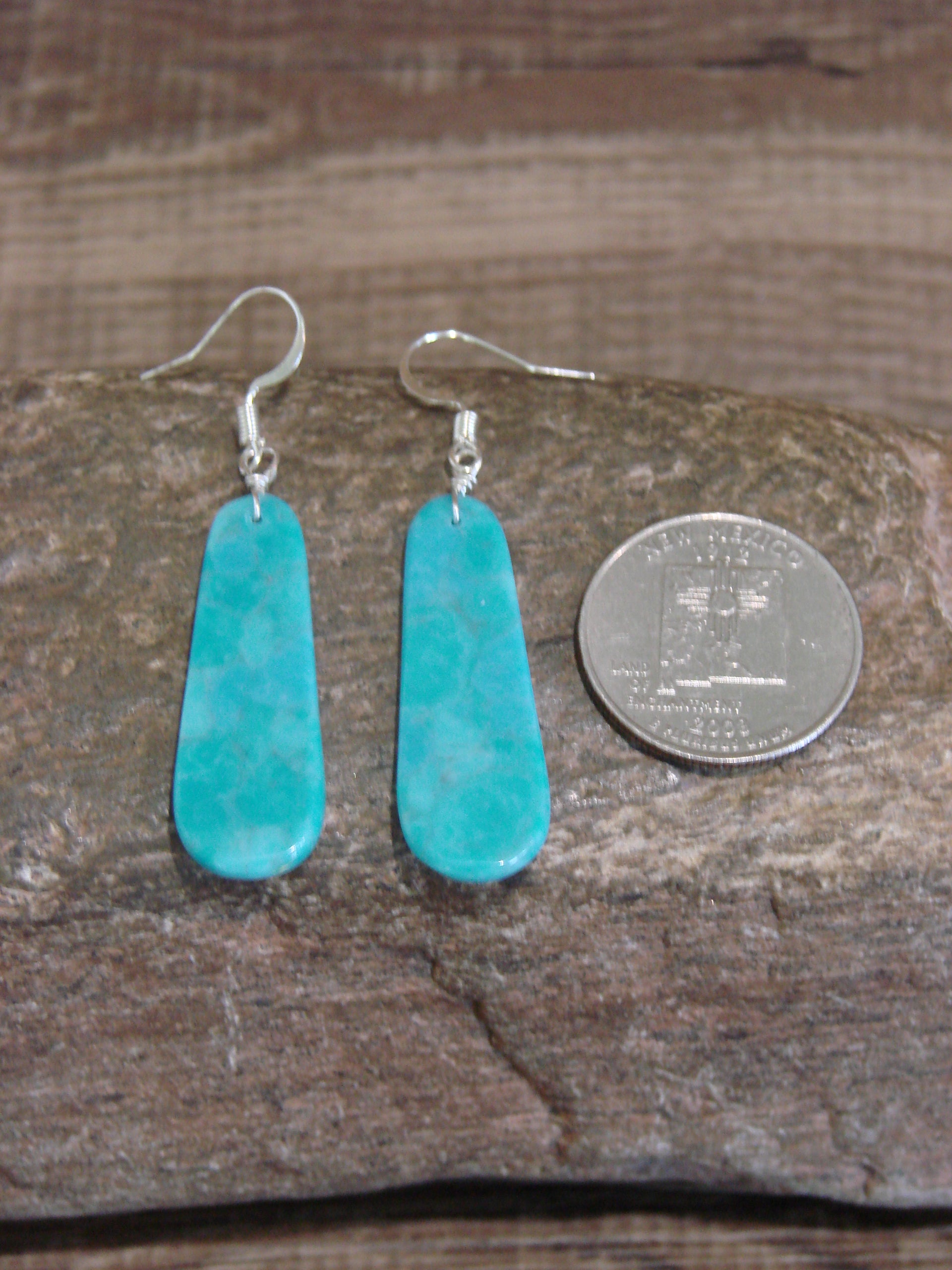 Native American Navajo Indian Handmade Sterling Silver & Turquoise Slab Earrings from Western New Mexico. These large earrings feature a man made Turquoise stone. The stone is cut into a slab and has beautiful matrix throughout. Hand Made by Navajo Silversmith Ella Mae Garcia. Free Shipping and gift box included!