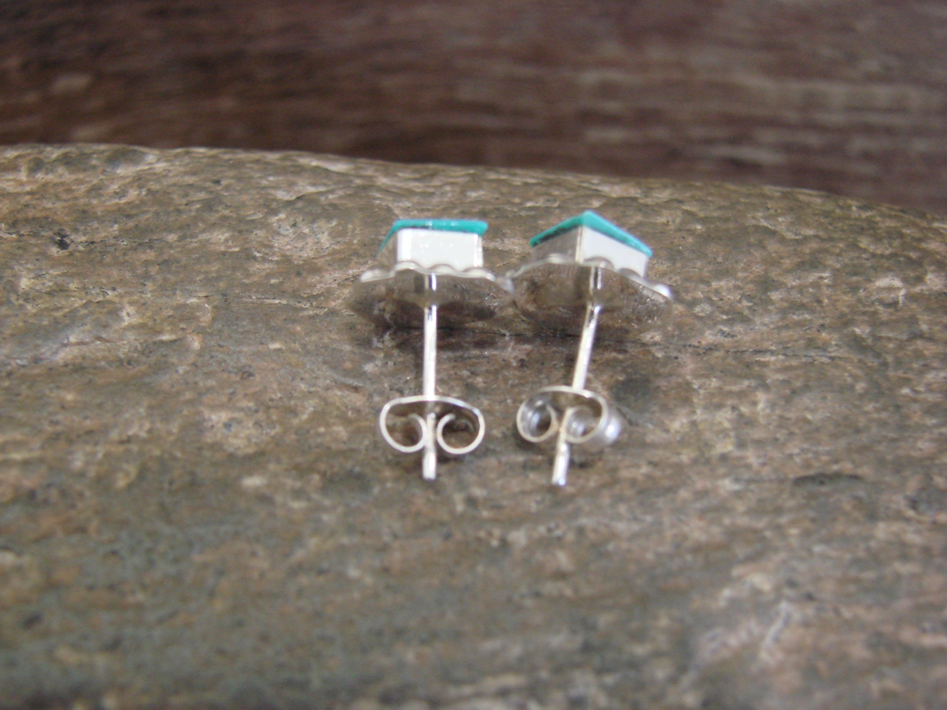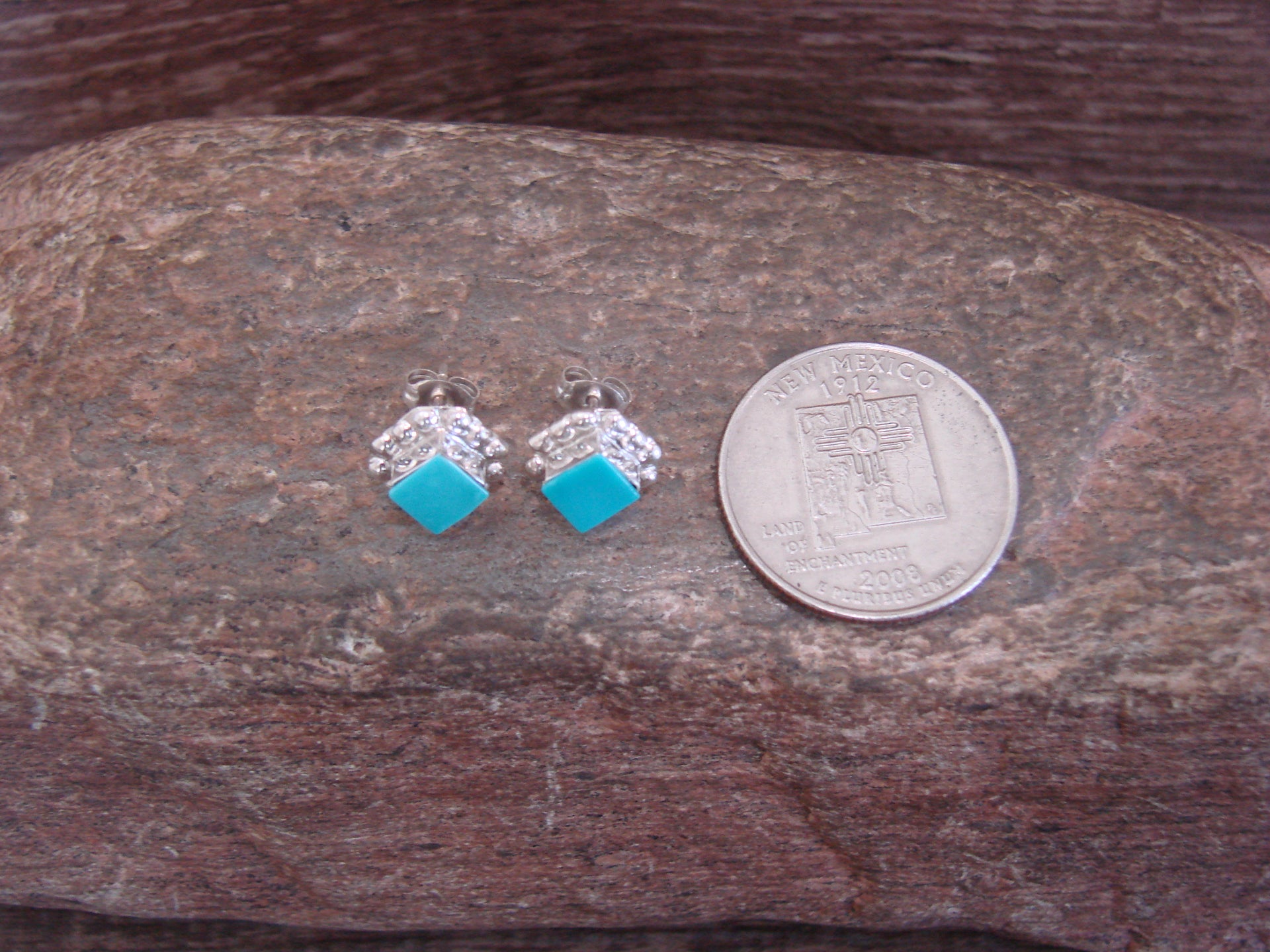 Native American Zuni Indian Turquoise Stud Post Earrings from Western New Mexico. These earrings feature a Beautiful Turquoise stone on each earring set into a smooth Sterling Silver bezel. Surrounding the stones are stunning details in Sterling Silver! Handmade Zuni Indian jewelry by Dustin Bobelu. Free Shipping and Gift Box included!
