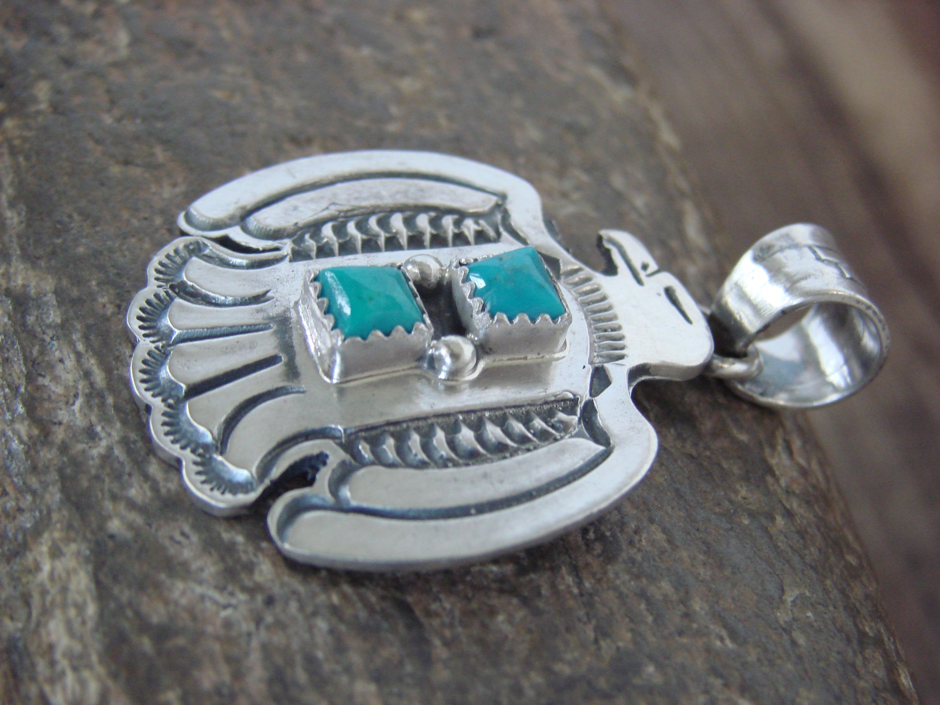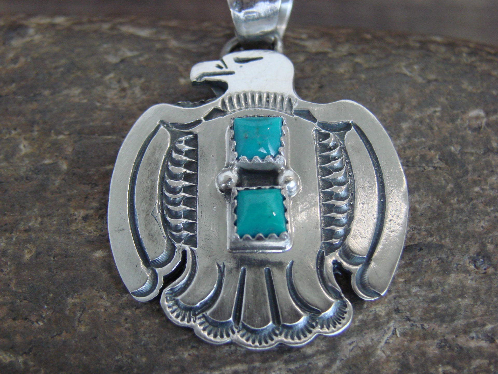 Genuine Native American Navajo Indian Sterling Silver & Turquoise Thunderbird Pendant from Western New Mexico. This beautiful Thunderbird is hand cut from Sterling Silver and features stunning traditional hand stamping throughout. The Genuine Turquoise stones are securely set into crown Sterling Silver bezel settings. Handmade by Robinson Martinez. Hallmarked on back. Free gift box and shipping included!