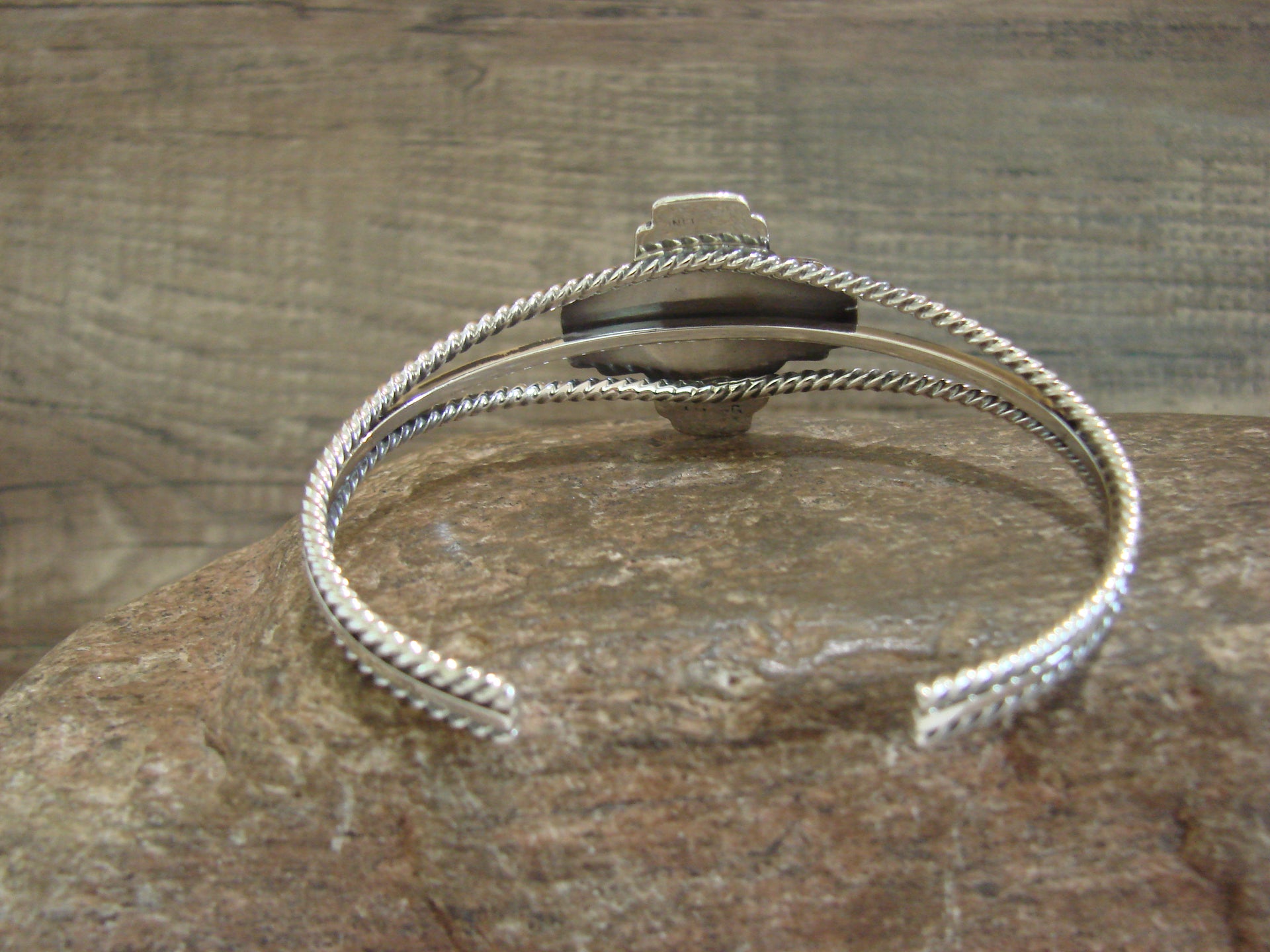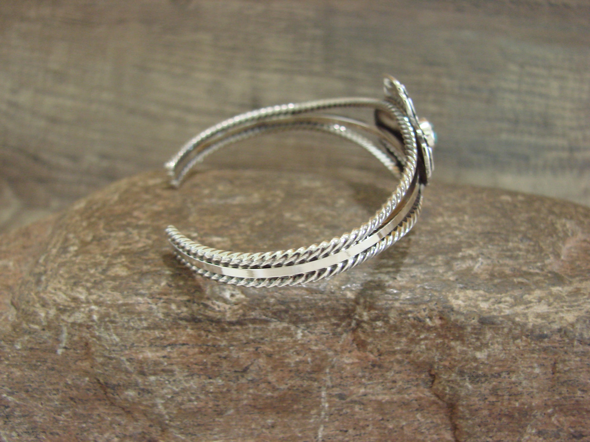 Native American Navajo Indian Sterling Silver & Turquoise Zia Bracelet from Western New Mexico. This bracelet features a genuine Turquoise stone set into a crown sterling silver Zia setting. Beautiful Hand Stamping and Sterling Silver details surround the stone. The back is unsigned, tested and authenticated. Hand Crafted by Navajo Silversmith Adrienne Gordon. Free shipping with a gift box included!