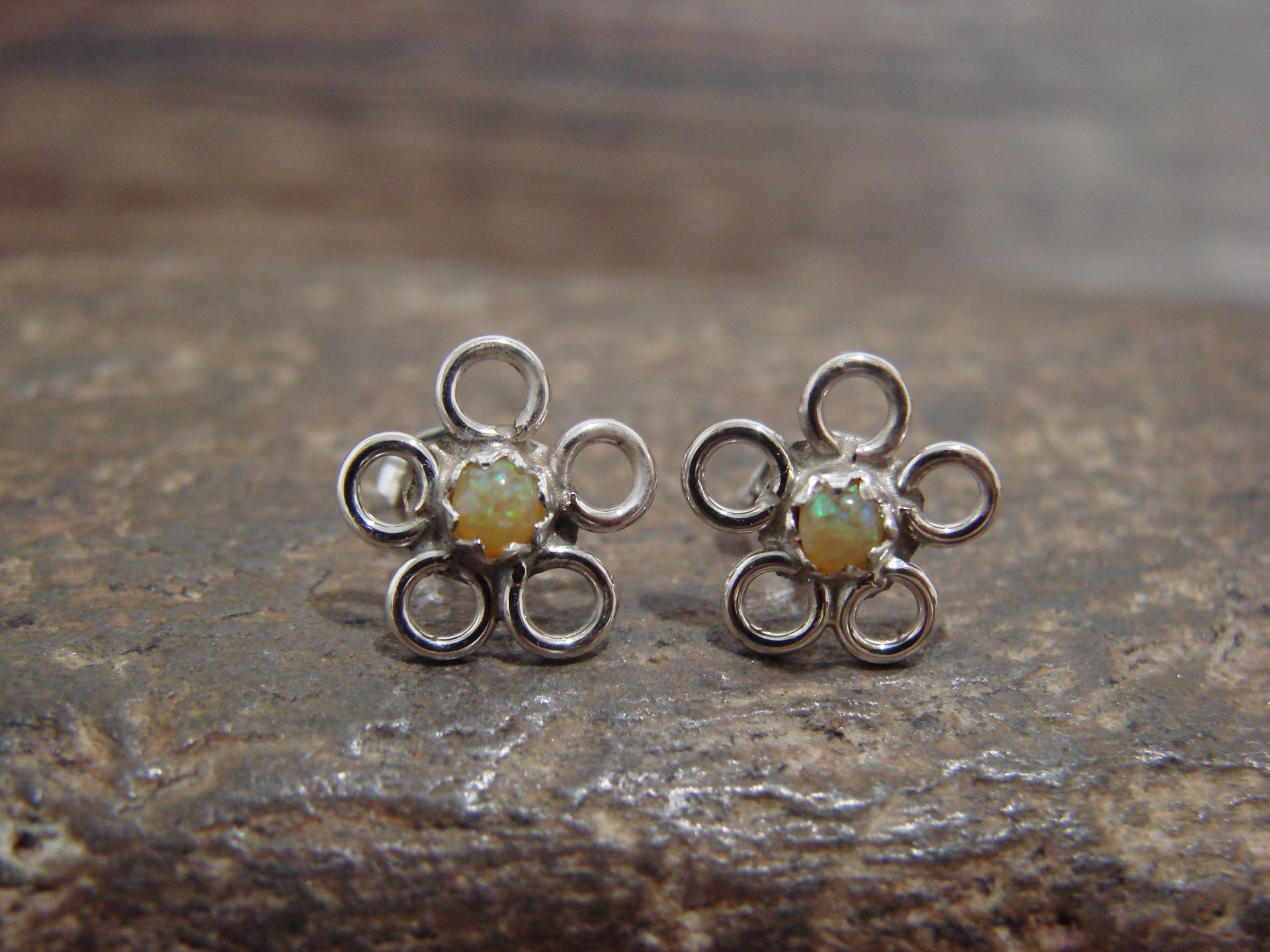 Native American Zuni Indian Sterling Silver & Yellow Opal Floral Stud Post Earrings from Western New Mexico. These stunning earrings feature beautiful Lab Opal Stones set into a crown Sterling Silver Flower setting. These earrings are gorgeous! Zuni Indian hand made by Ronald Yatsattie. Unsigned. Free shipping and gift box included!