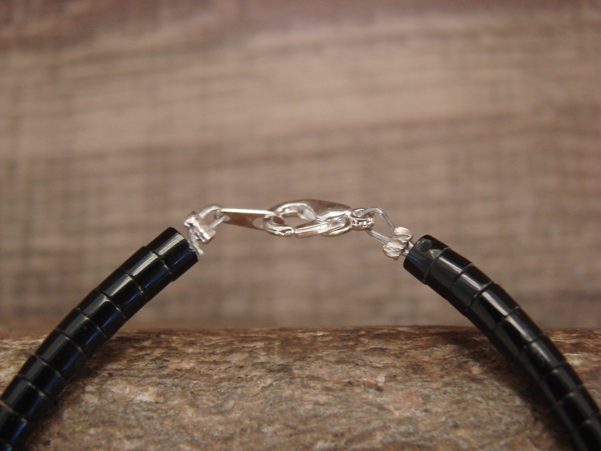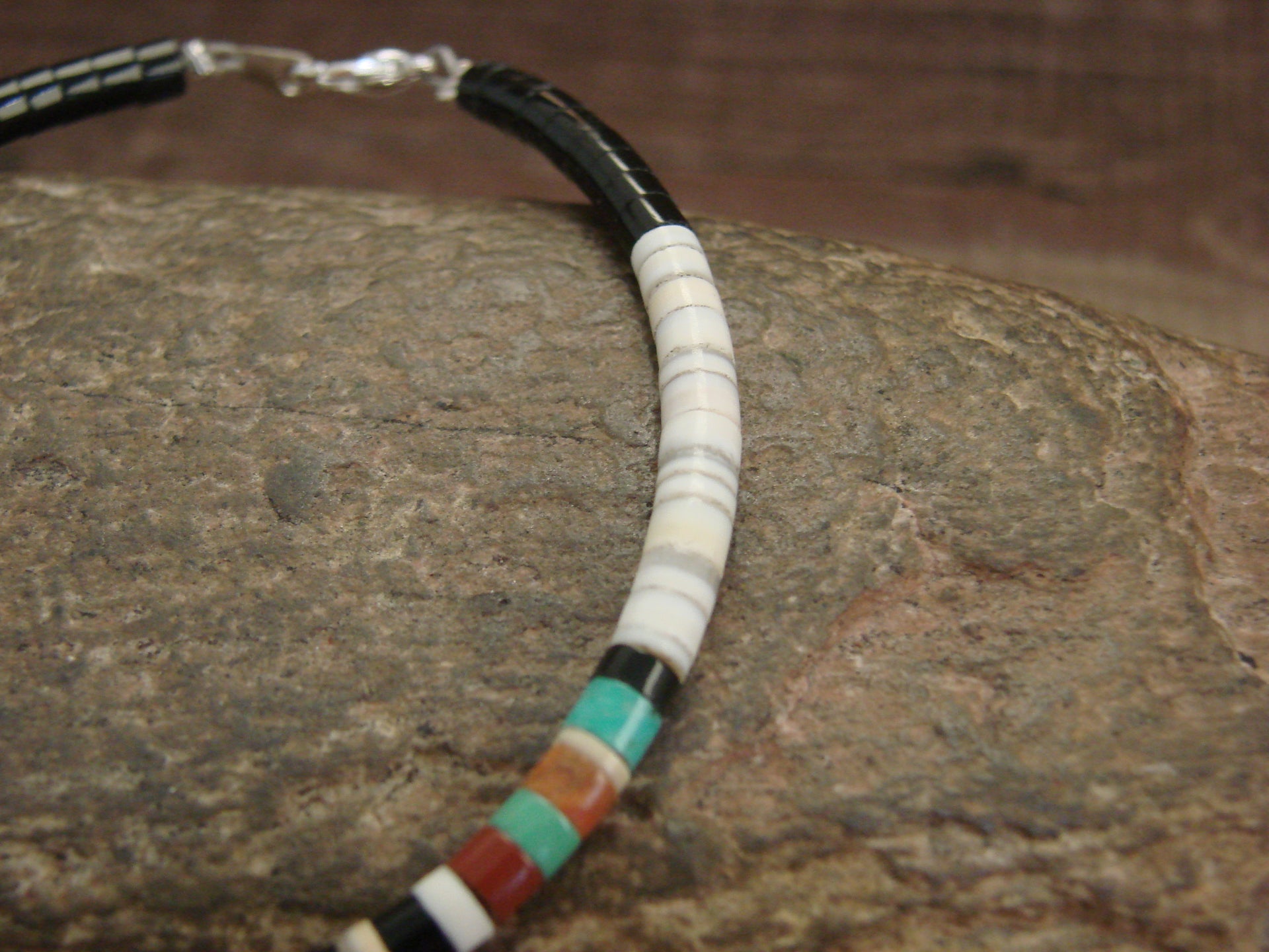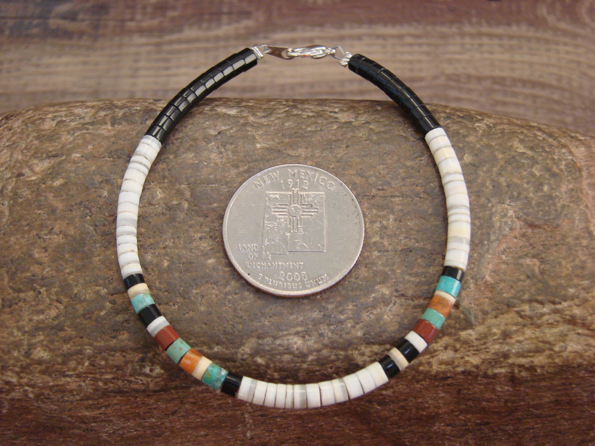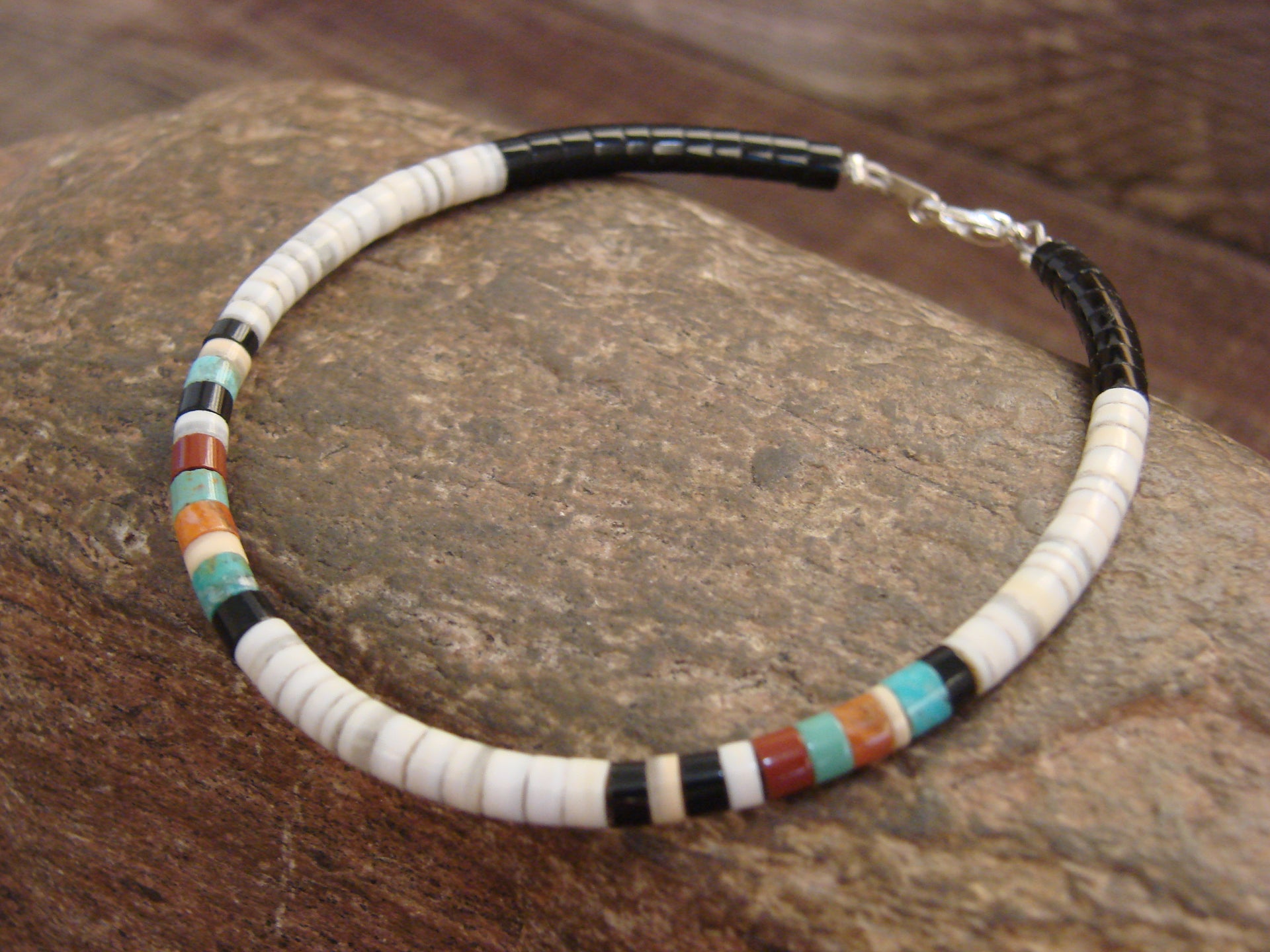 Native American Santo Domingo Indian White Shell Heishi Bracelet from Western New Mexico. This necklace features a variety of polished Heishi Shell Stones throughout. The Stones are center drilled and measure 3/16" in diameter. This Bracelet is hand strung and topped with a silver clasp. Fits wrist size 6" - 7". This is a stunning bracelet! Handmade by Santo Domingo artist J. Calabaza. Free Shipping and gift box included!