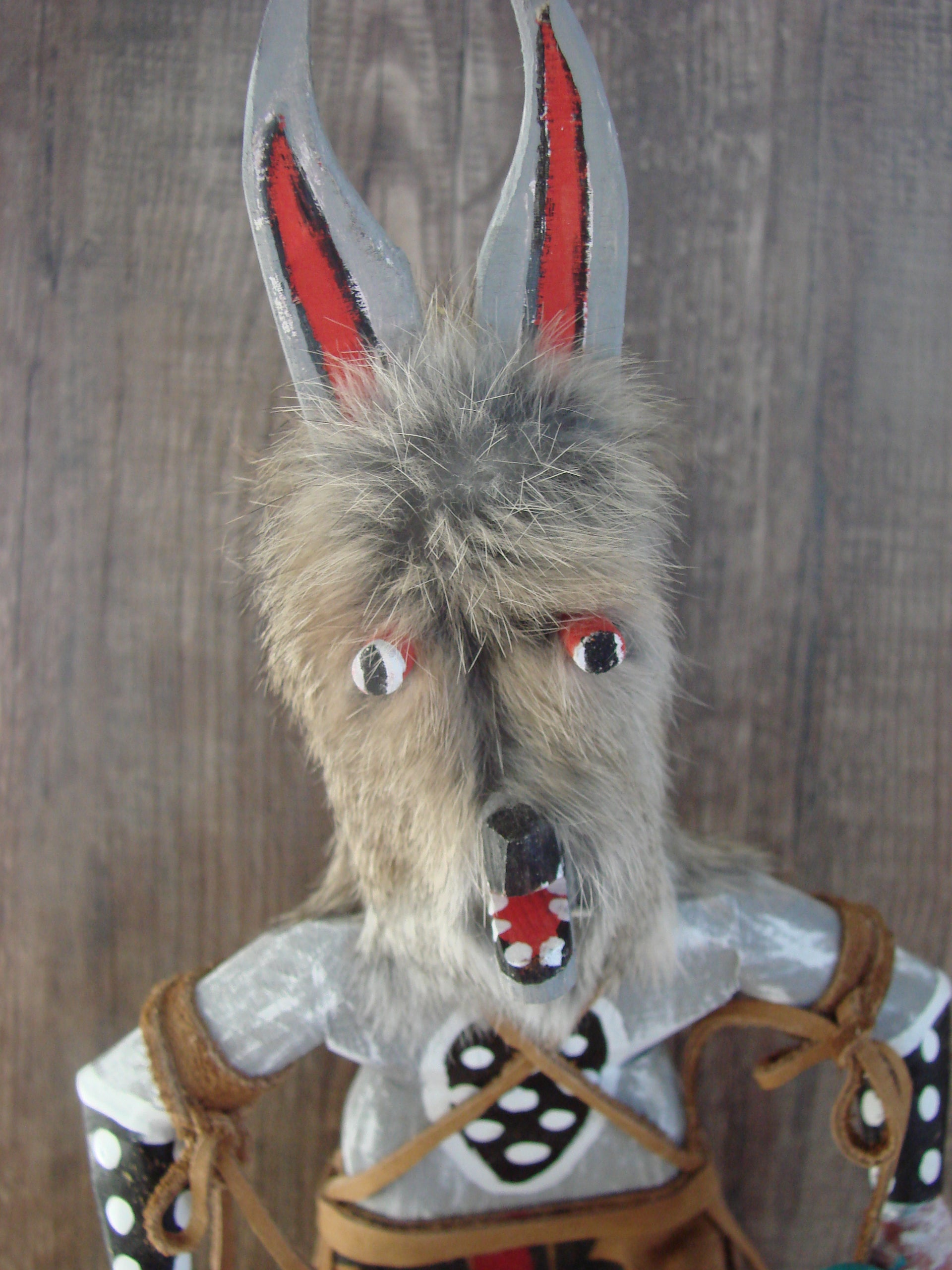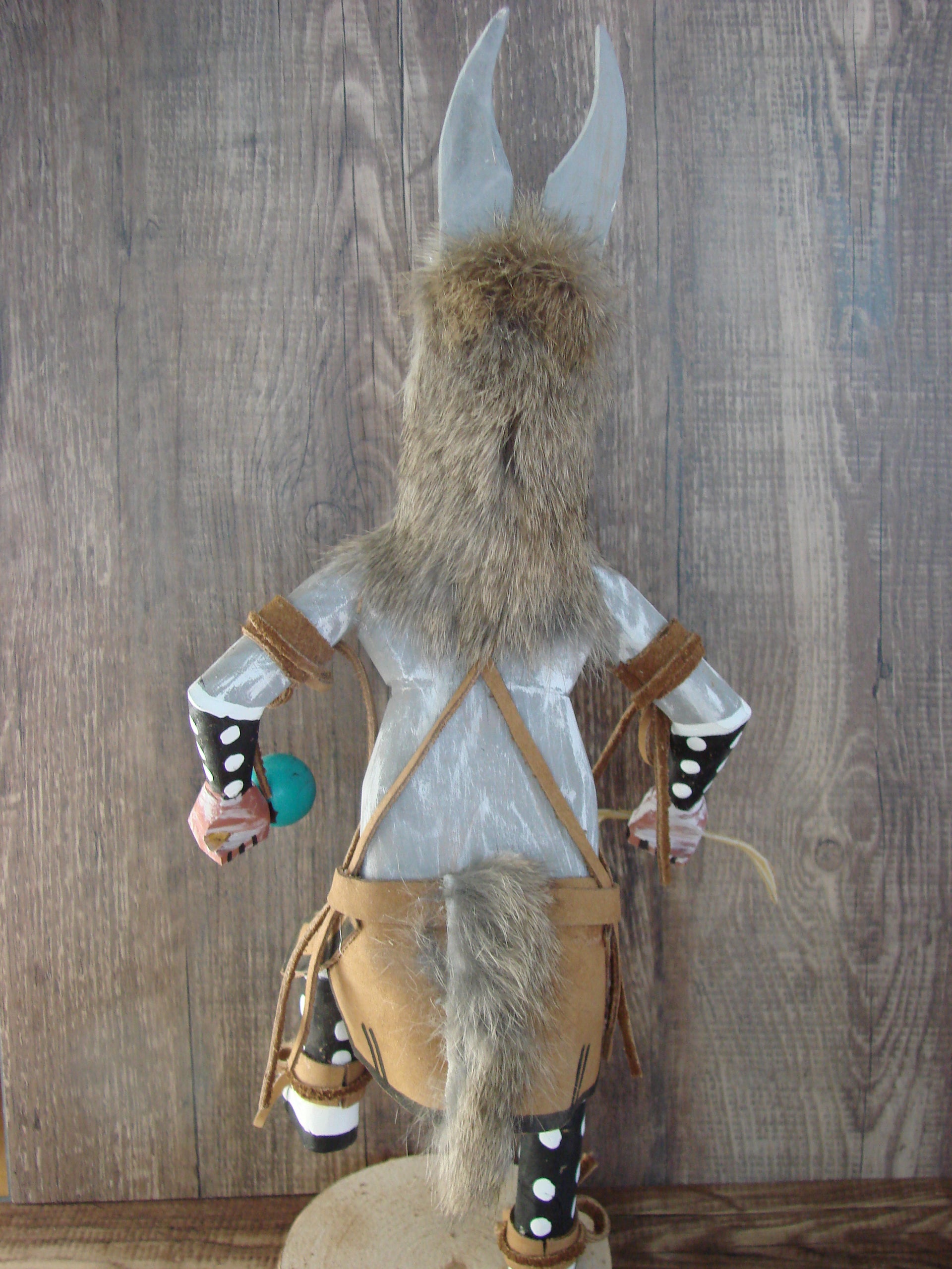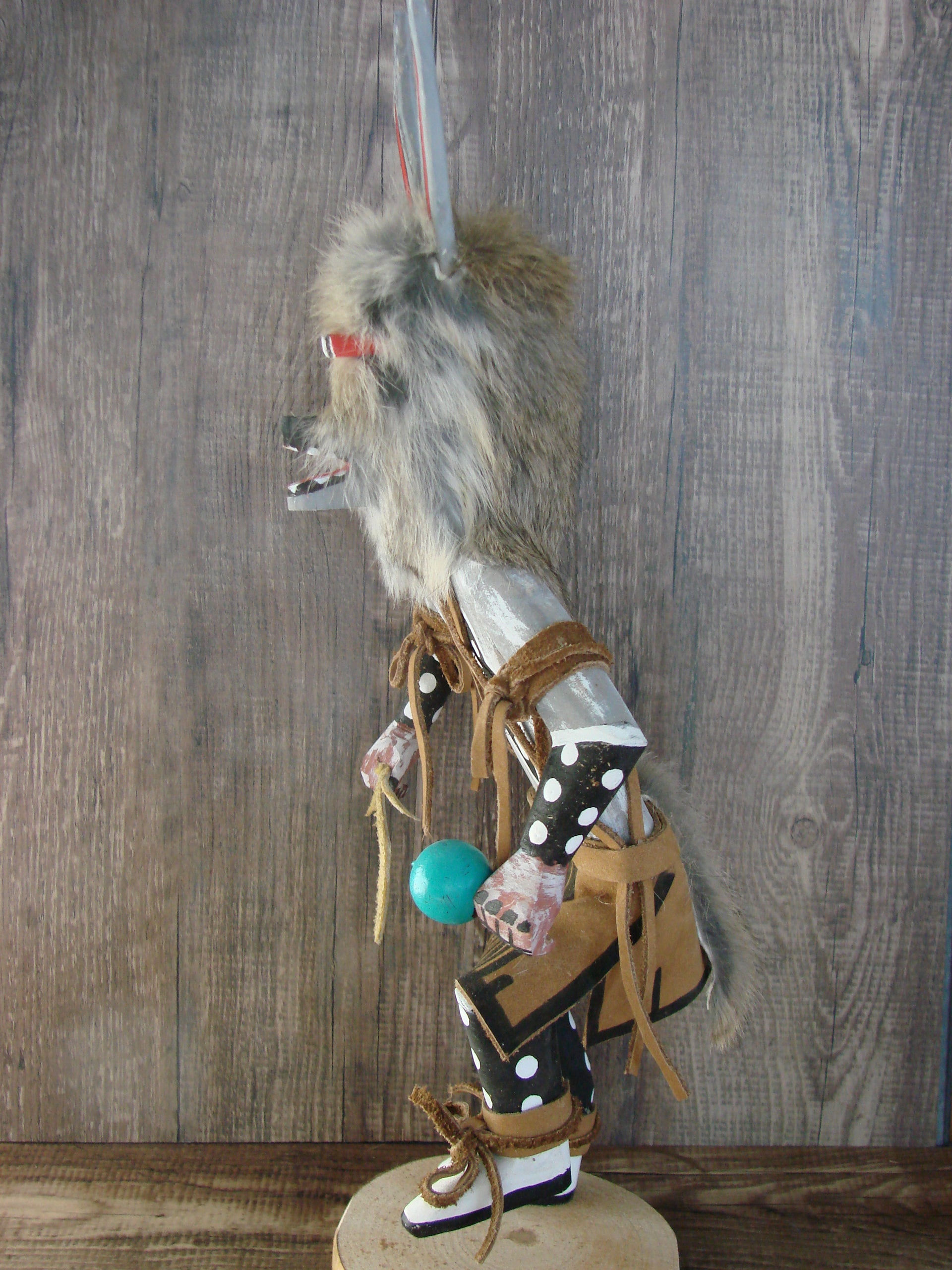 Native American Navajo Indian Kachina Dancer from the Navajo Nation. This Kachina features beautiful hand painting and hand carving from top to bottom. This Kachina is carved into pine and decorated with feathers, Rabbit Fur, and leather. Navajo Indian Handmade and Signed by Randy Tsosie on the base. Free shipping included!