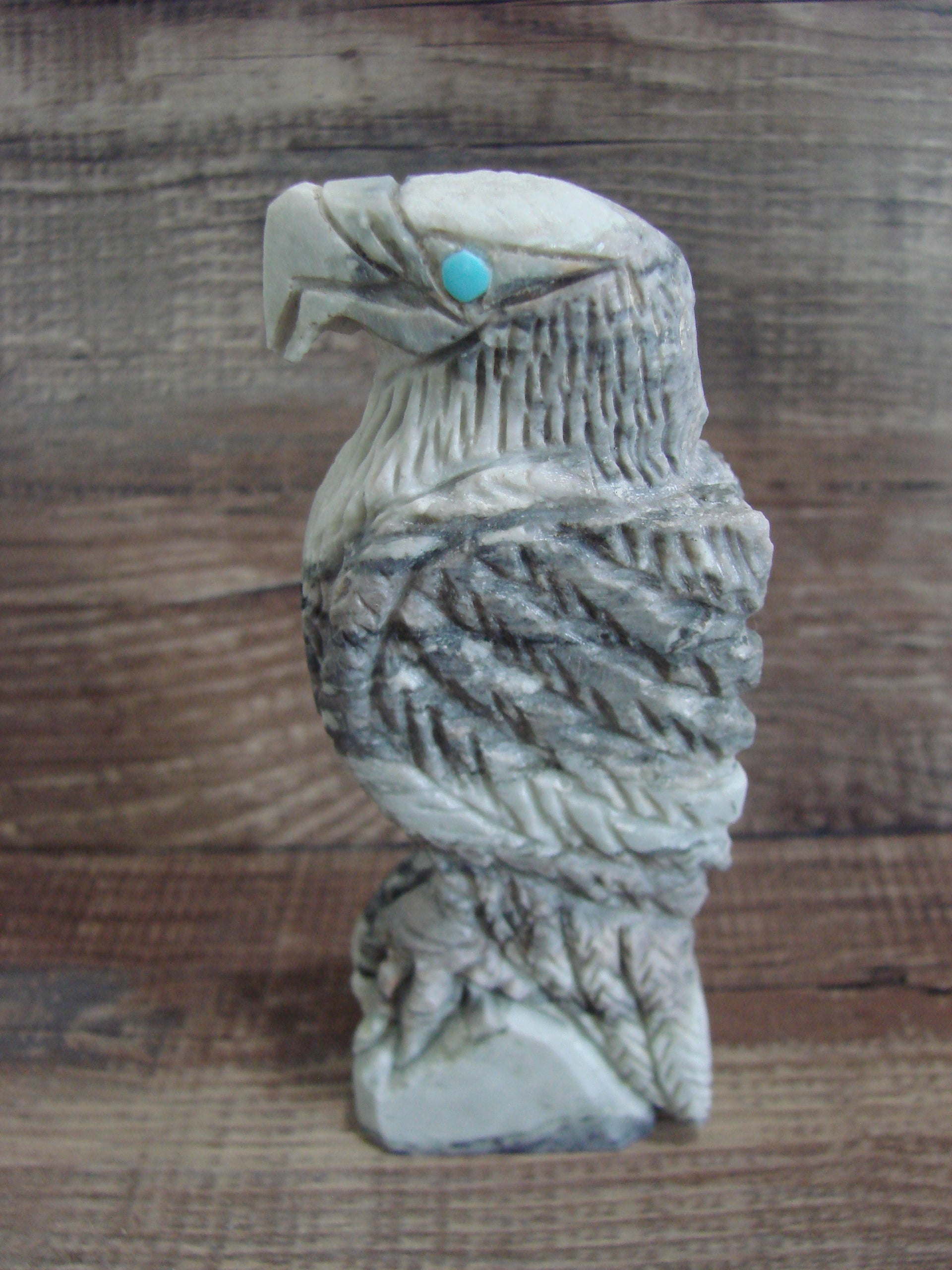 Genuine Native American Zuni Indian Hand Carved Eagle Fetish from the Zuni Pueblo in Western New Mexico. This Stunning Fetish is Hand Carved out of a beautiful piece of Picasso Marble. Turquoise is used for the eyes. This is a unique and stunning piece! Handmade by the Zuni carver Jon Quam. Signed on the bottom. Free Shipping included!