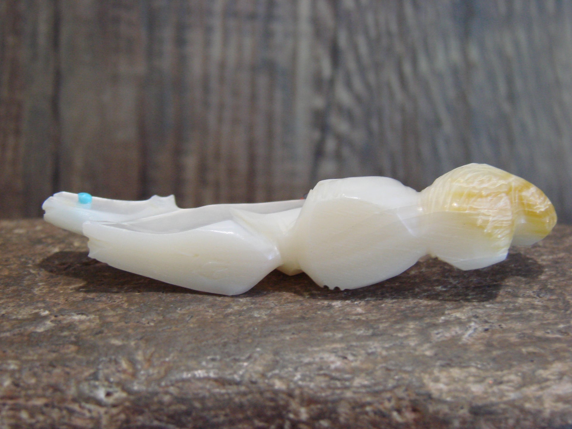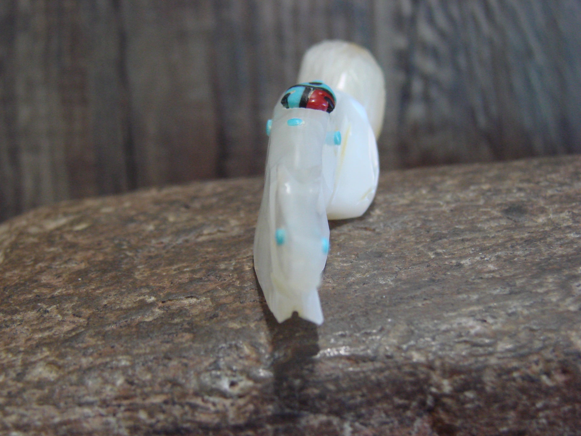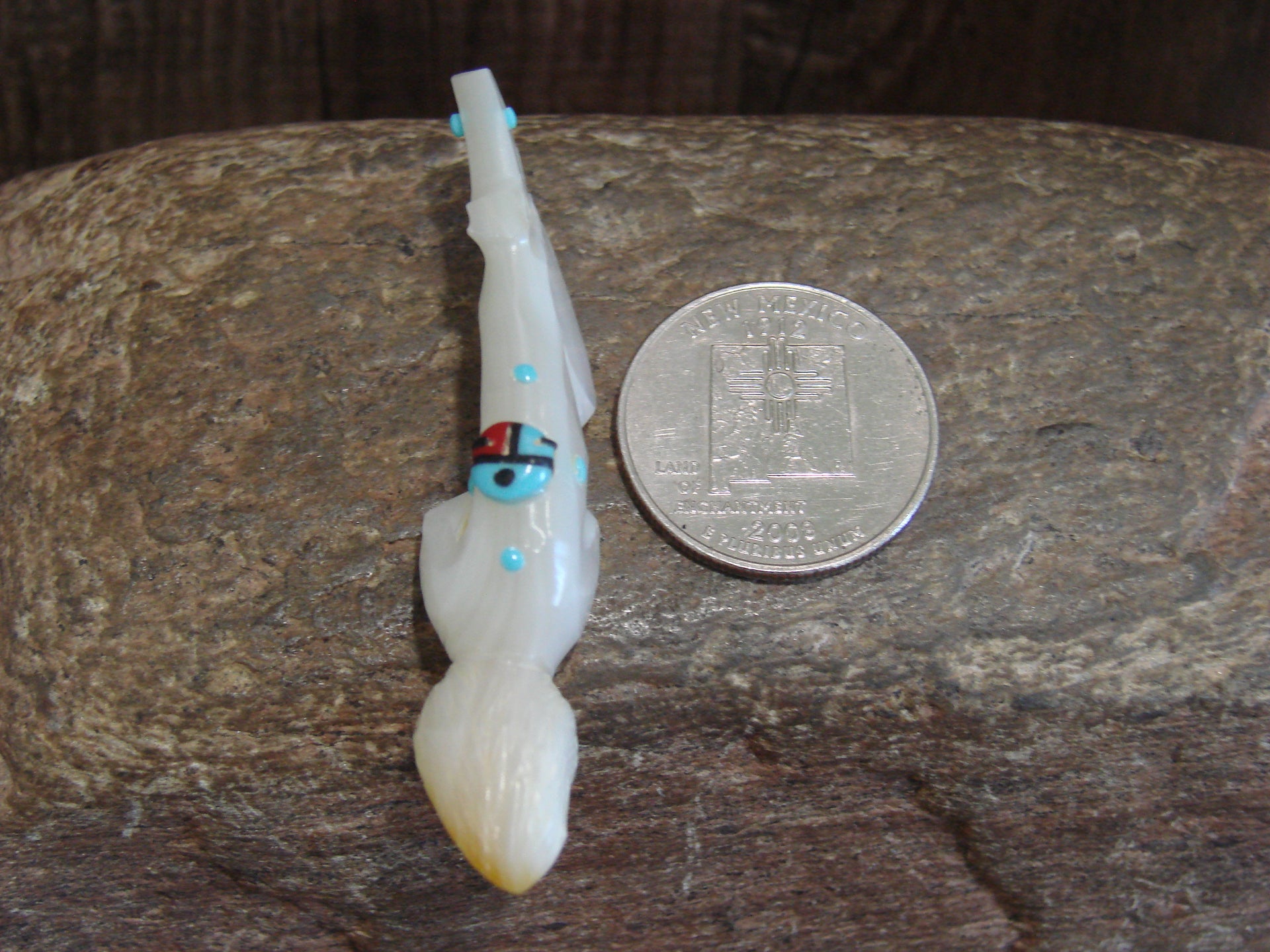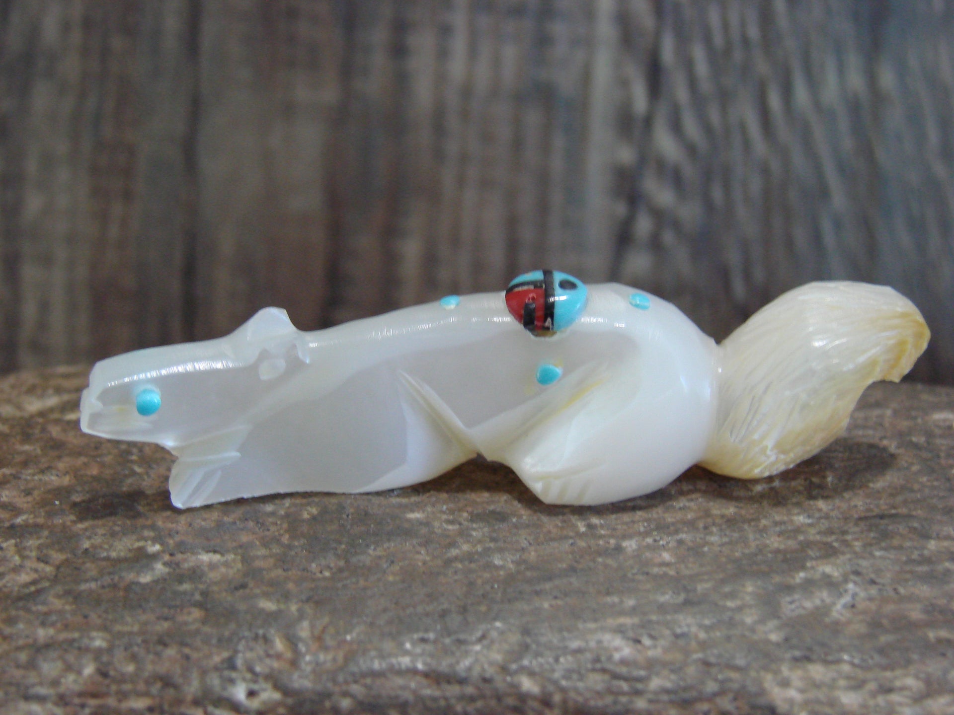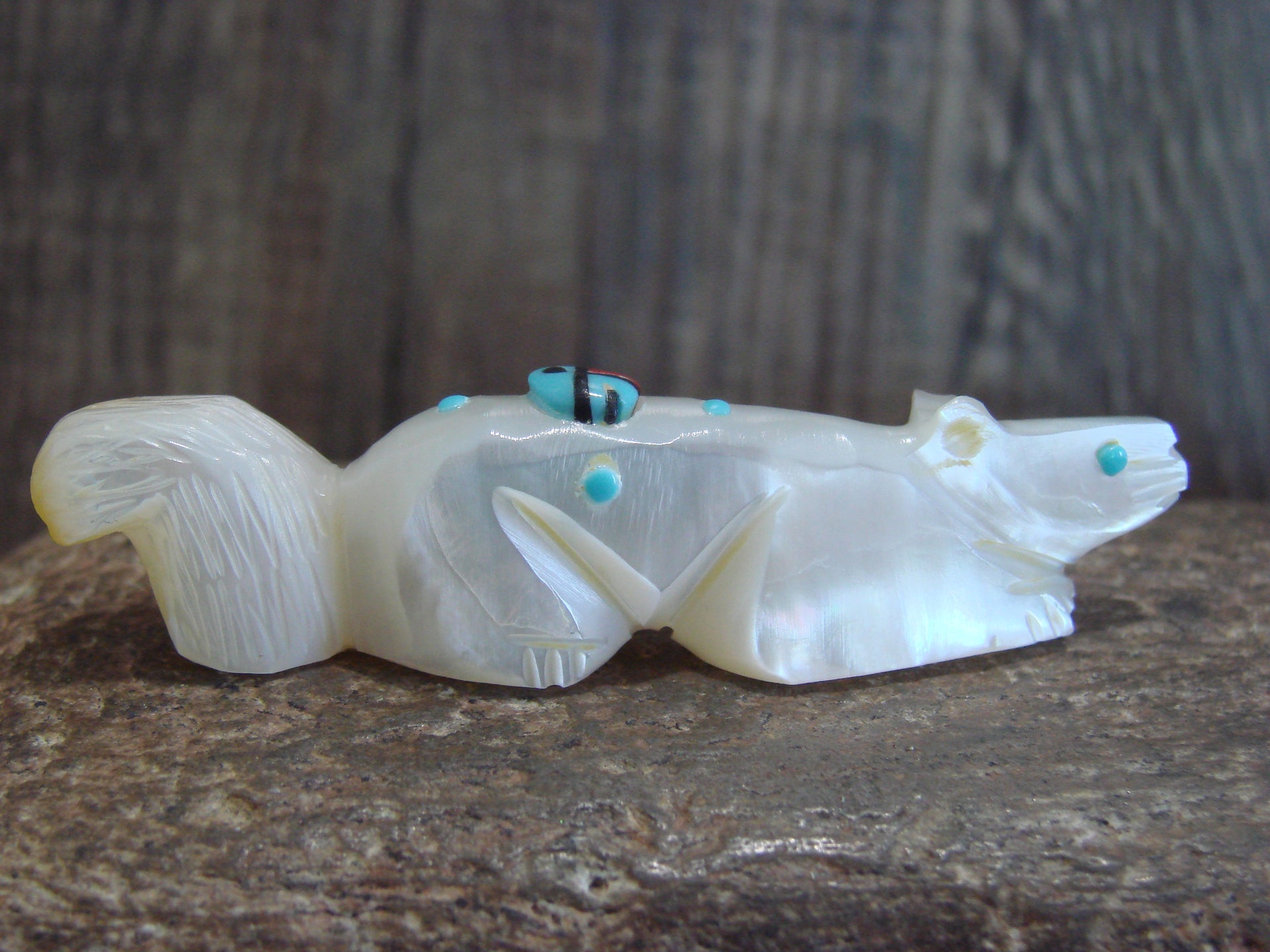 Native American Zuni Indian Hand Carved Squirrel Fetish from the Zuni Pueblo in Western New Mexico. This Stunning Fetish is Hand Carved out of a beautiful piece of Mother of Pearl. Turquoise is used for both the eyes. A Beautiful Sunface is featured on its back out of Turquoise, Coral, and Jet Stones. This is a unique and Stunning piece! Handmade and signed "DL" by the Zuni carver Denette Latte. Free Shipping included!