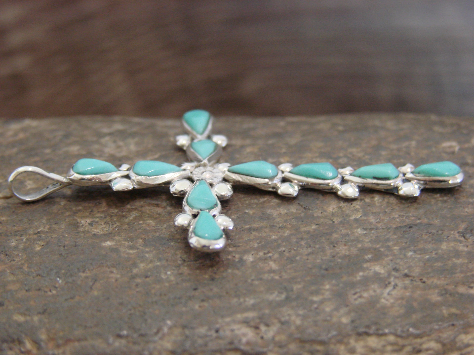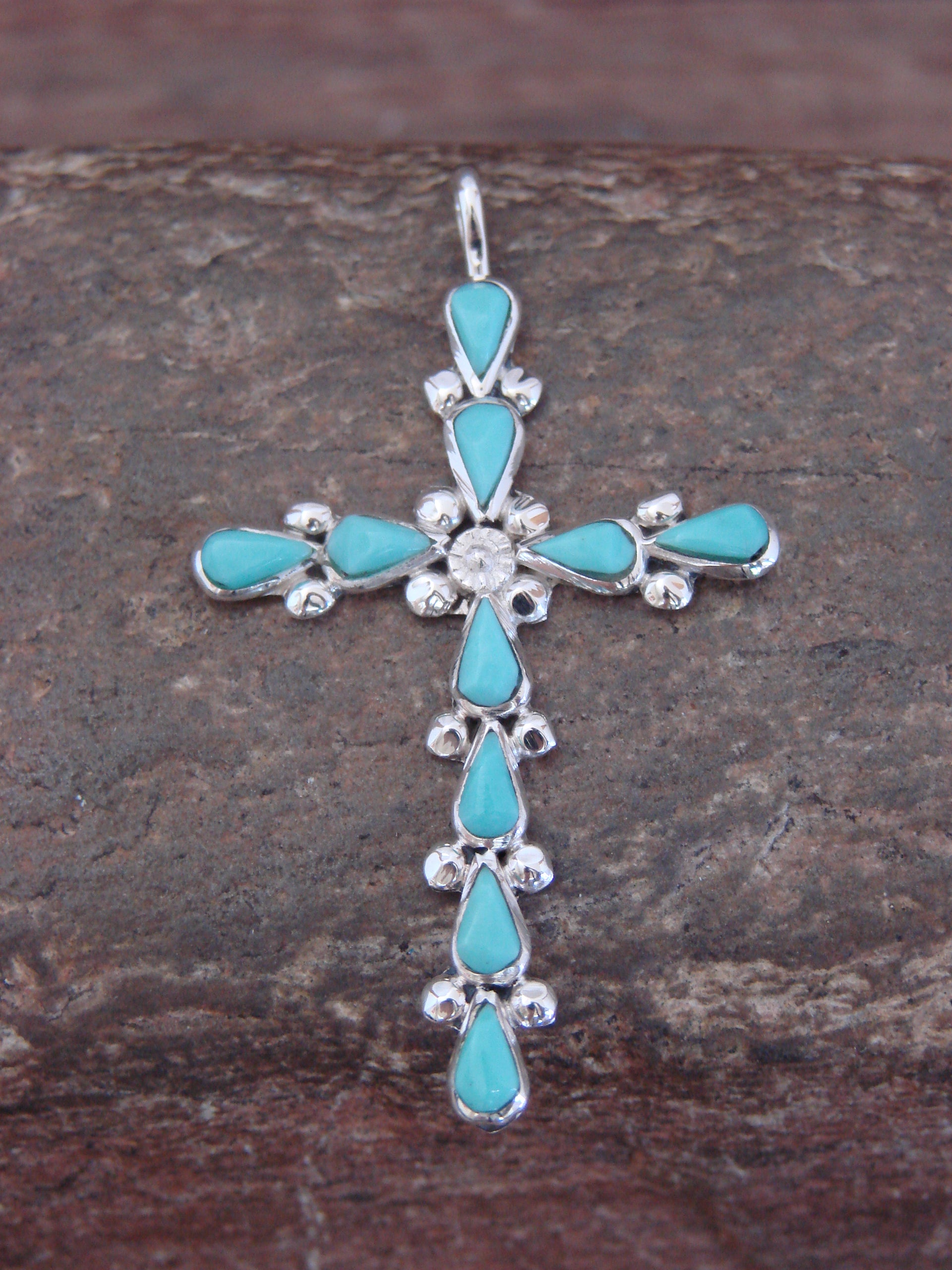 Genuine Native American Zuni Indian Sterling Silver & Turquoise Cross Pendant from Western New Mexico. This Cross features 4 beautiful genuine Turquoise stones. Each stone is set into a smooth sterling silver cross setting. Beautiful details in Sterling Silver surround the stones Hand made by Zuni Silversmith B. Vacit. Stamped "Sterling" on the back. Free Shipping with a gift box included!