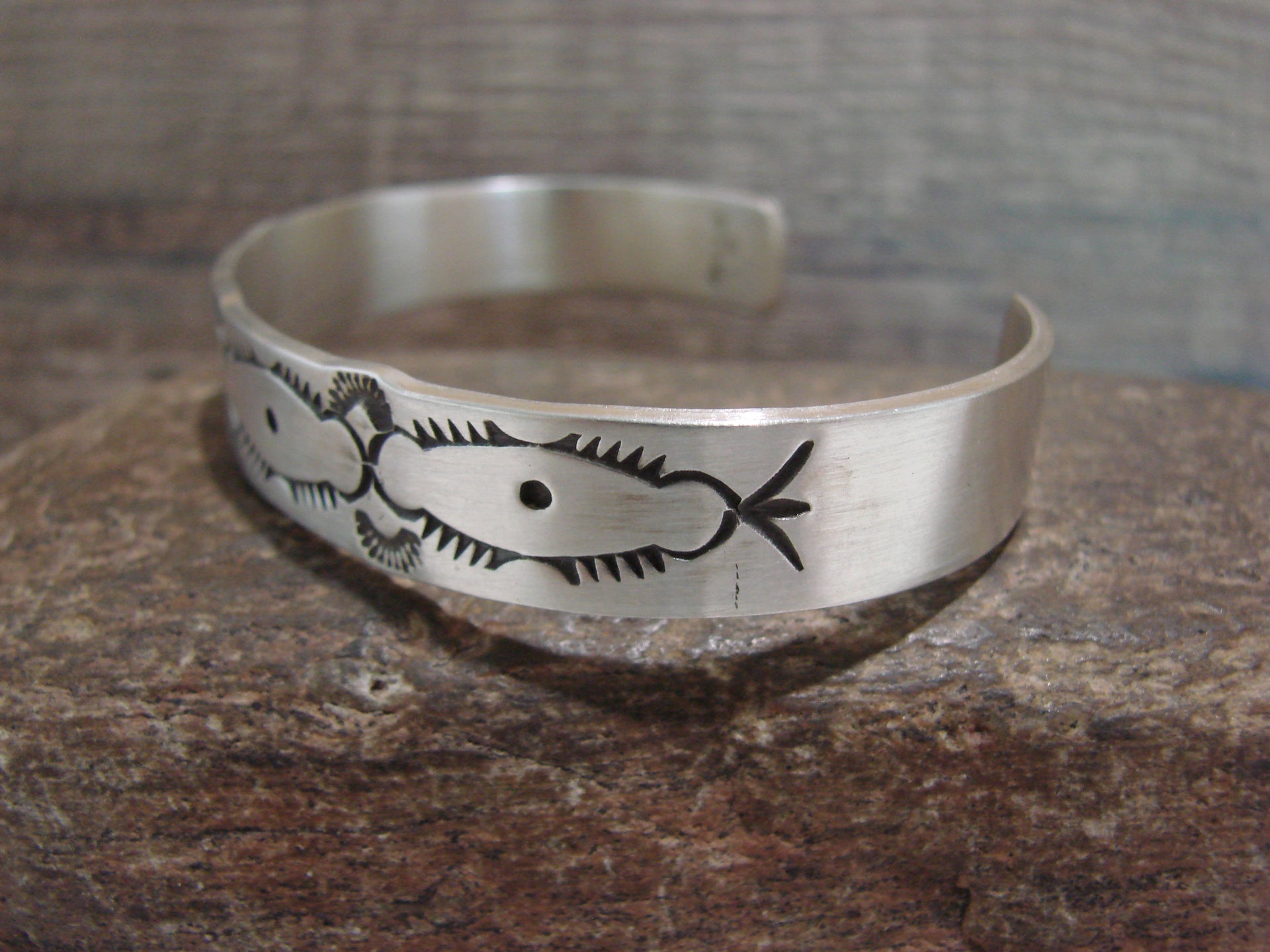 Native American Navajo Indian Sterling Silver Hand Stamped Cuff Bracelet from Western New Mexico. This bracelet features beautiful hand stamped Sterling Silver throughout. The bracelet has a great look and is nicely polished. Navajo Indian handmade by Sand Bell. Signed and stamped "Sterling" on the inner cuff. Free gift box and shipping included!