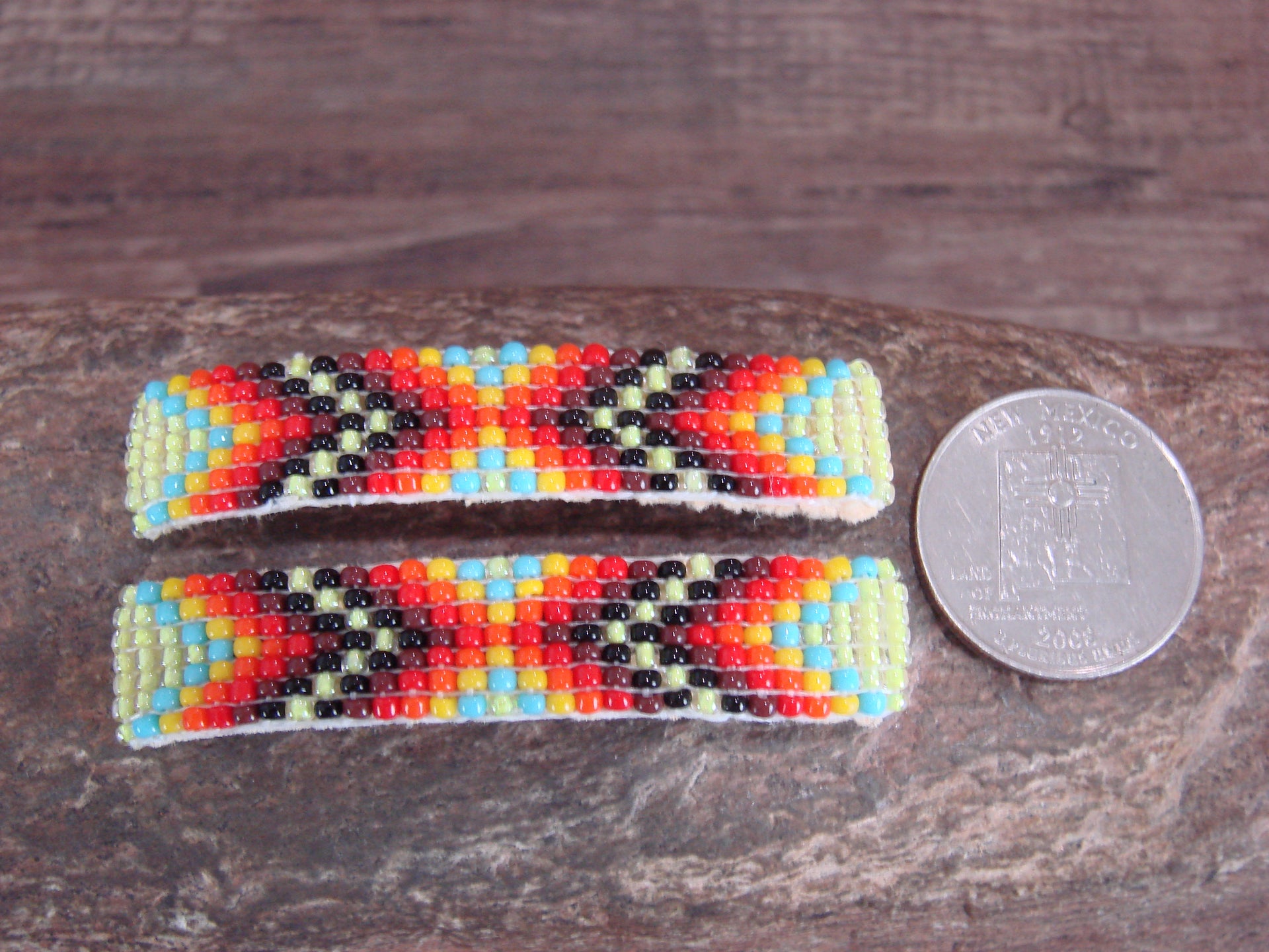 Native American Navajo Indian Hand Beaded Hair Barrette Set from Western New Mexico. These barrettes feature a beautiful bead design throughout. The colors are very vibrant and have a great look. Handmade by Navajo Silversmith Jacklyn Cleveland. Unsigned. Free Shipping with a gift box! 2 barrettes included.