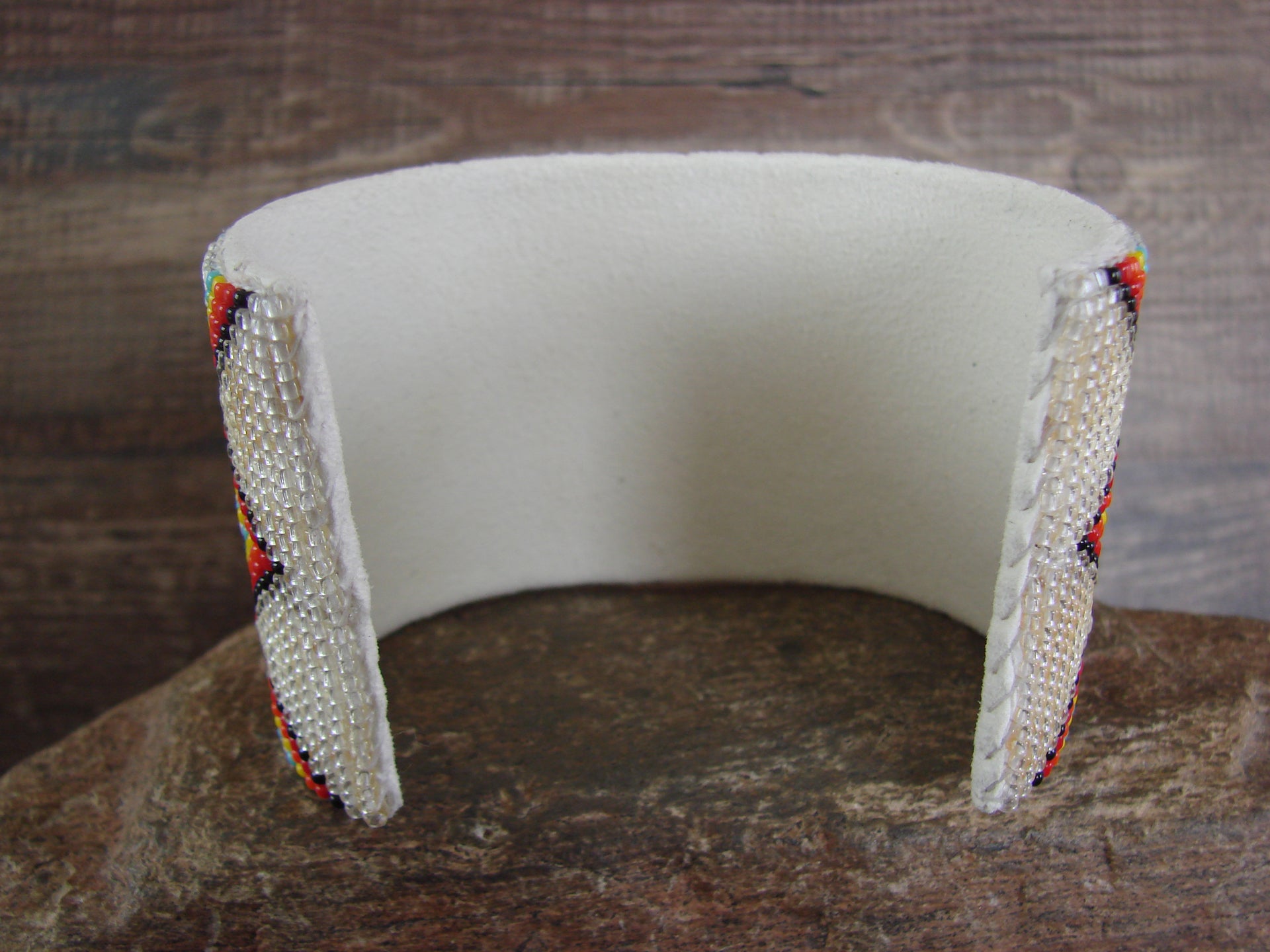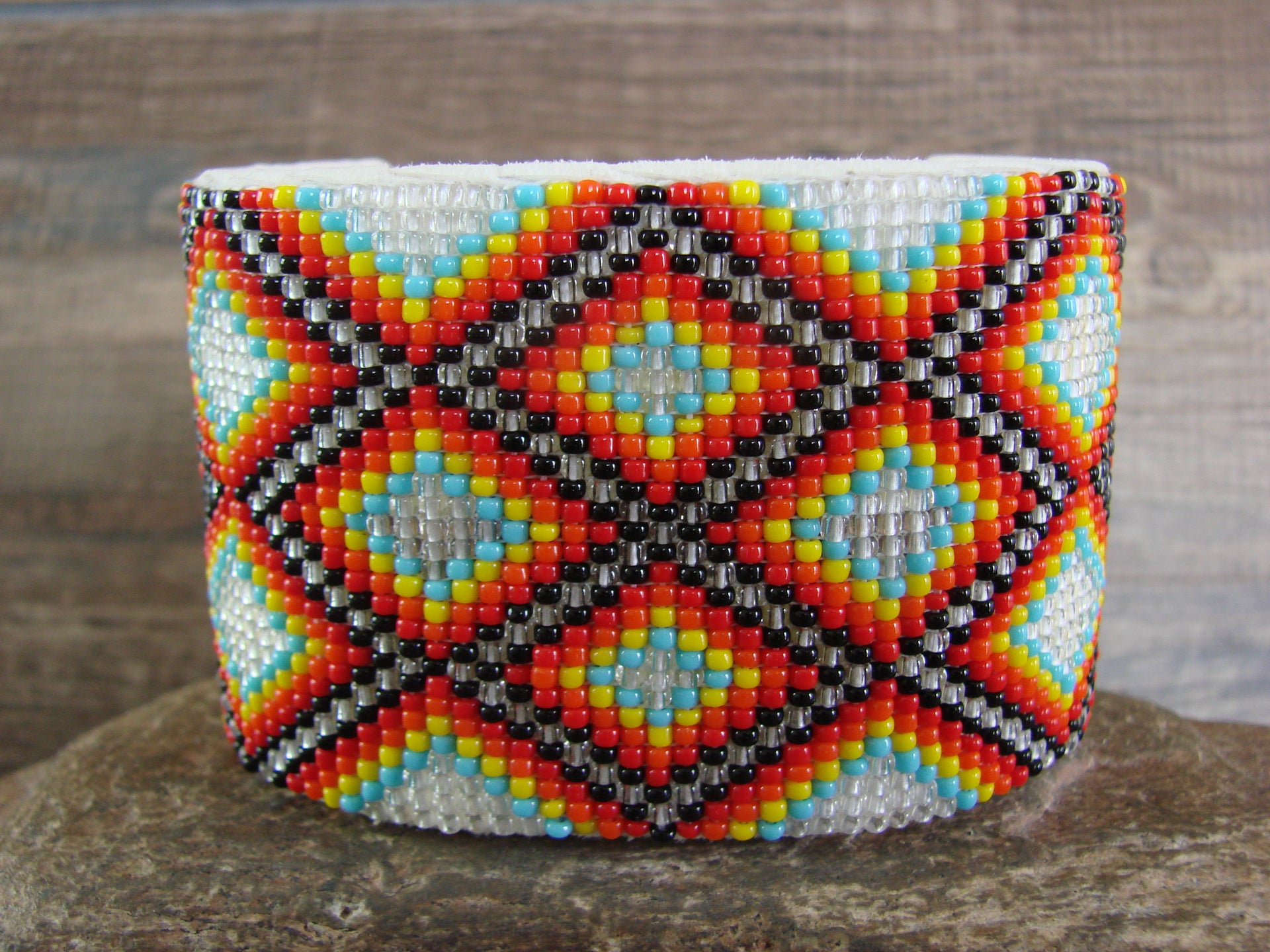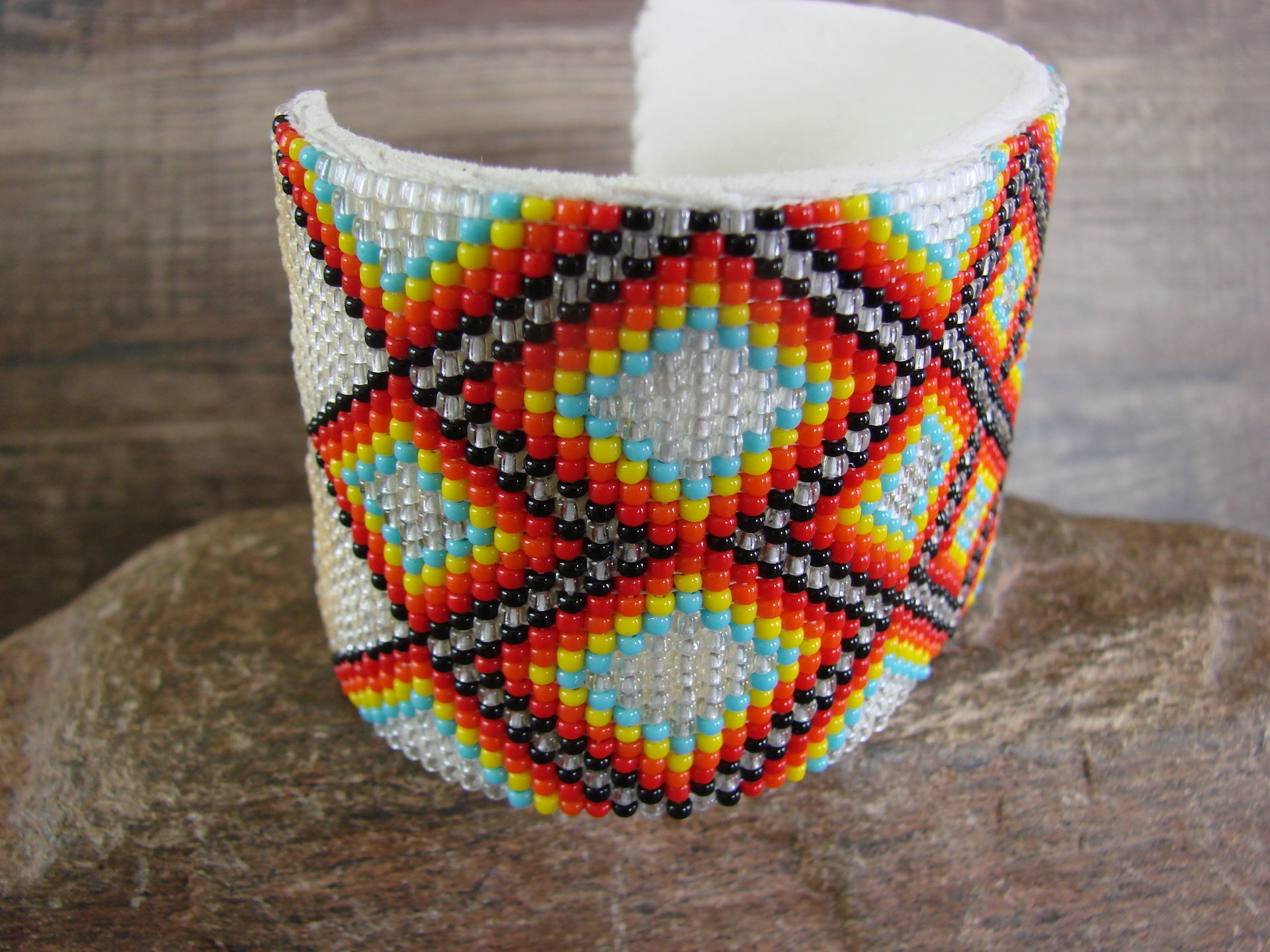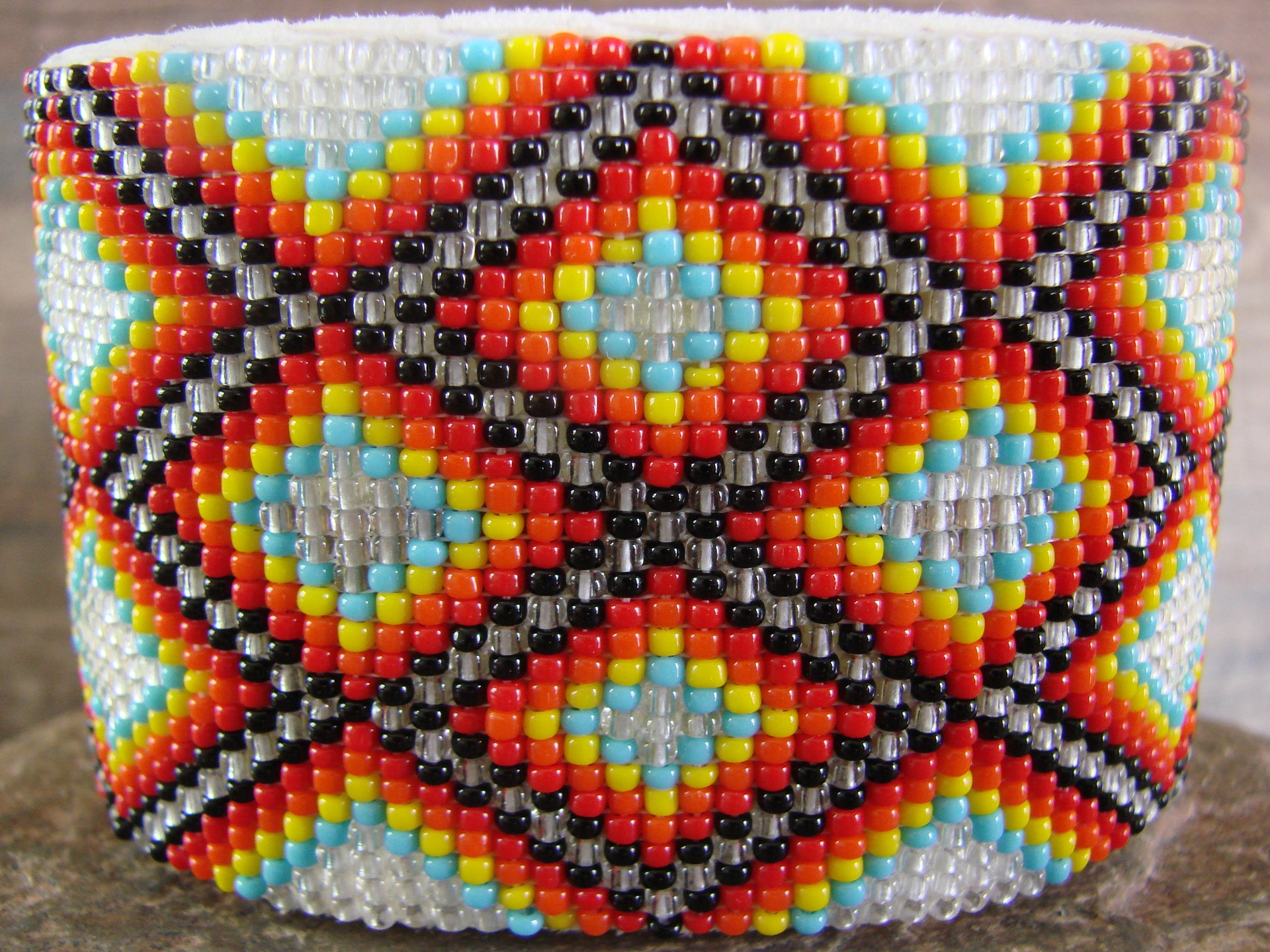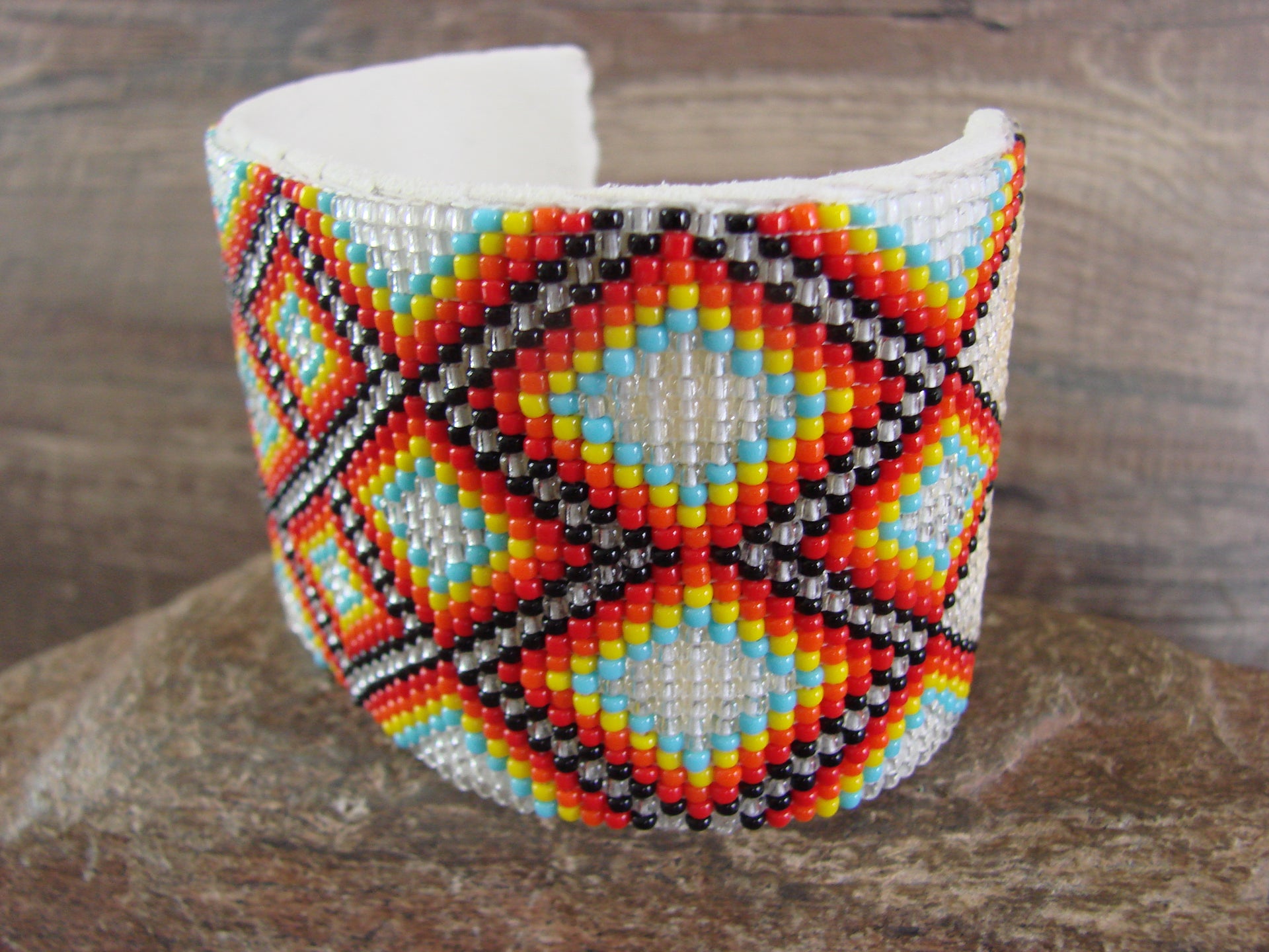 Native American Navajo Indian Hand Beaded Bracelet from Western New Mexico. This Large bracelet features a beautiful hand beaded design throughout. The bracelet is very colorful and has a great look. This bracelet can easily be adjusted to fit different sized wrists. The inside is lined with white leather. Navajo Indian handmade by Jacklyn Cleveland. The back is unsigned. Free shipping and gift box included!