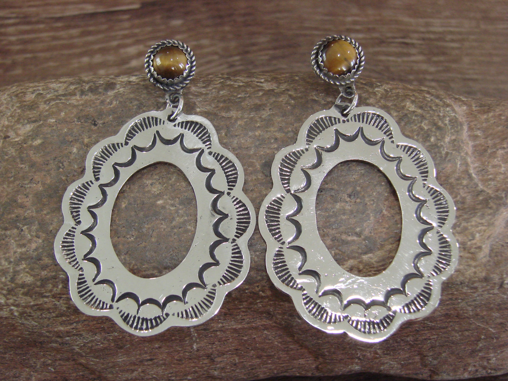 Navajo Indian Nickel Silver & Tiger Eye Dangle Post Earrings - Cleveland