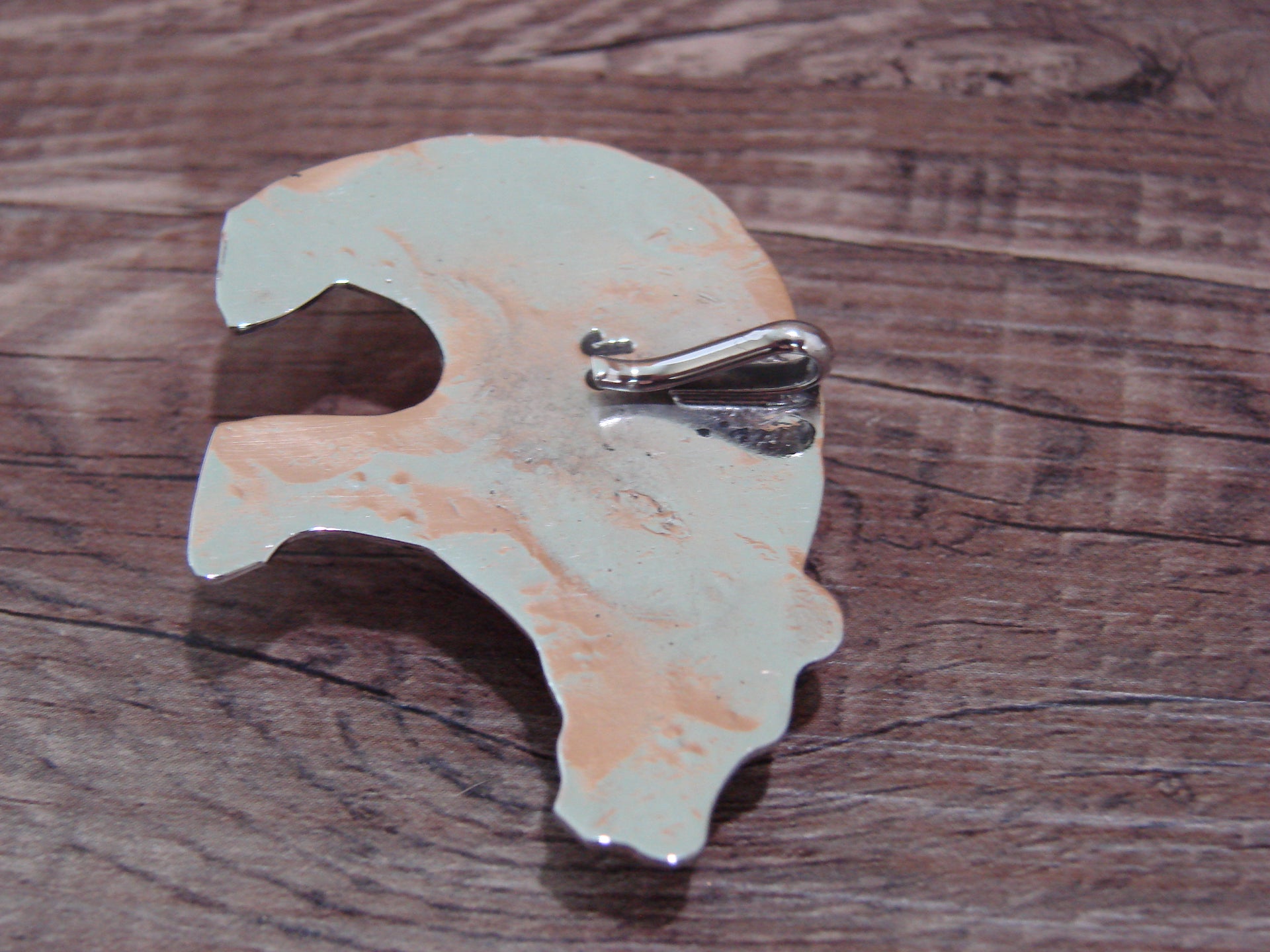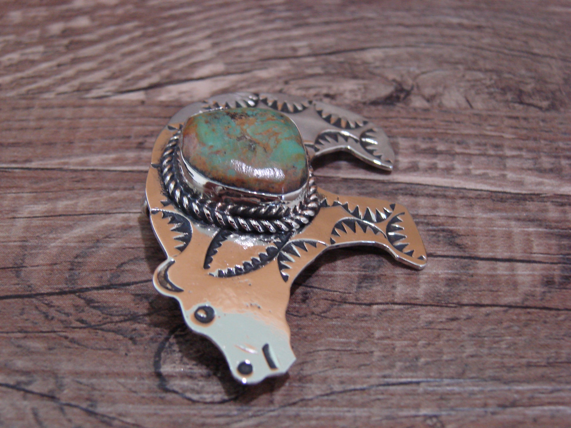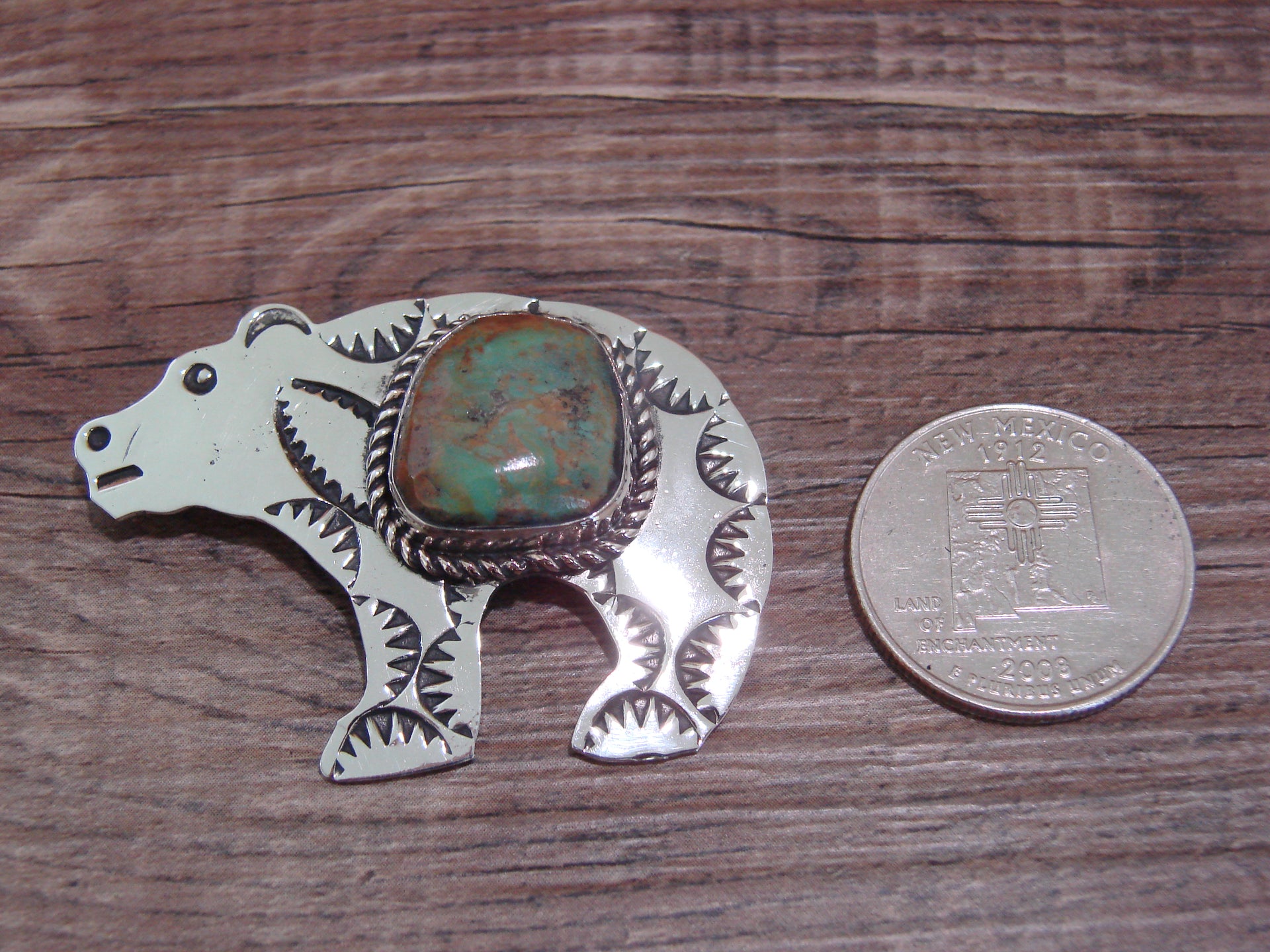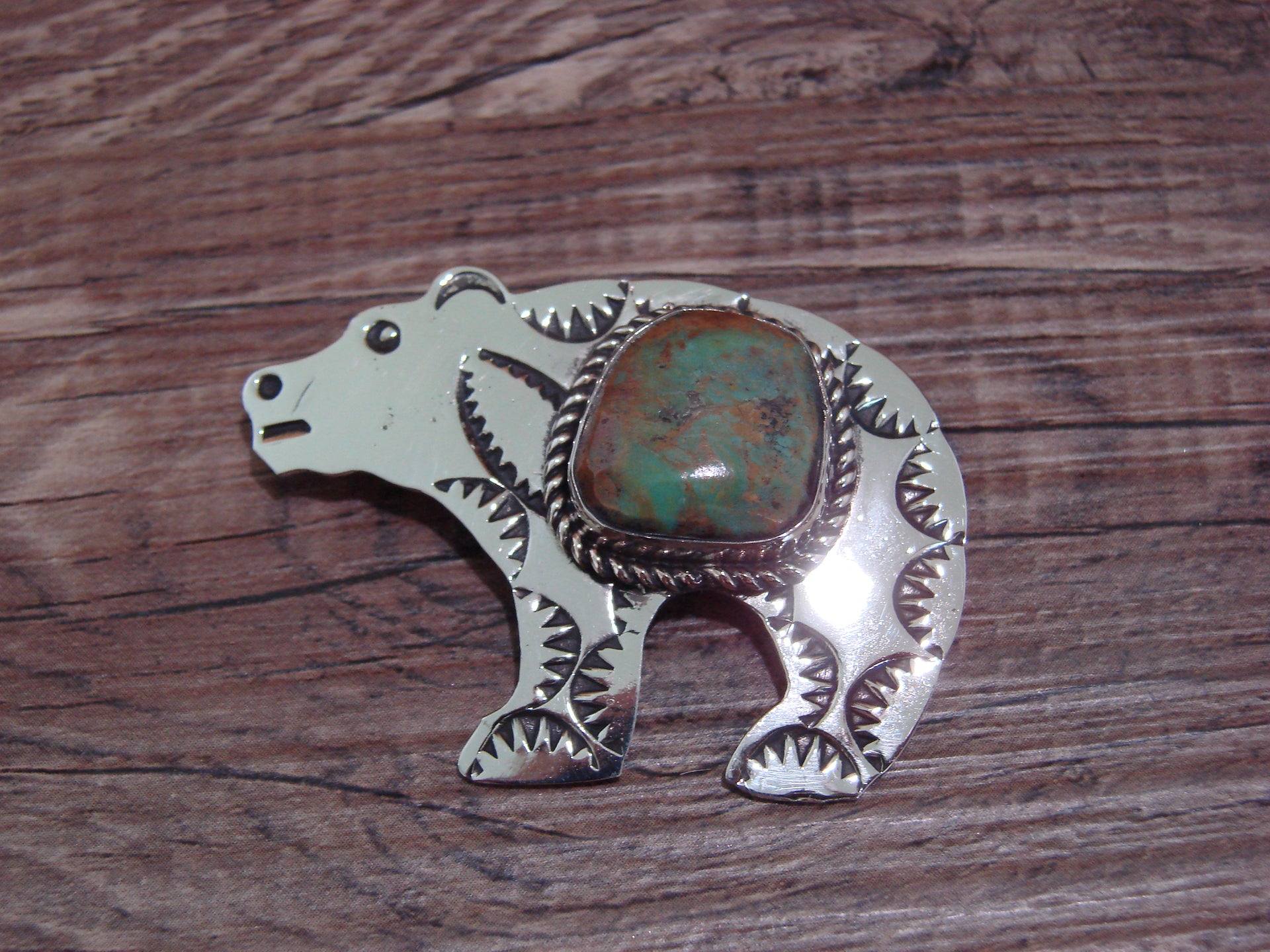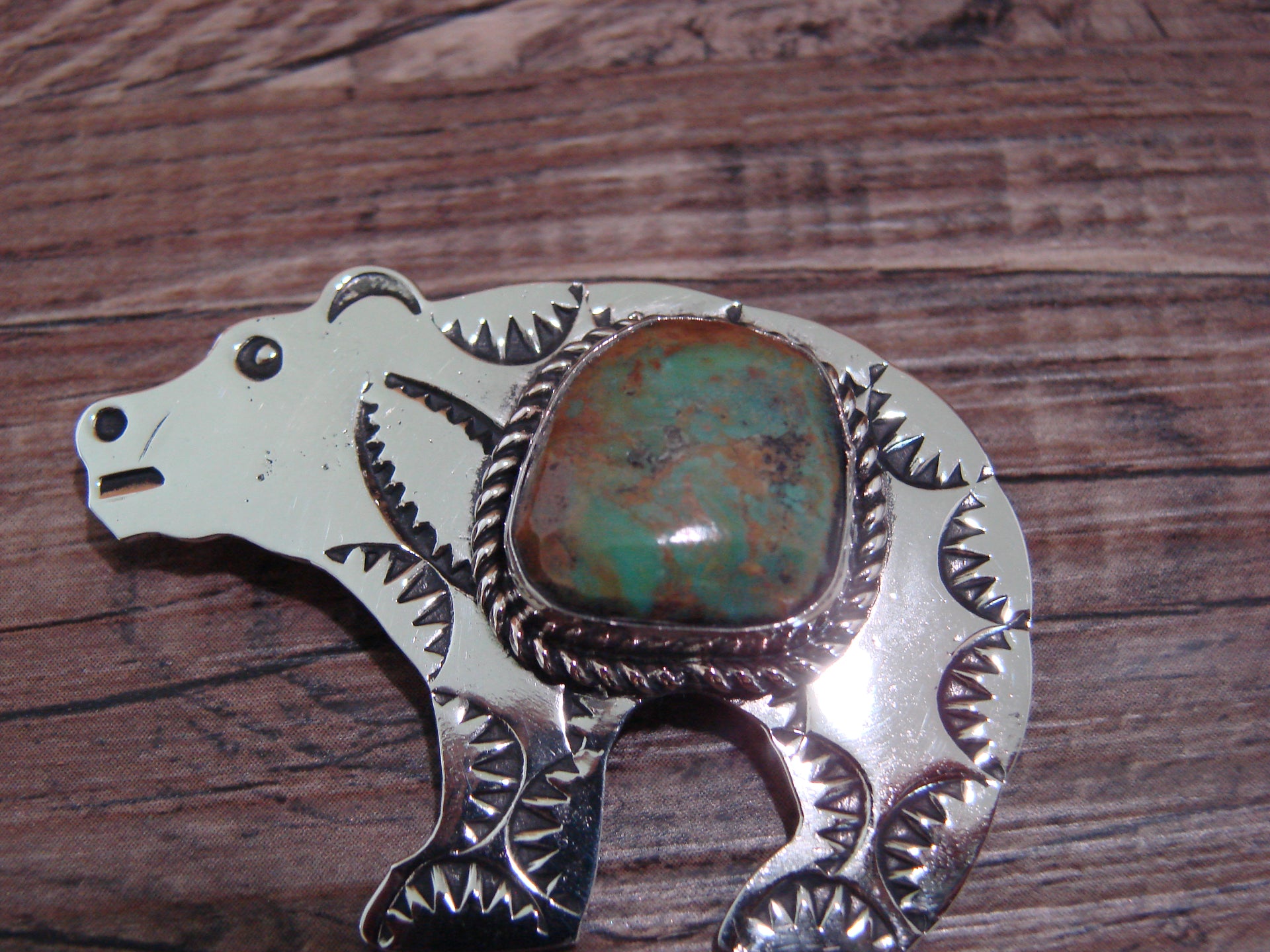 Native American Navajo Indian Nickel Silver & Turquoise Bear Pendant from Western New Mexico. This beautiful Pendant is hand cut from Nickel Silver and features stunning traditional hand stamping throughout. The Genuine Turquoise stone is securely set into a smooth Nickel Silver bezel setting. Handmade by Jackie Cleveland, wife of the late Navajo Silversmith Albert Cleveland. Signed "JC" on back. Jackie is widely known for her traditional Navajo style and hand stamping. Free gift box and shipping included!