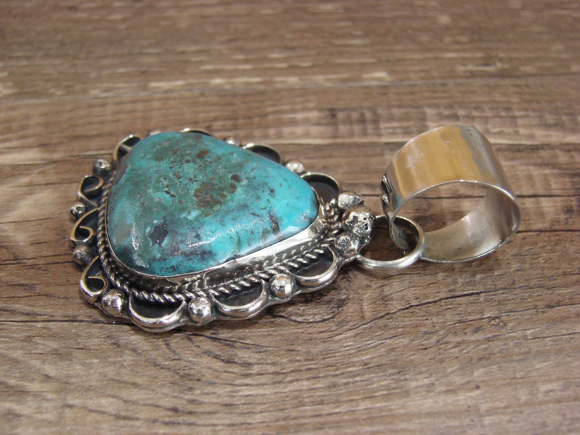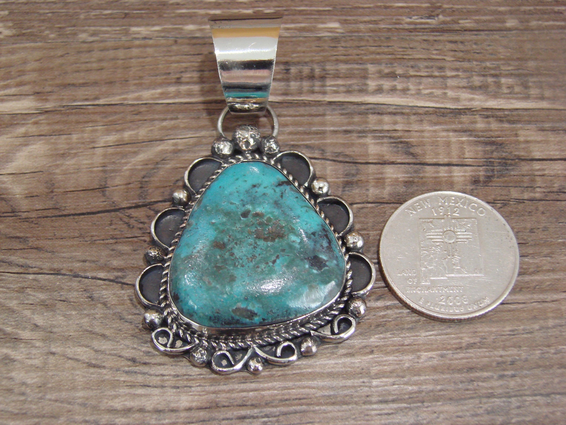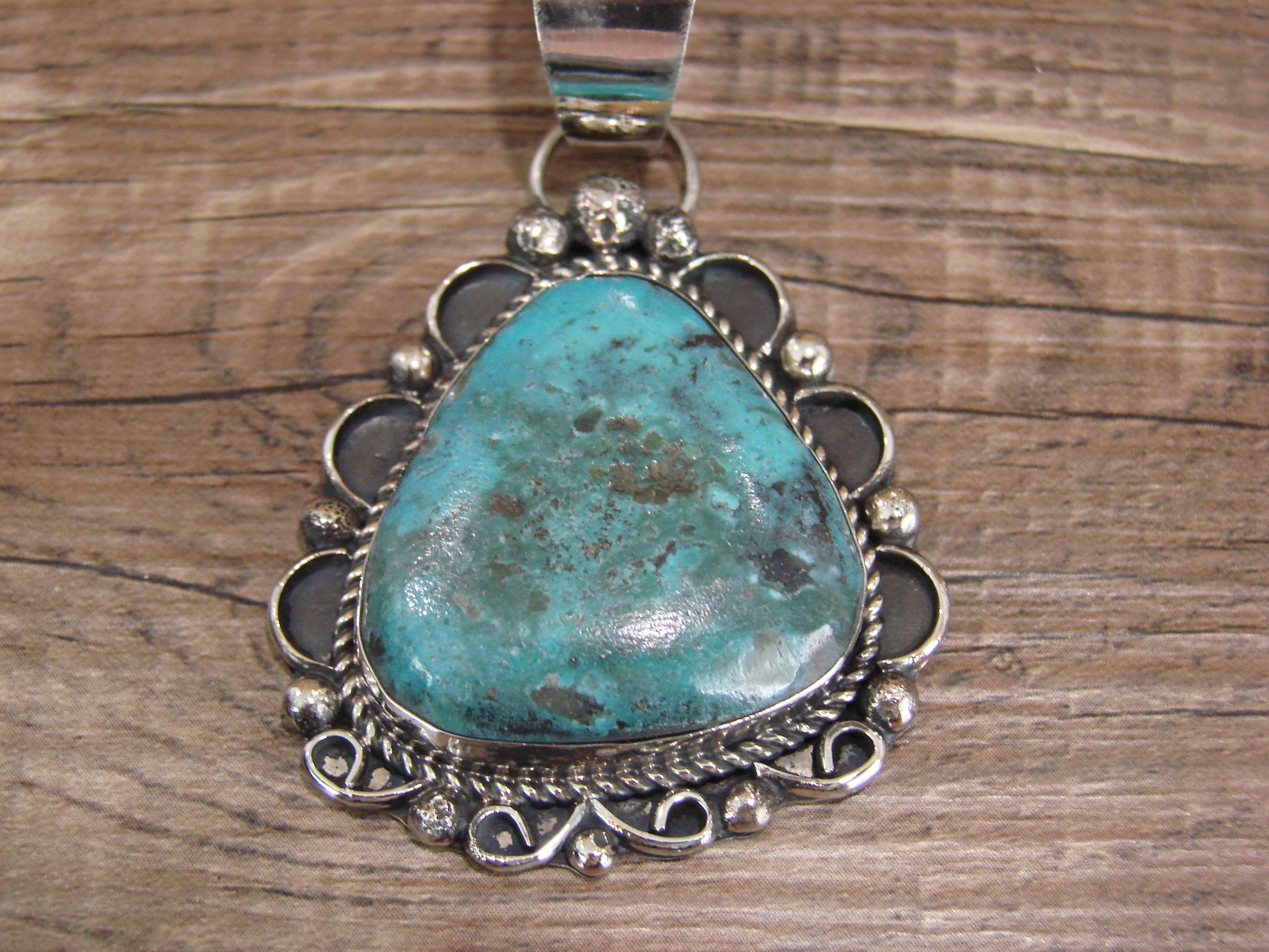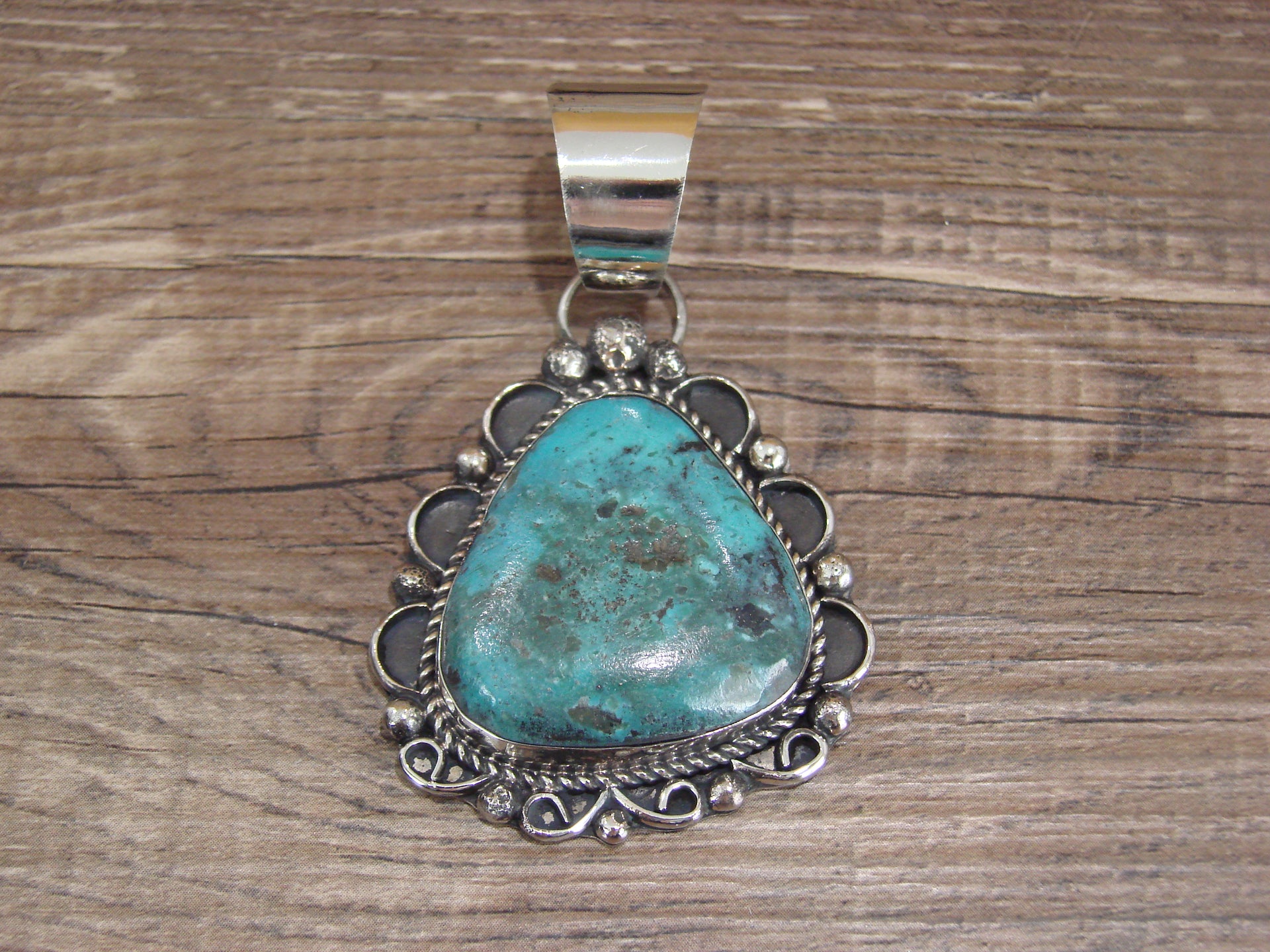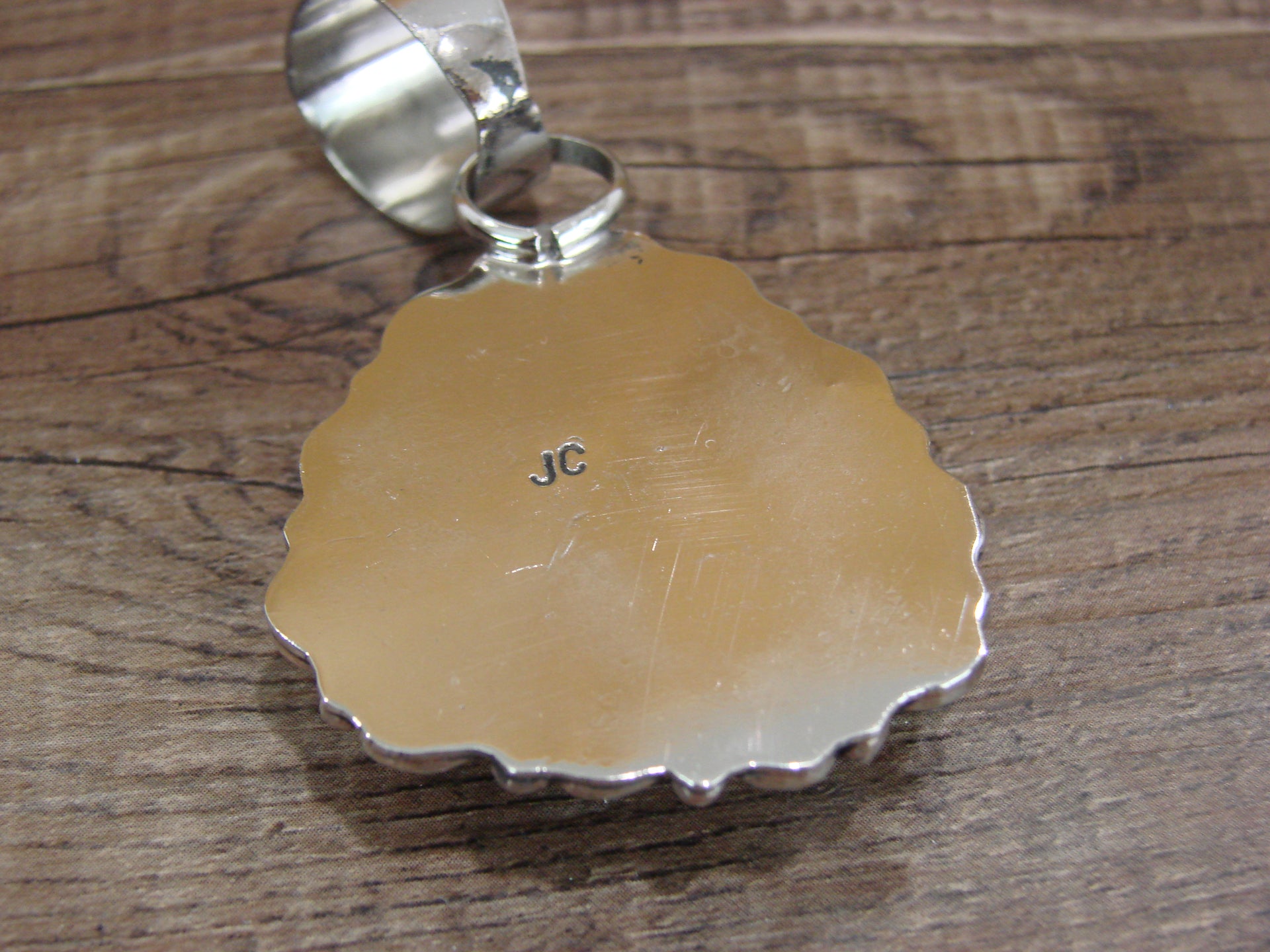 Native American Navajo Indian Nickel Silver & Turquoise Pendant from Western New Mexico. This beautiful Pendant is hand cut from Nickel Silver and features stunning traditional Nickel Silver details throughout. The Genuine Turquoise stone is securely set into a crown bezel setting. This Pendant is made with Nickel Silver. Handmade by Jackie Cleveland, wife of the late Navajo Silversmith Albert Cleveland. Signed "JC" on back. Jackie is widely known for her traditional Navajo style. Free gift box and shipping included!