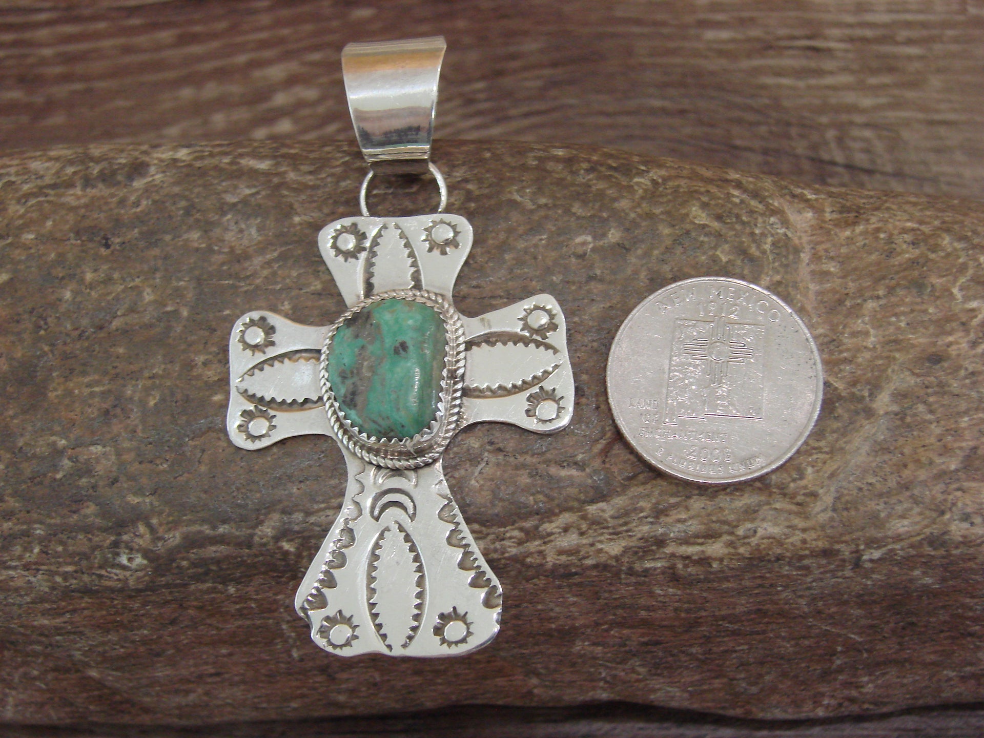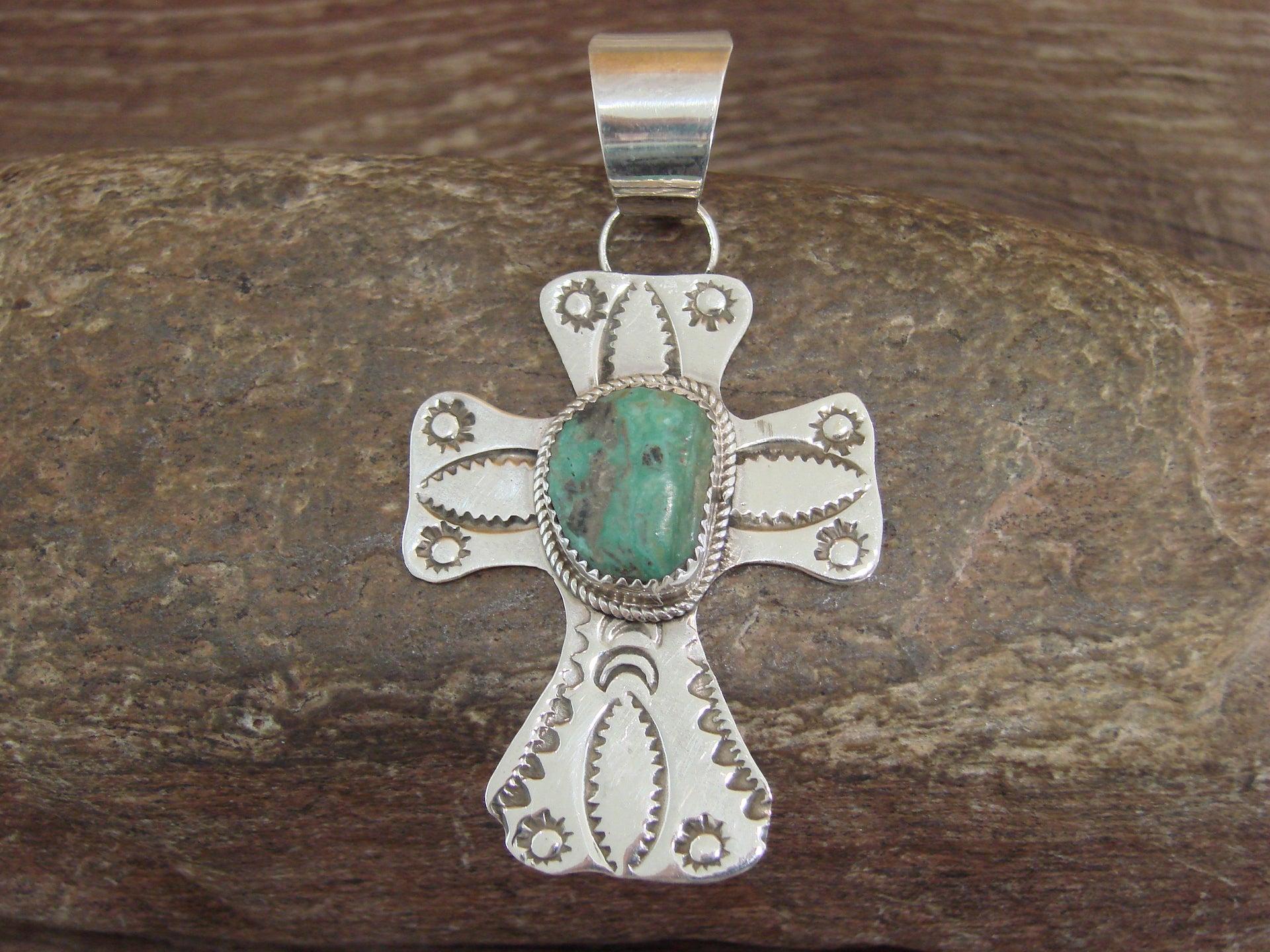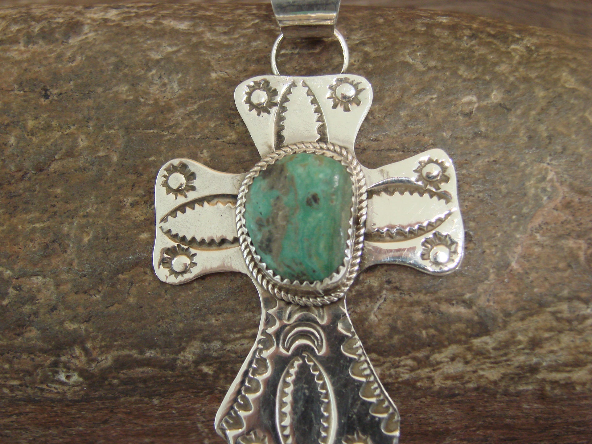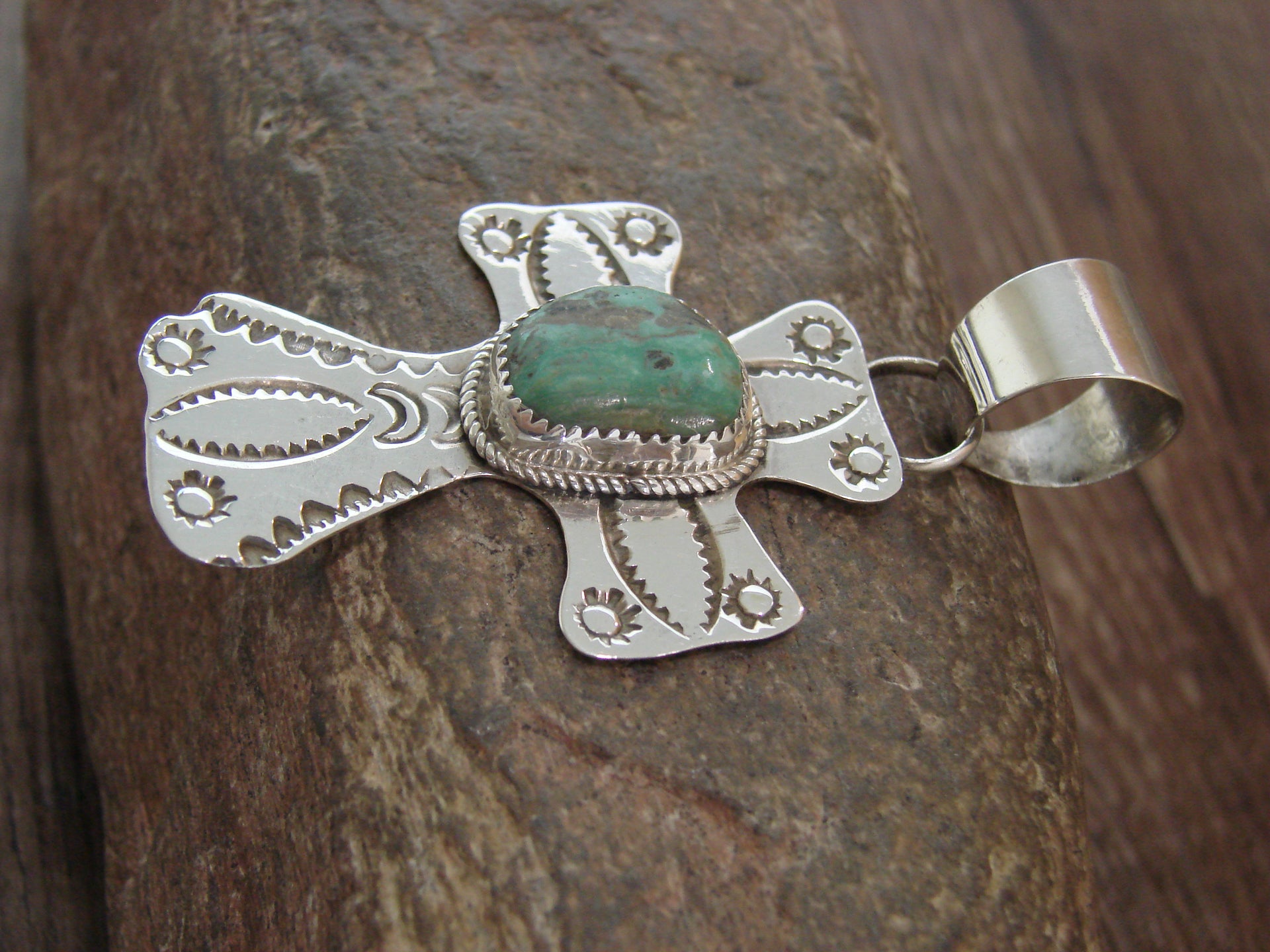 Native American Navajo Indian Sterling Silver & Turquoise Cross Pendant from Western New Mexico. This beautiful Cross Pendant is hand cut from Sterling Silver and features stunning traditional hand stamping throughout. The Genuine Turquoise stone is securely set into a crown Sterling Silver bezel setting. This Cross Pendant is Gorgeous! Handmade by Jackie Cleveland, wife of the late Navajo Silversmith Albert Cleveland. Signed "AJC" and Stamped "Sterling" on back. Jackie is widely known for her traditional Navajo style and hand stamping. Free gift box and shipping included!