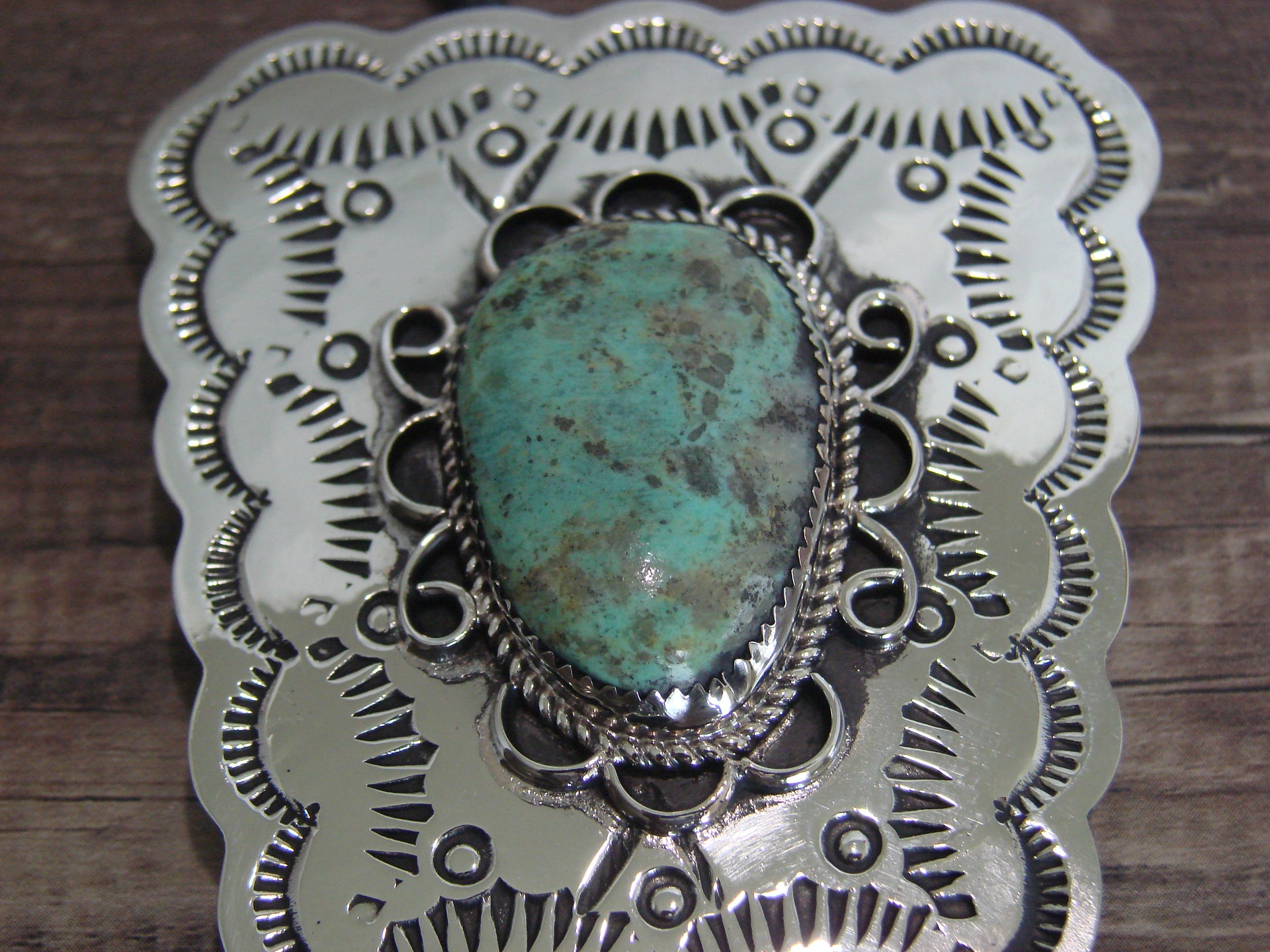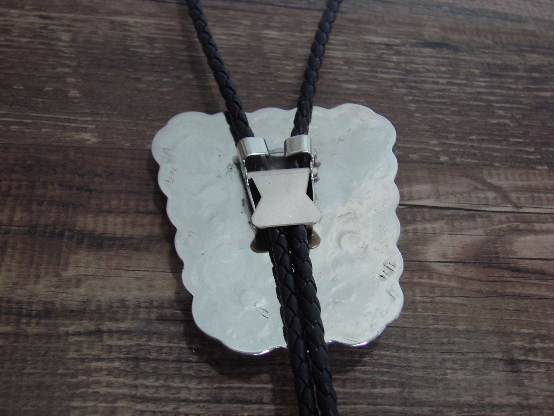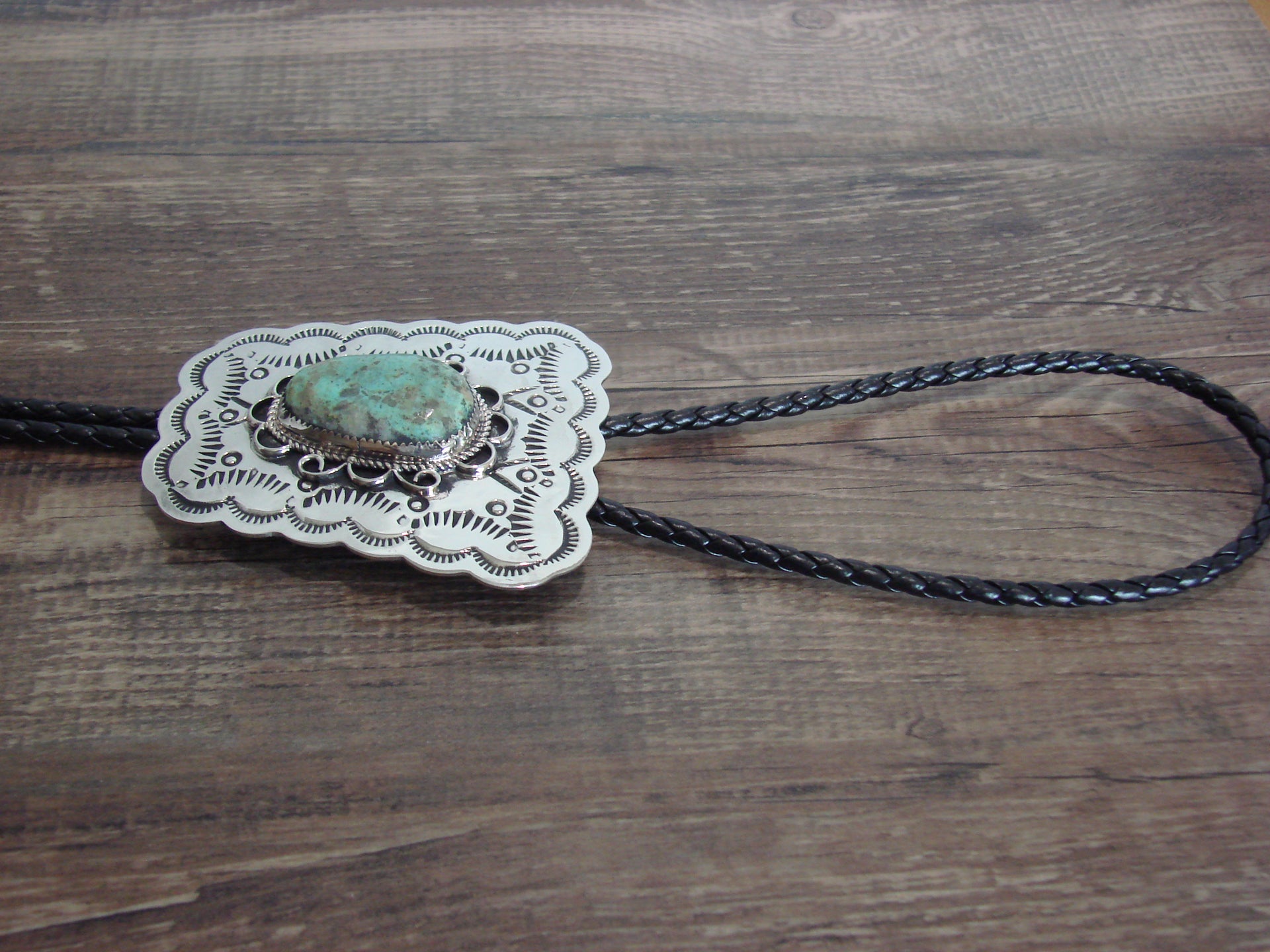 Native American Navajo Indian Hand Stamped Nickel Silver & Turquoise Bolo Tie from Western New Mexico. This bolo tie features stunning hand cut and hand stamped Nickel Silver. The beautiful Turquoise stone at the center is polished and stunning. The braided rope is finished with 2 beautiful Nickel Silver tips. Handmade by well known Navajo Silversmith Jackie Cleveland. Signed "JC" on the back. Free Shipping included!