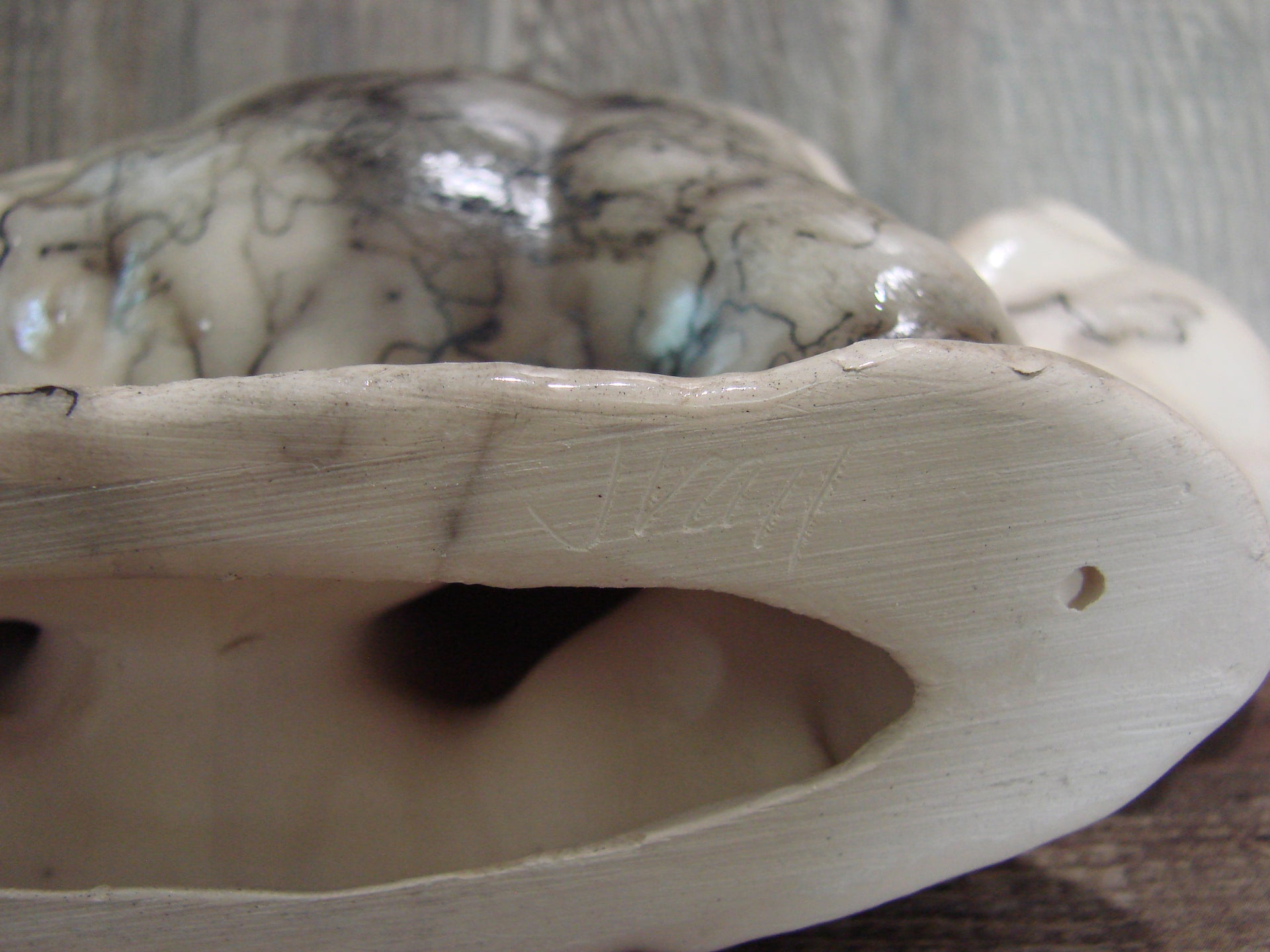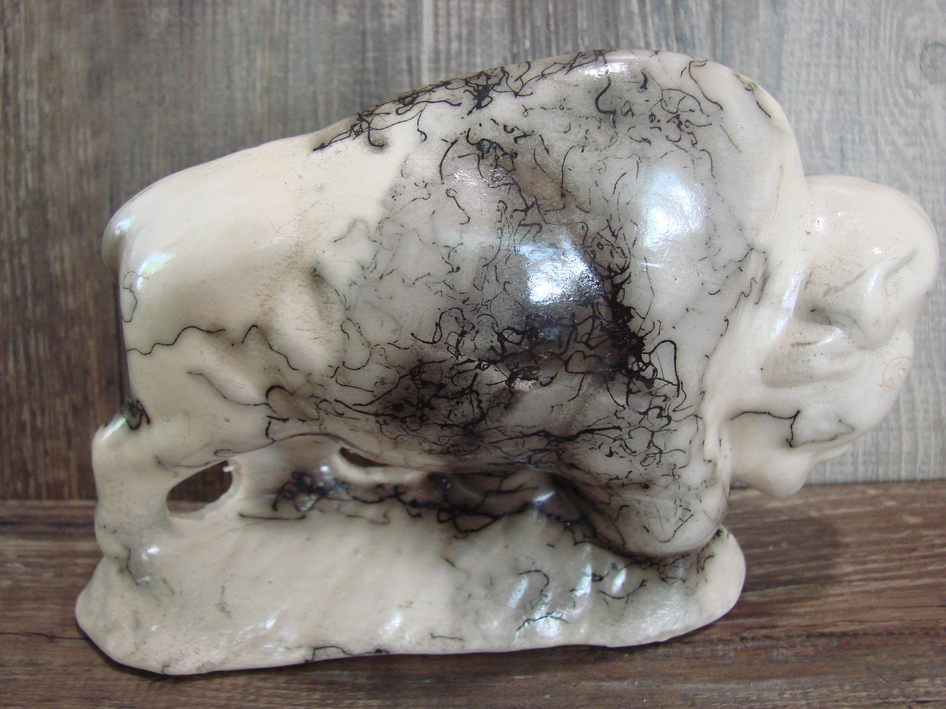 Native American Navajo Indian Horse Hair Buffalo Sculpture from Western New Mexico. This sculpture features beautiful horse hair throughout. The Horse hair is laid over this piece during firing. The result is a unique one of a kind look! Hand etched by Navajo artist J Vail. Signed on the bottom. Free Shipping included!