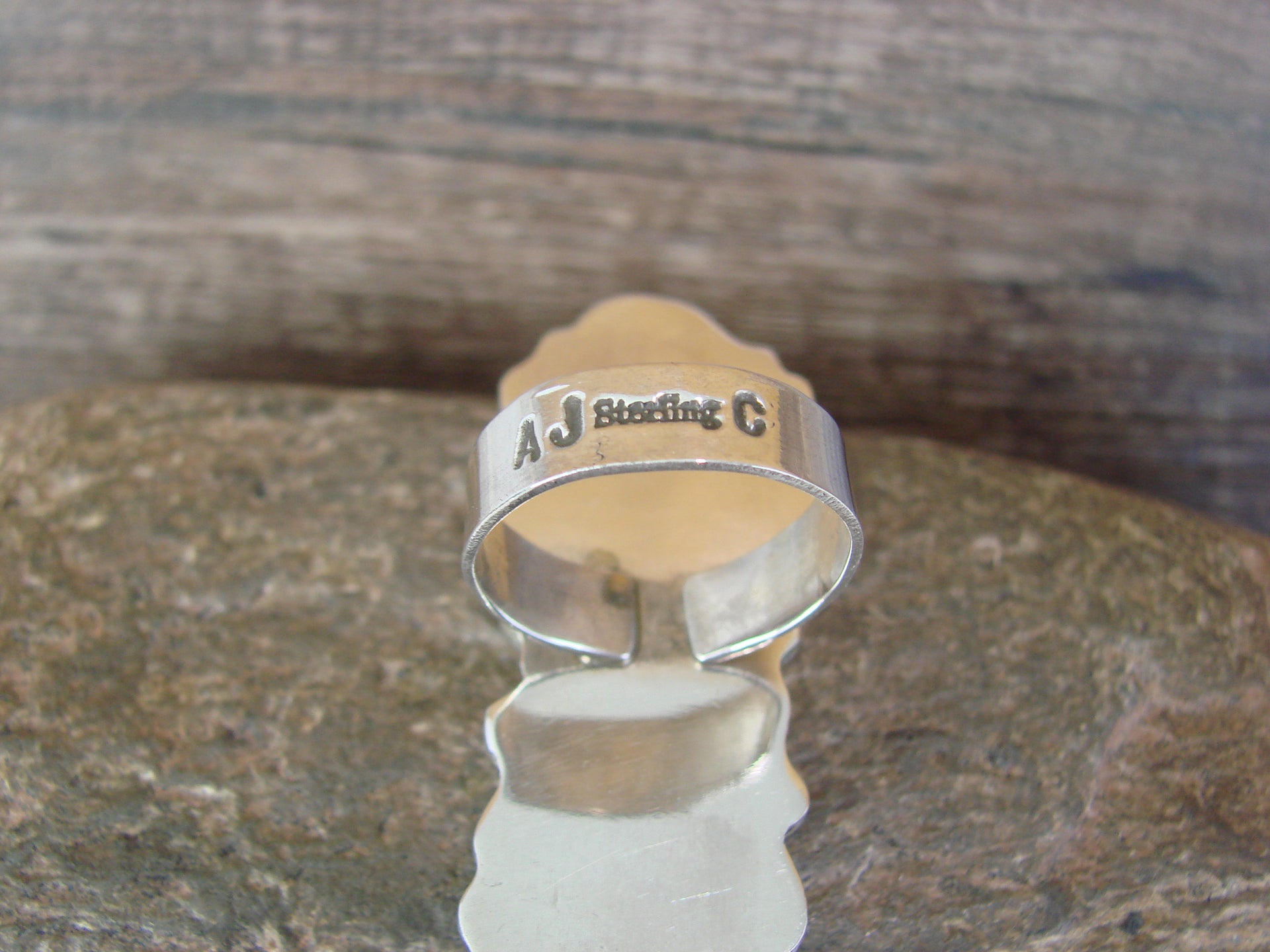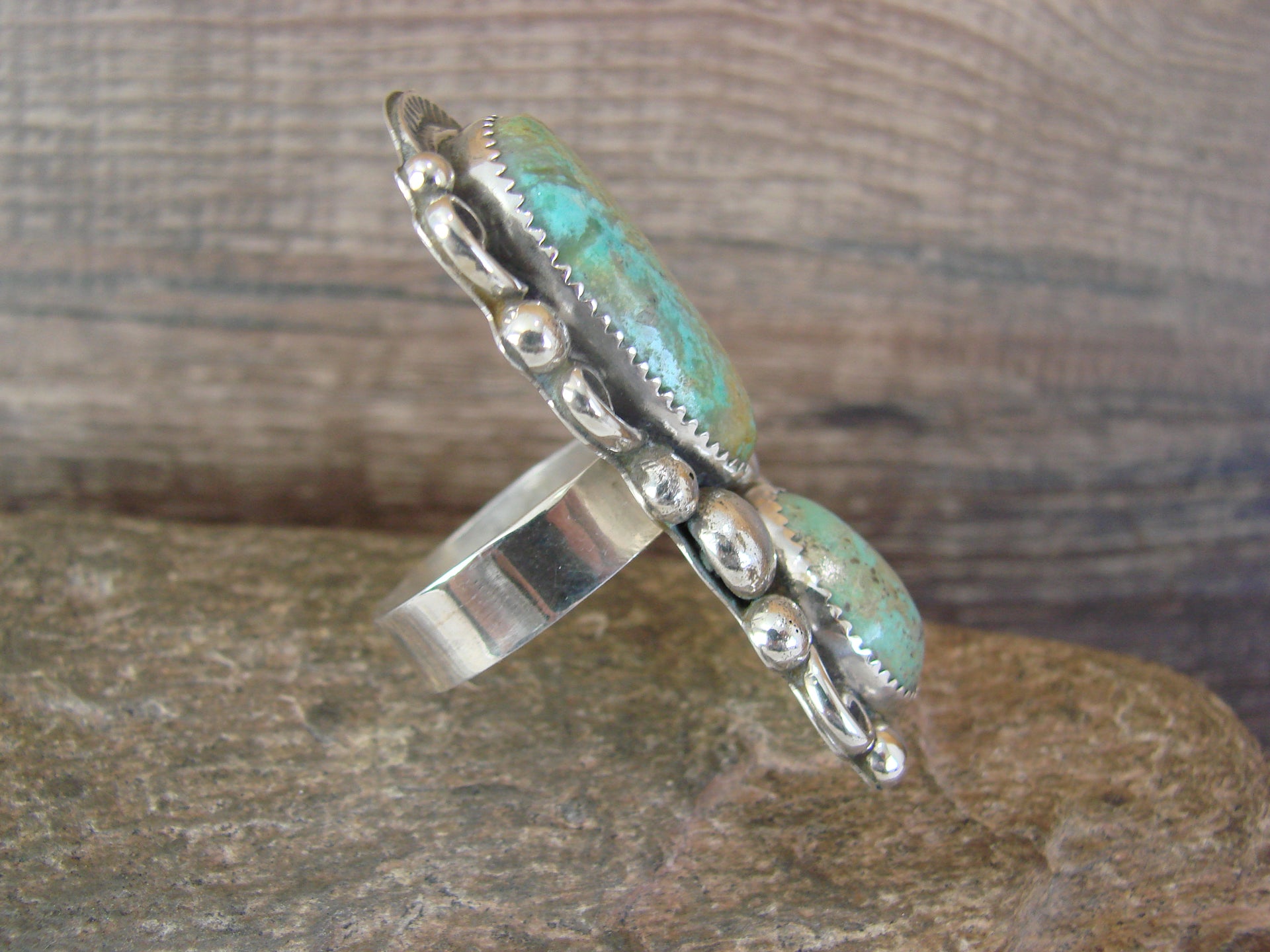 Large Native American Navajo Indian Sterling Silver Turquoise Ring from Western New Mexico. This Genuine ring features two beautiful stones. The stones are set into very nice crown Sterling Silver bezel settings and accented with Sterling Silver details. The band is adjustable from size 9 to 11. This ring is Stunning! Navajo Indian handmade by Silversmith Jackie Cleveland. Signed "AJC" and stamped "Sterling" on the back. Free Shipping included!