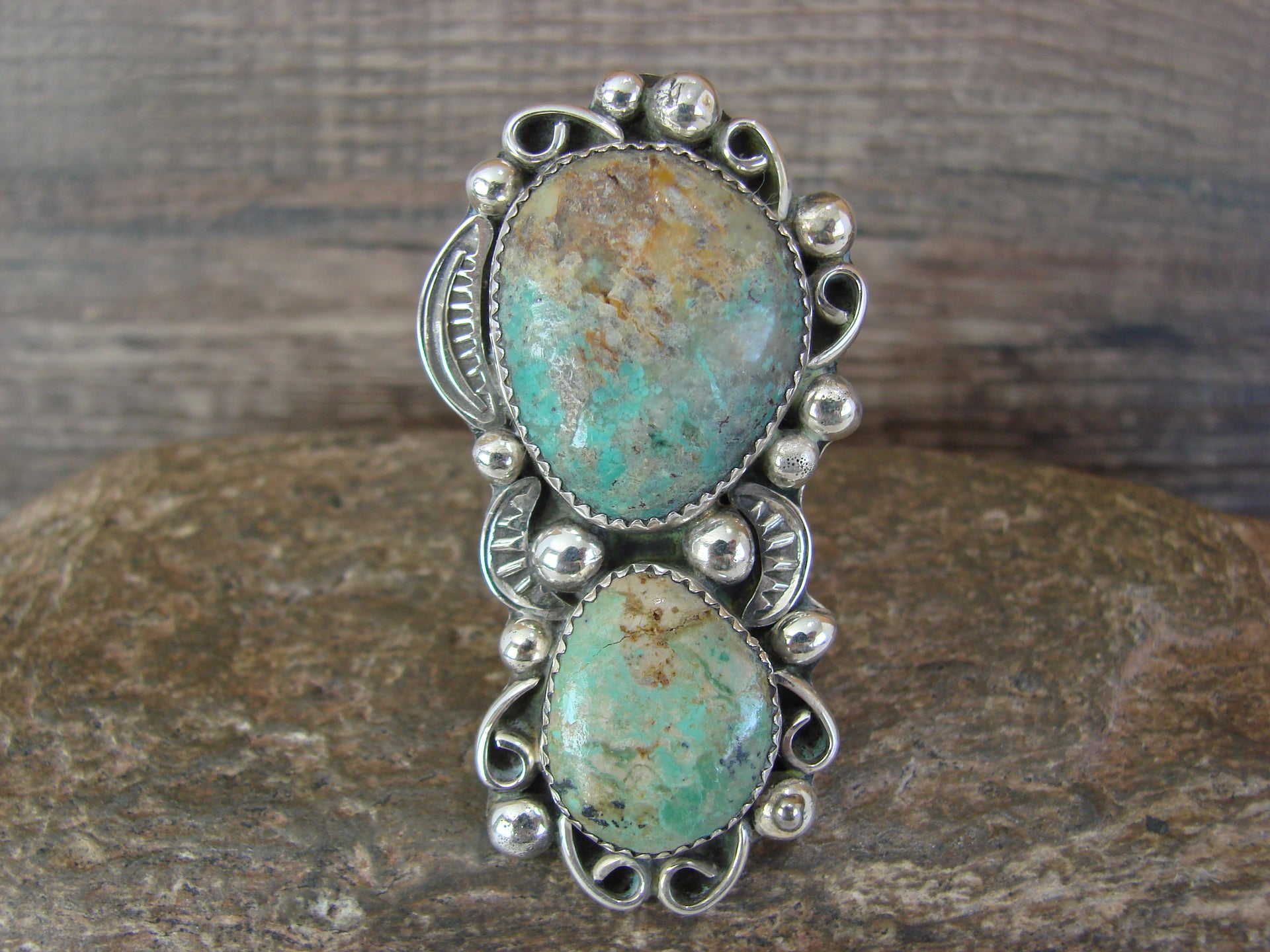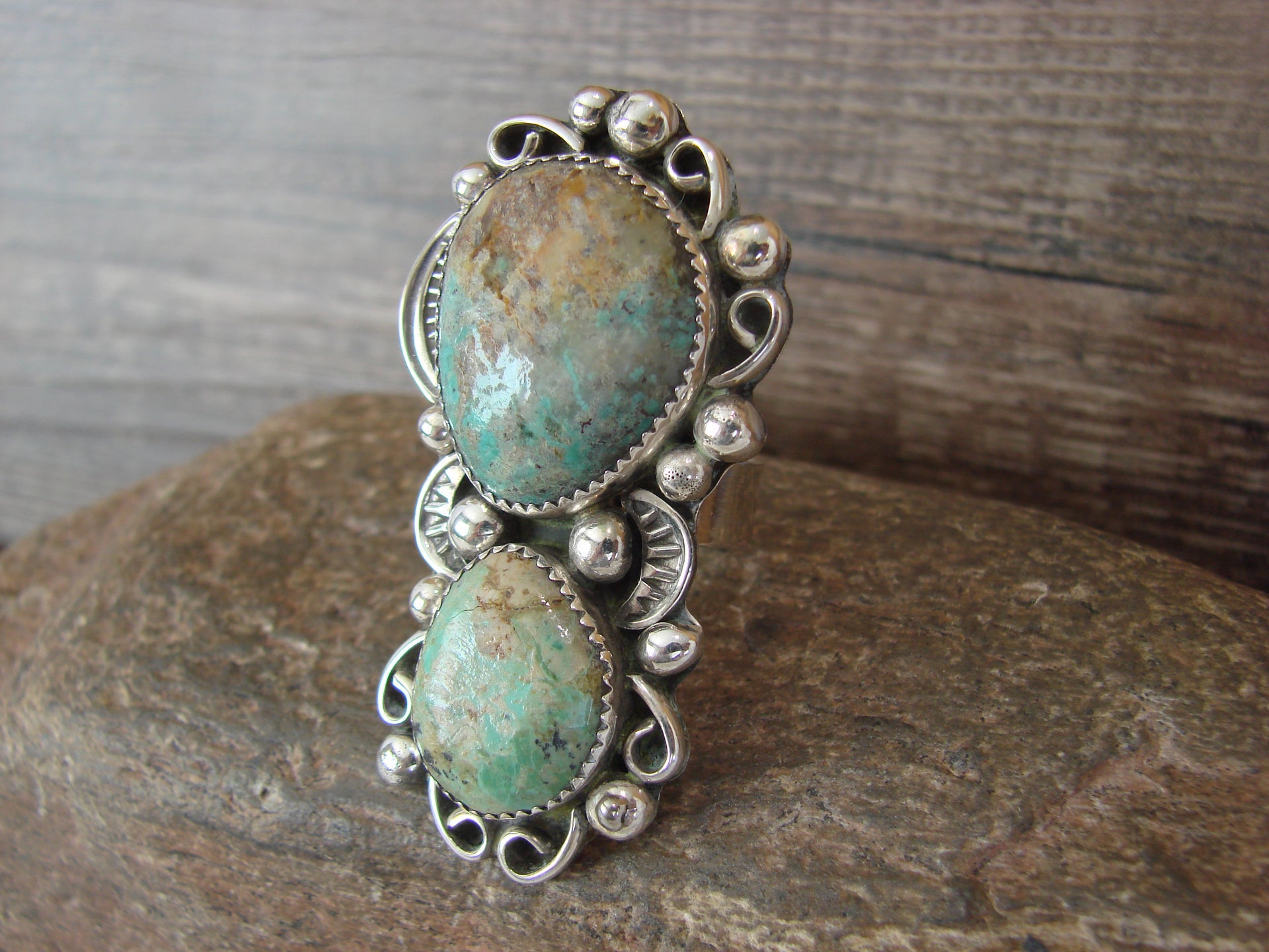 Large Native American Navajo Indian Sterling Silver Turquoise Ring from Western New Mexico. This Genuine ring features two beautiful Turquoise stones. The stones are set into very nice crown Sterling Silver bezel settings and accented with Sterling Silver details. The band is adjustable from size 9 to 11. This ring is Stunning! Navajo Indian handmade by Silversmith Jackie Cleveland. Signed "AJC" and stamped "Sterling" on the back. Free Shipping included!