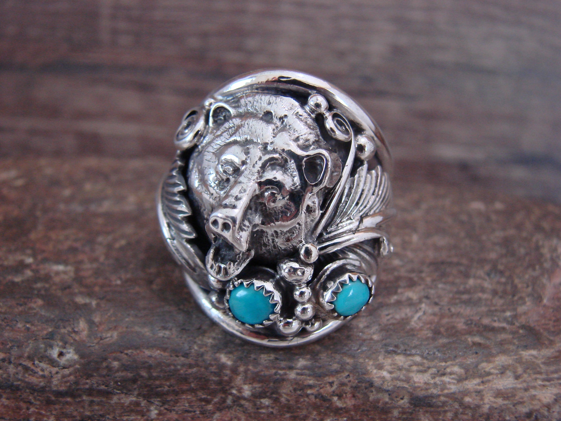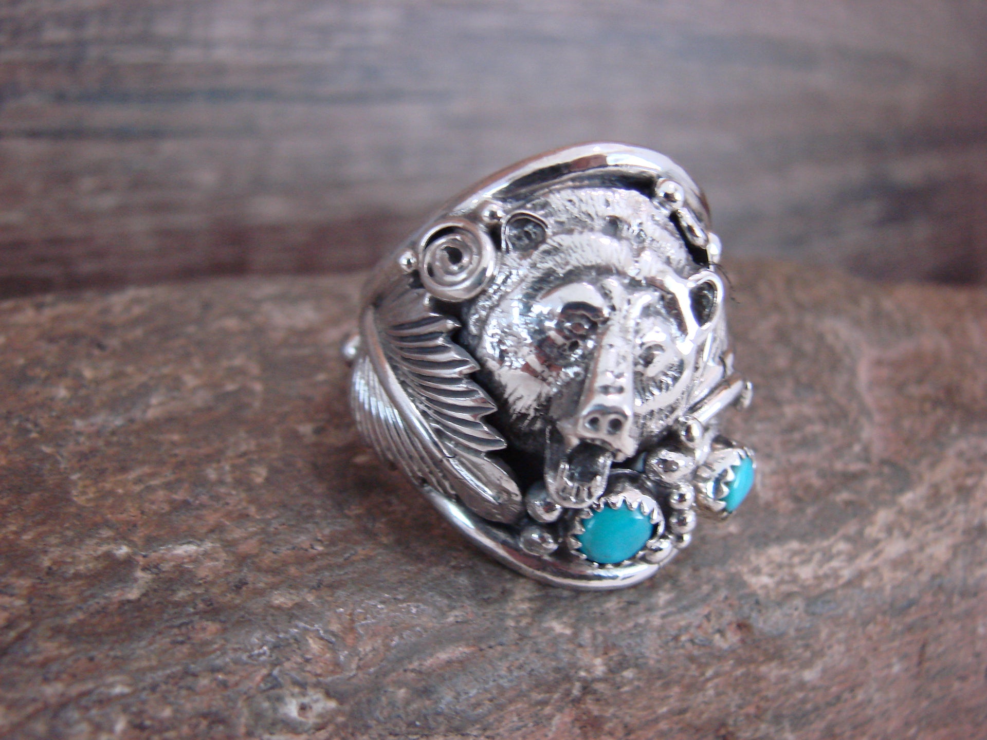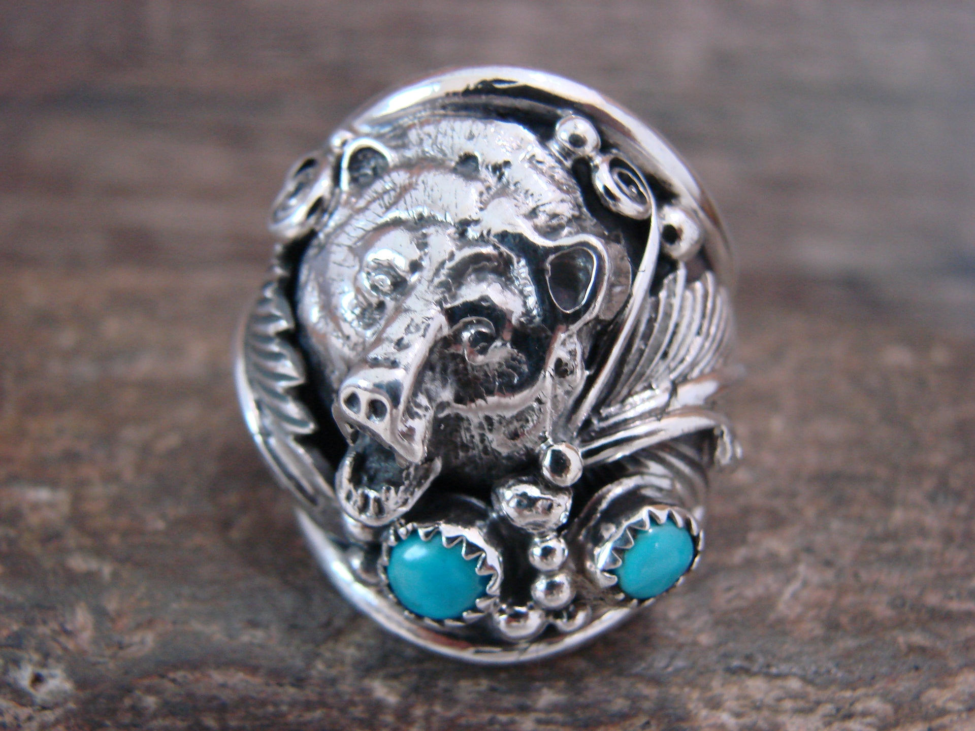 Native American Navajo Indian Sterling Silver Turquoise Bear Ring from Western New Mexico. This ring features a stunning Cast Bear in Sterling Silver accented by 2 Genuine Turquoise stones. These beautiful stones are set into crown Sterling Silver bezel settings. Polished to a bright shine, this is a very nice ring! Handmade by Navajo Silversmith Jeanette Saunders. Hallmarked on the back. Free shipping and gift box included!