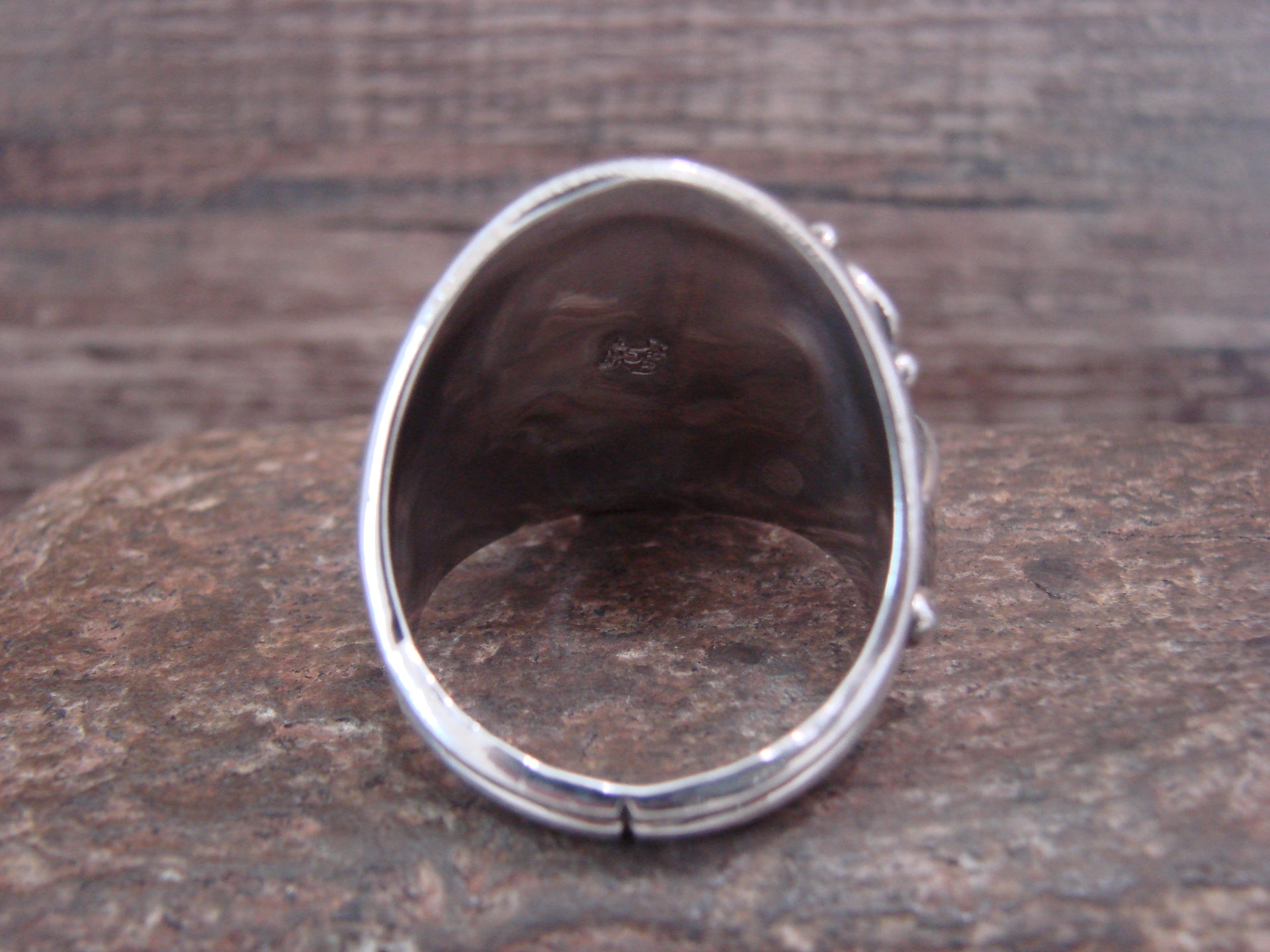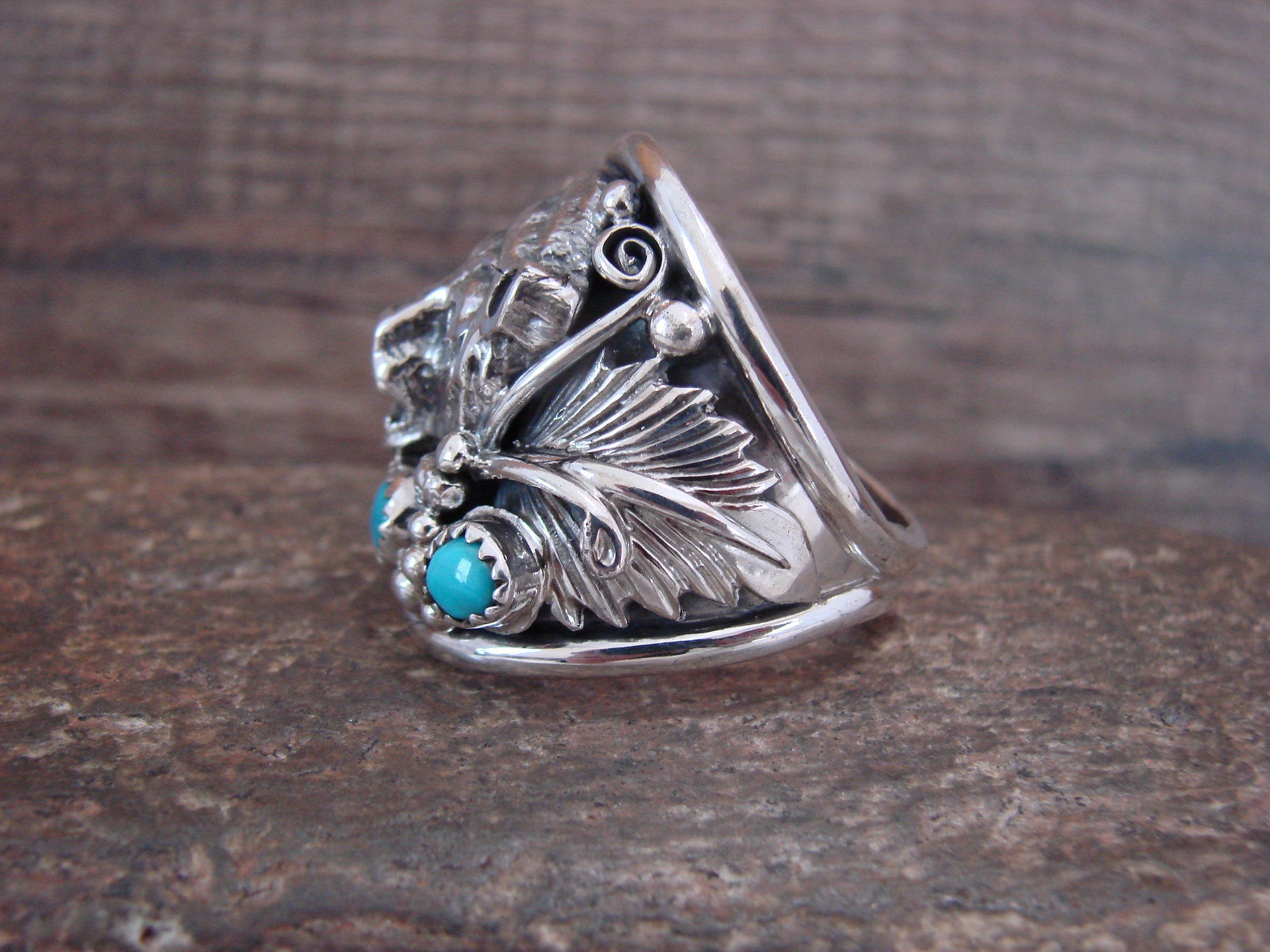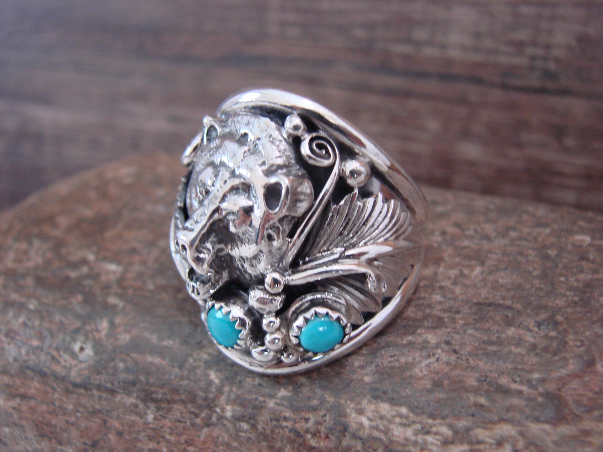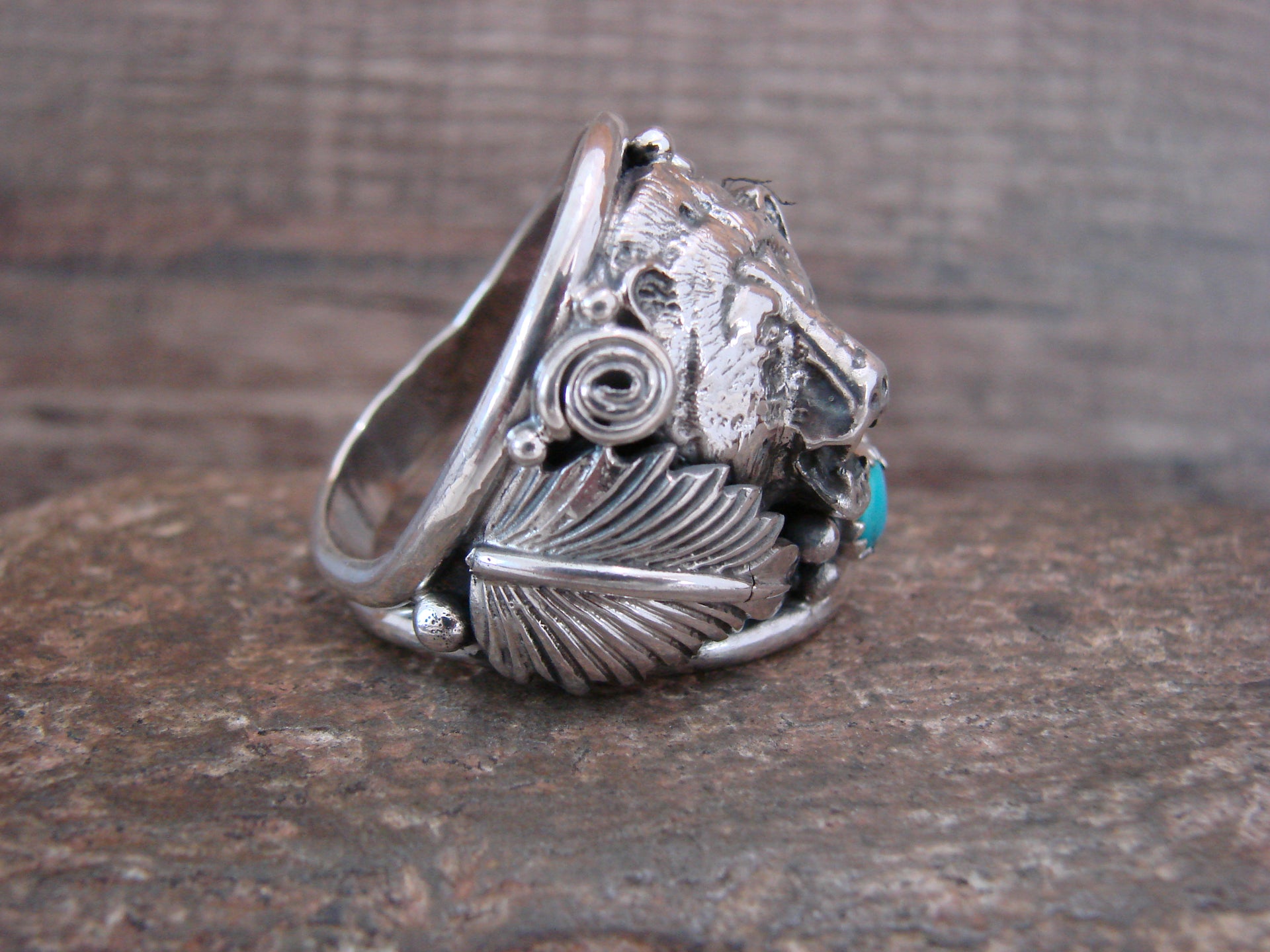 Native American Navajo Indian Sterling Silver Turquoise Bear Ring from Western New Mexico. This ring features a stunning Cast Bear in Sterling Silver accented by 2 Genuine Turquoise stones. These beautiful stones are set into crown Sterling Silver bezel settings. Polished to a bright shine, this is a very nice ring! Handmade by Navajo Silversmith Jeanette Saunders. Hallmarked on the back. Free shipping and gift box included!