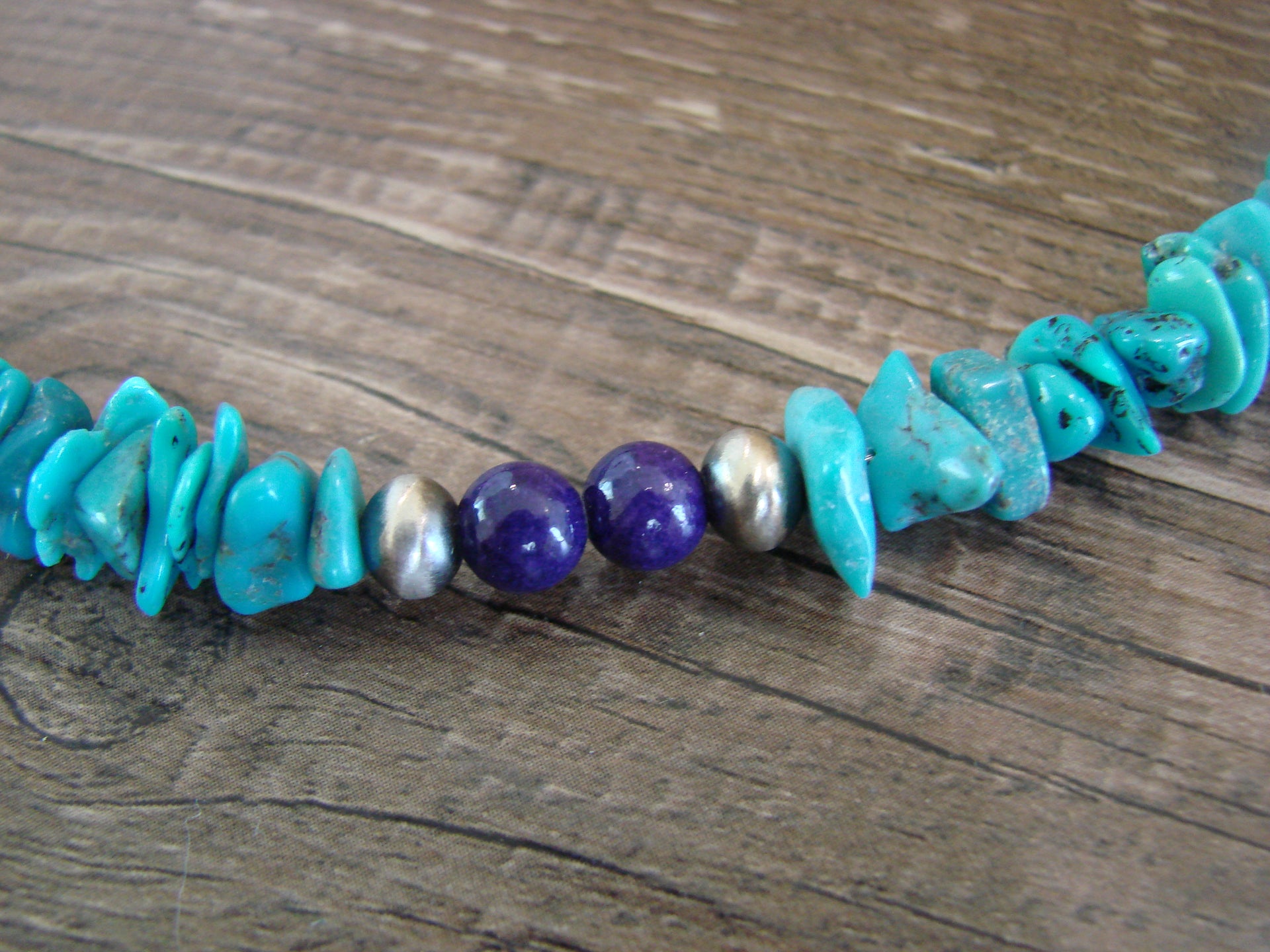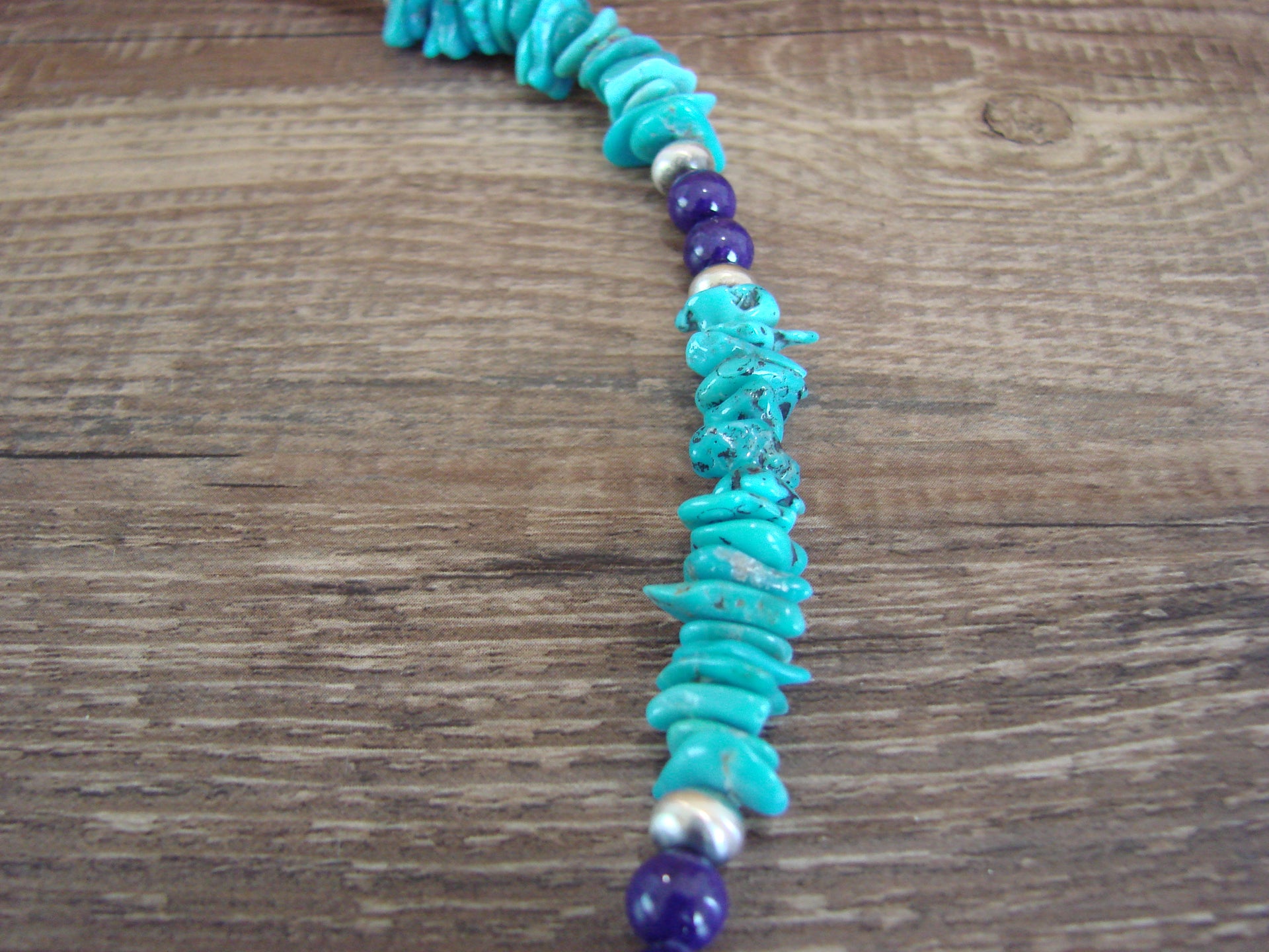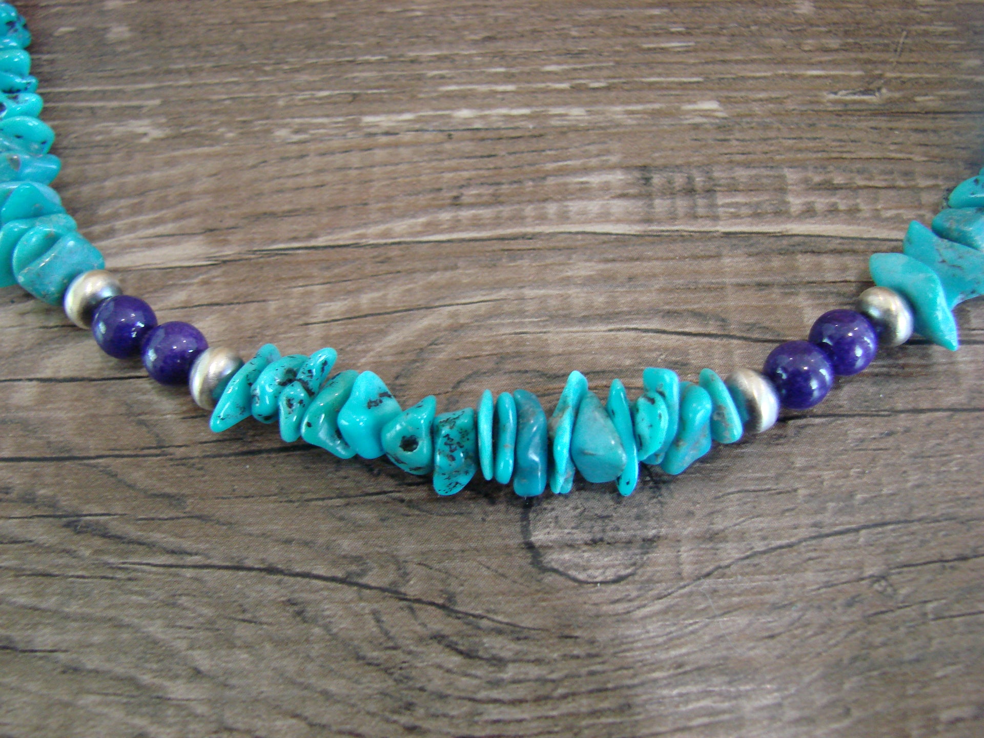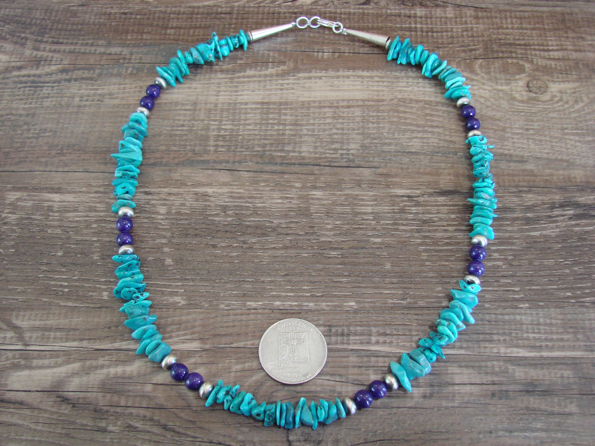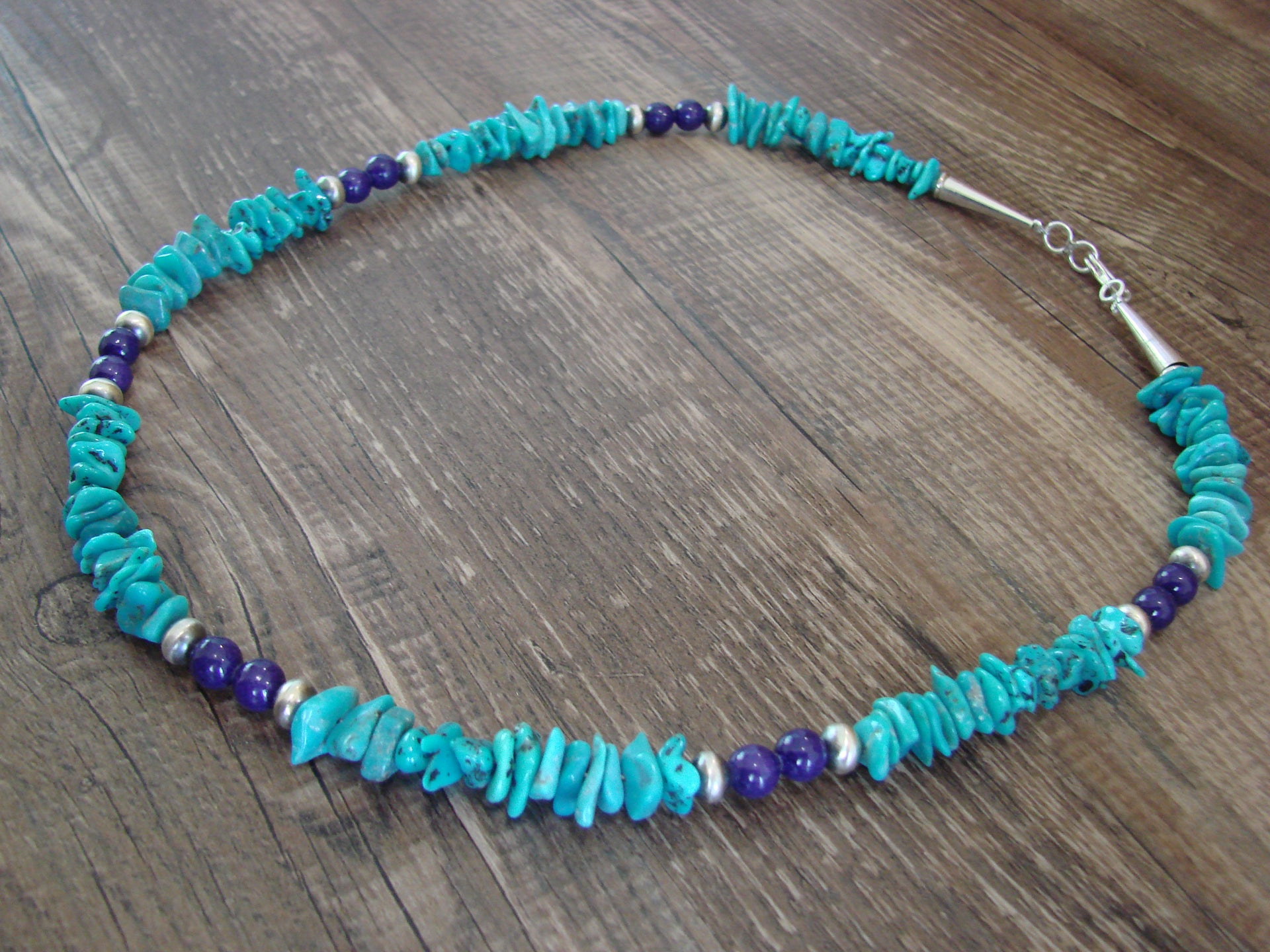 Native American Navajo Indian Sterling Silver Turquoise & Lapis Necklace from Western New Mexico. This necklace features Stunning, Genuine Turquoise Nugget Stones beautifully accented with Blue Lapis, and Sterling Silver Navajo Pearls. Fine Navajo Silversmith workmanship quality makes this necklace a beautiful hand made masterpiece! Handmade by Navajo Silversmith Isabelle John. Unsigned. Free gift box and shipping included!