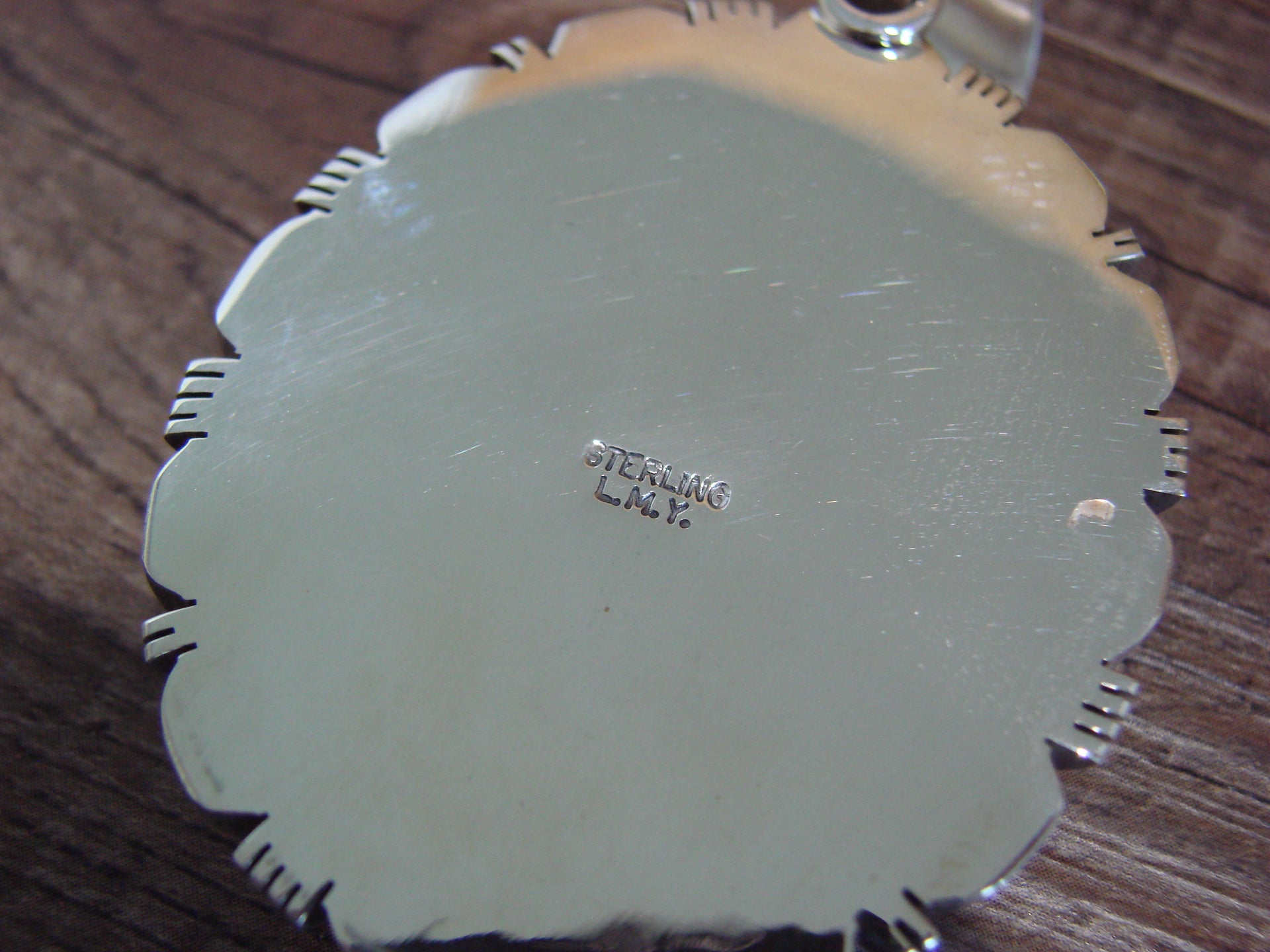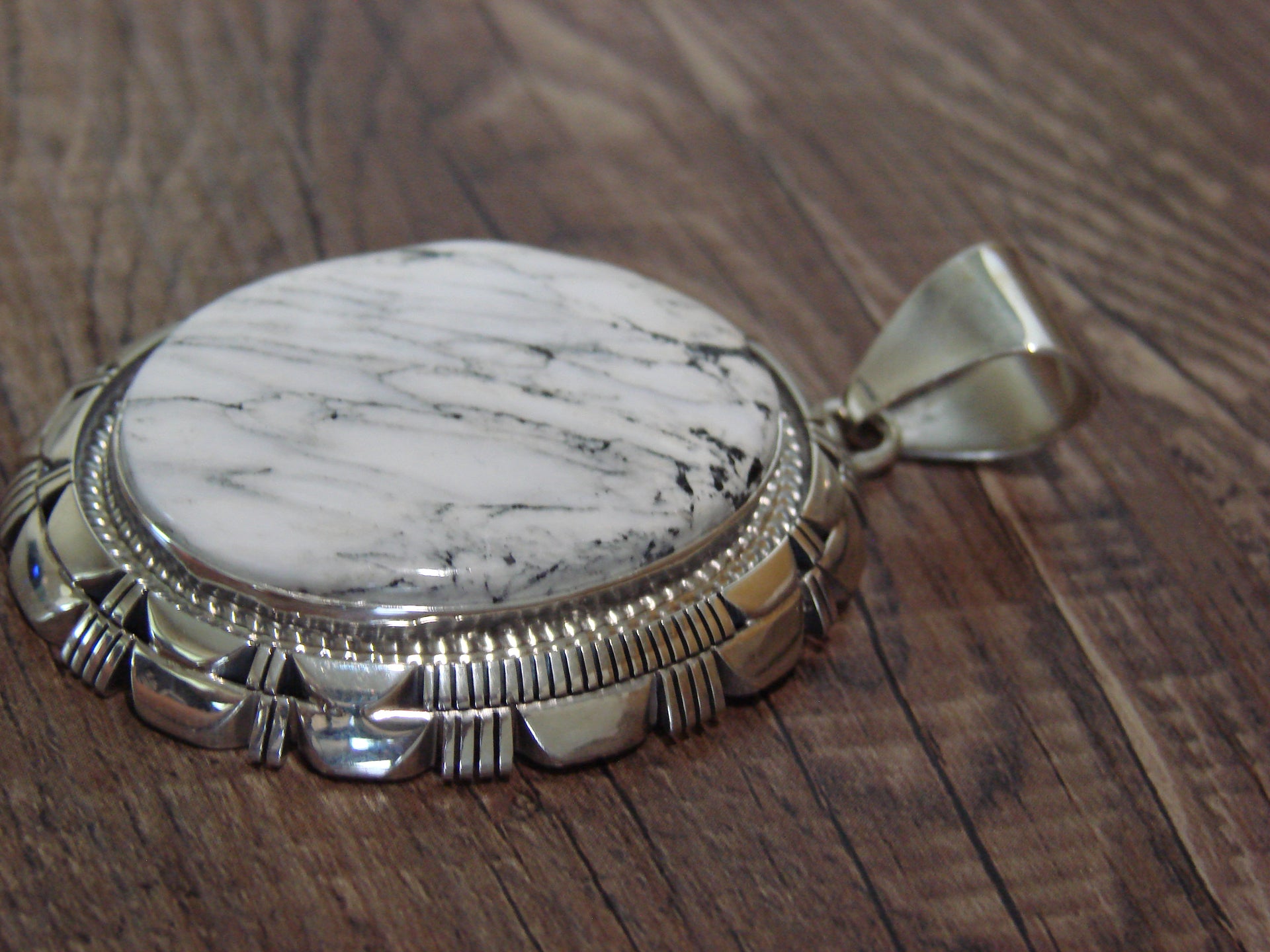 Native American Navajo Indian Hand Stamped Sterling Silver & White Buffalo Turquoise Pendant from Western New Mexico. This Stunning pendant features a genuine White Buffalo Turquoise stone set into a smooth Sterling Silver bezel setting. Surrounding the stone are beautiful details in Sterling Silver. This pendant is Gorgeous and Hand Made to Perfection! Navajo Indian handmade by L.M. Yazzie. Signed "L.M.Y." and stamped "Sterling" on the back. Free shipping and Gift Box included!