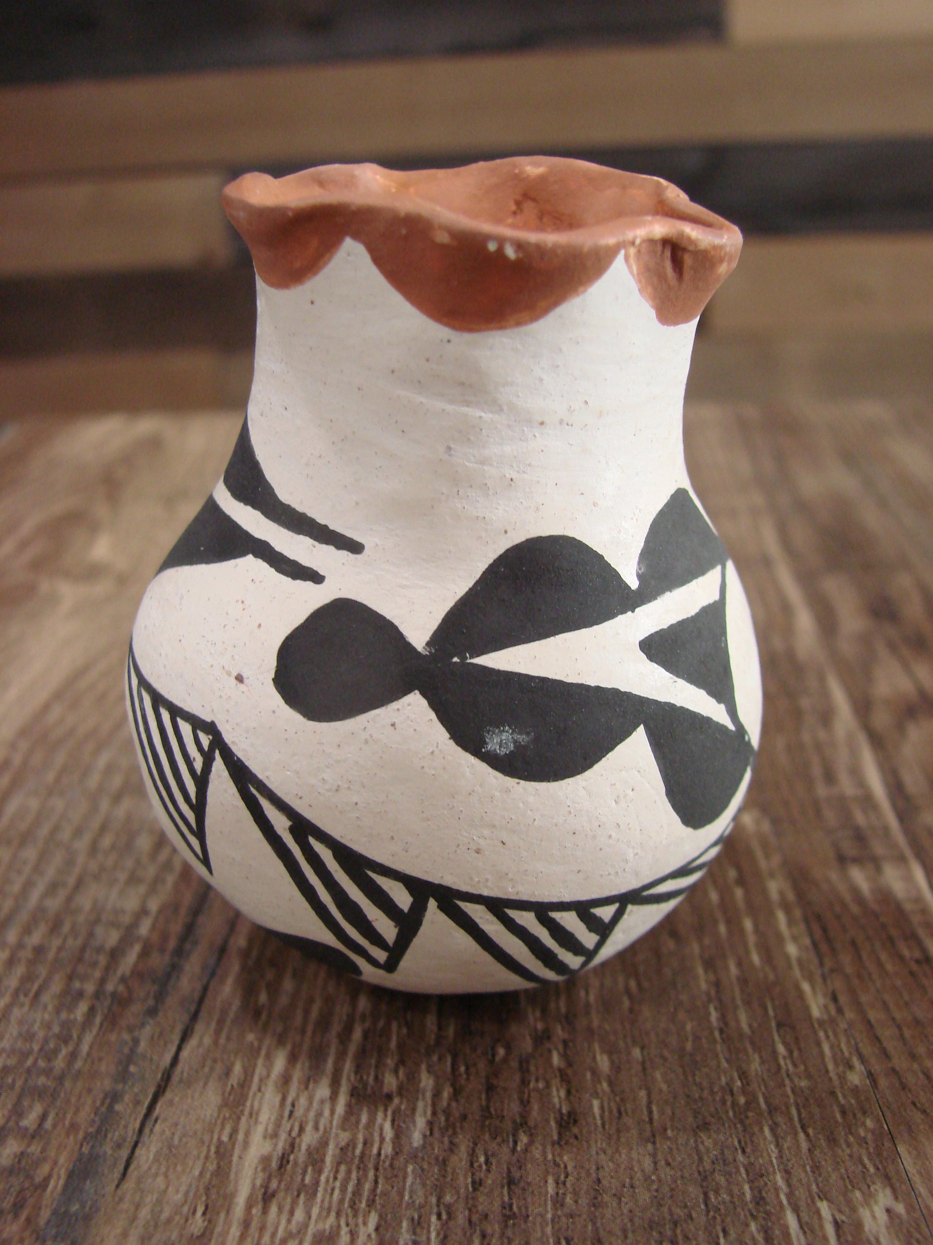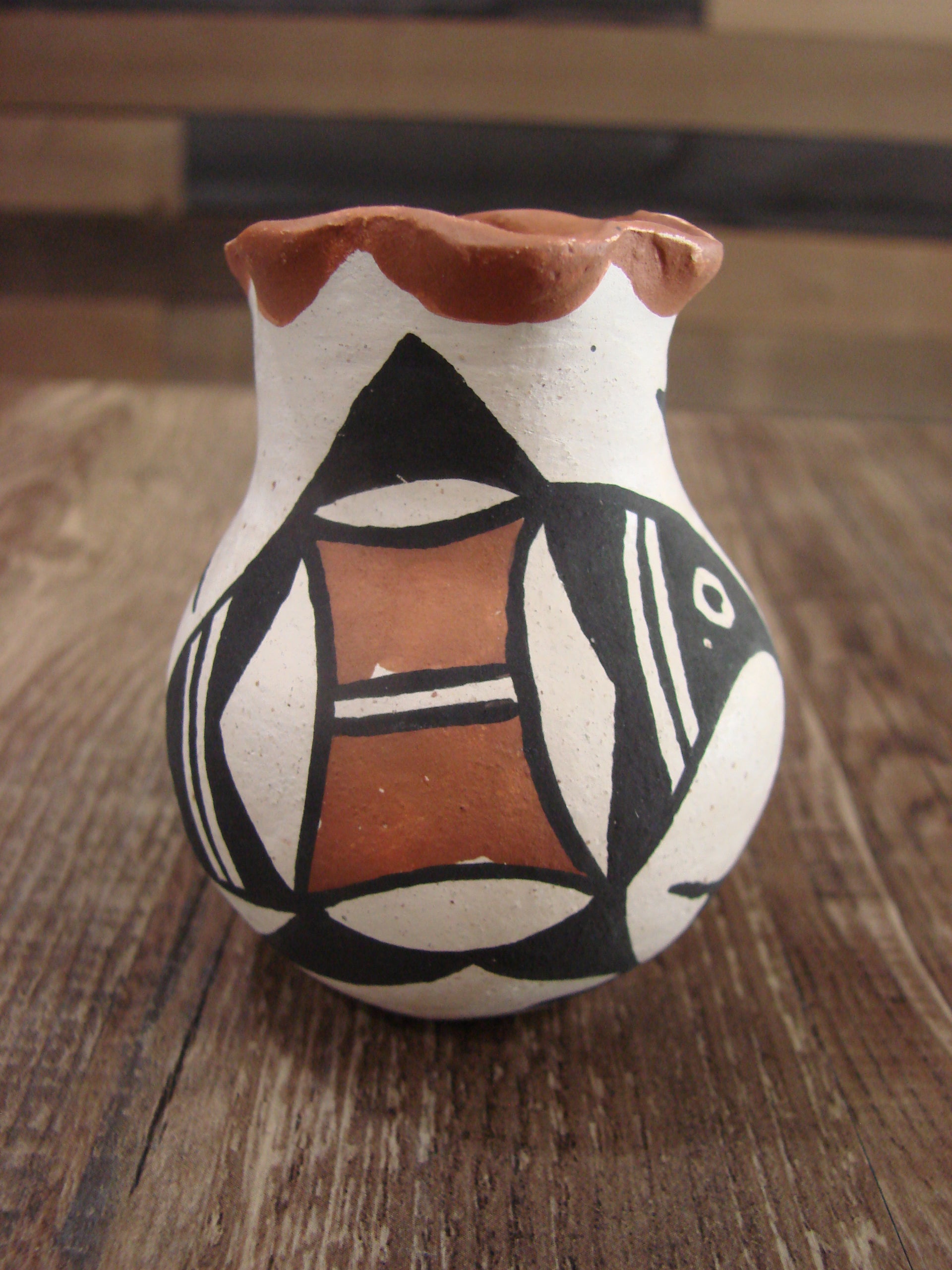 Small Genuine Native American Acoma Pueblo Indian Hand Made Fine Line Clay Pottery from Western New Mexico. This Gorgeous piece of pottery features Stunning natural pigment and hand painted patterns throughout. The detail is exquisite! Hand Made with Acoma Clay. Masterfully Sculpted and Hand painted by Acoma artist Leno. The bottom is signed. Free Shipping included!