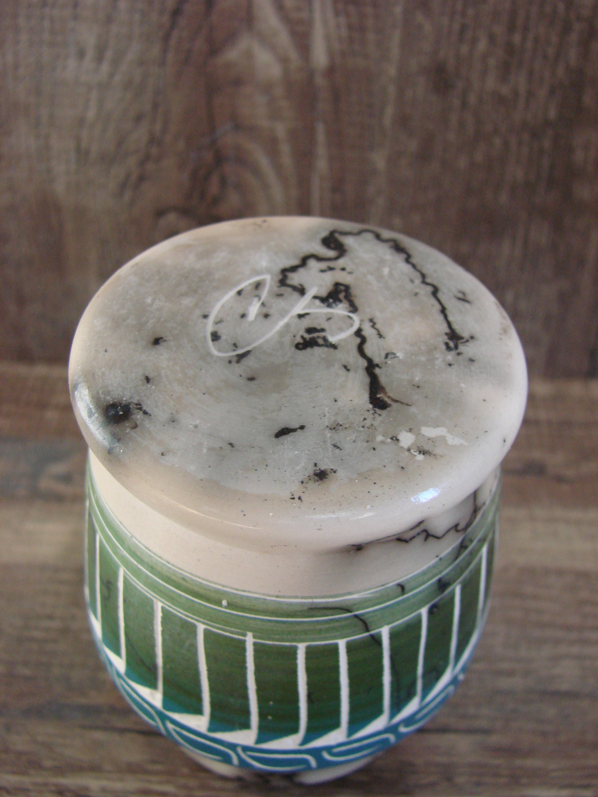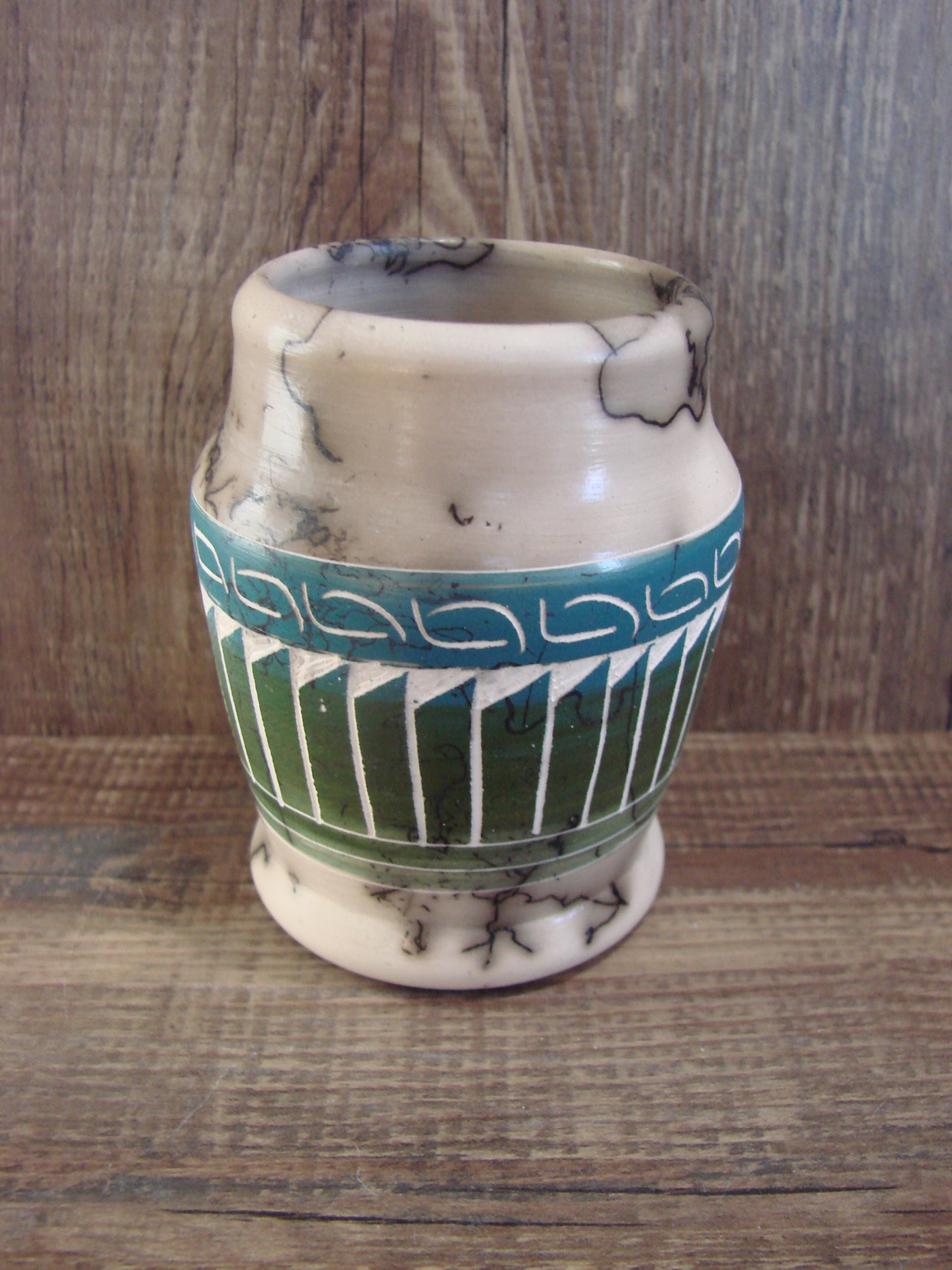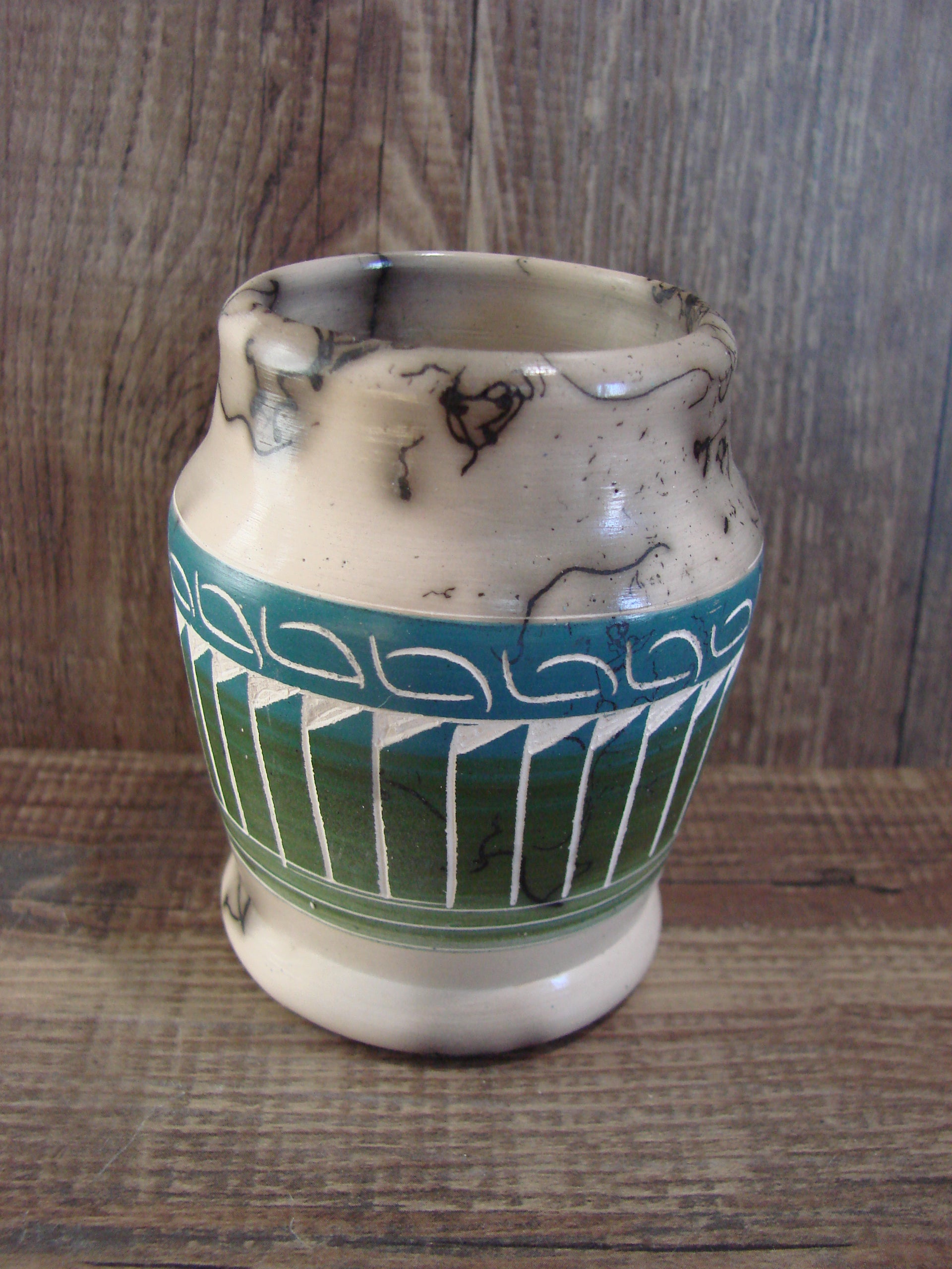 Small Genuine Native American Navajo Indian Hand Etched and Hand Painted Horse Hair Pottery Vase from Western New Mexico. This Small piece of pottery features stunning Hand Painted and traditional Hand Etched Navajo patterns throughout. Horse Hair is laid over this piece during firing to create a unique, one of a kind look! Hand etched and painted by Cecilia Benally. Signed "CB" on the bottom. Free shipping included!