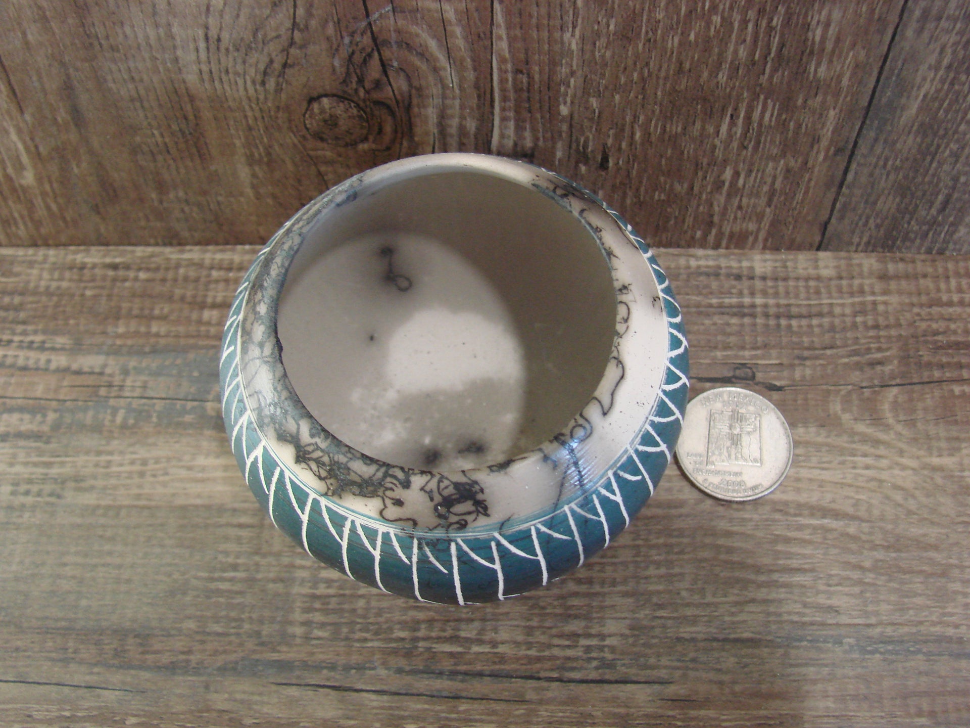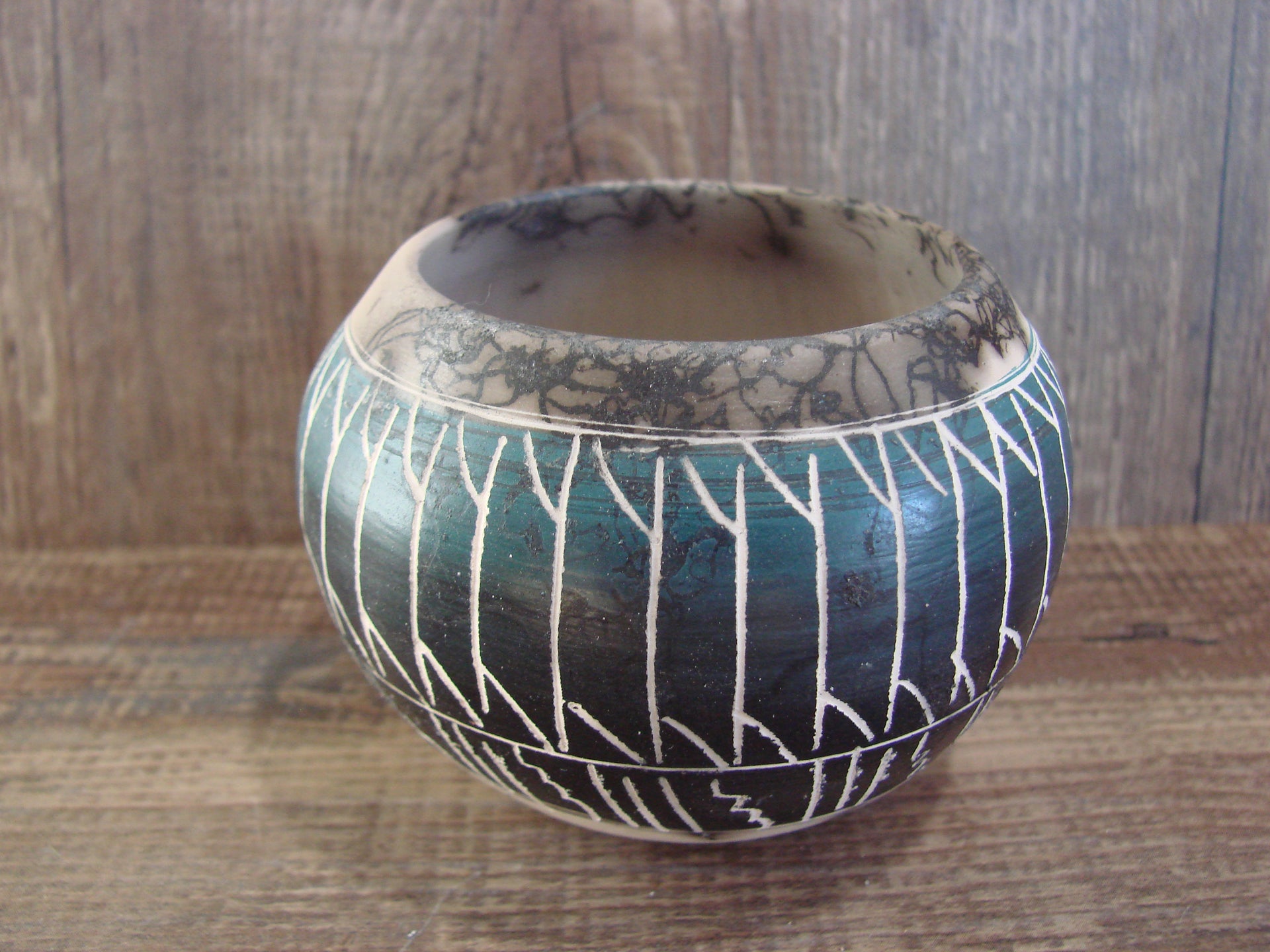 Small Genuine Native American Navajo Indian Hand Etched and Hand Painted Horse Hair Pottery Vase from Western New Mexico. This Small piece of pottery features stunning Hand Painted and traditional Hand Etched Navajo patterns throughout. Horse Hair is laid over this piece during firing to create a unique, one of a kind look! Hand etched and painted by Cecilia Benally. Signed "CB" on the bottom. Free shipping included!