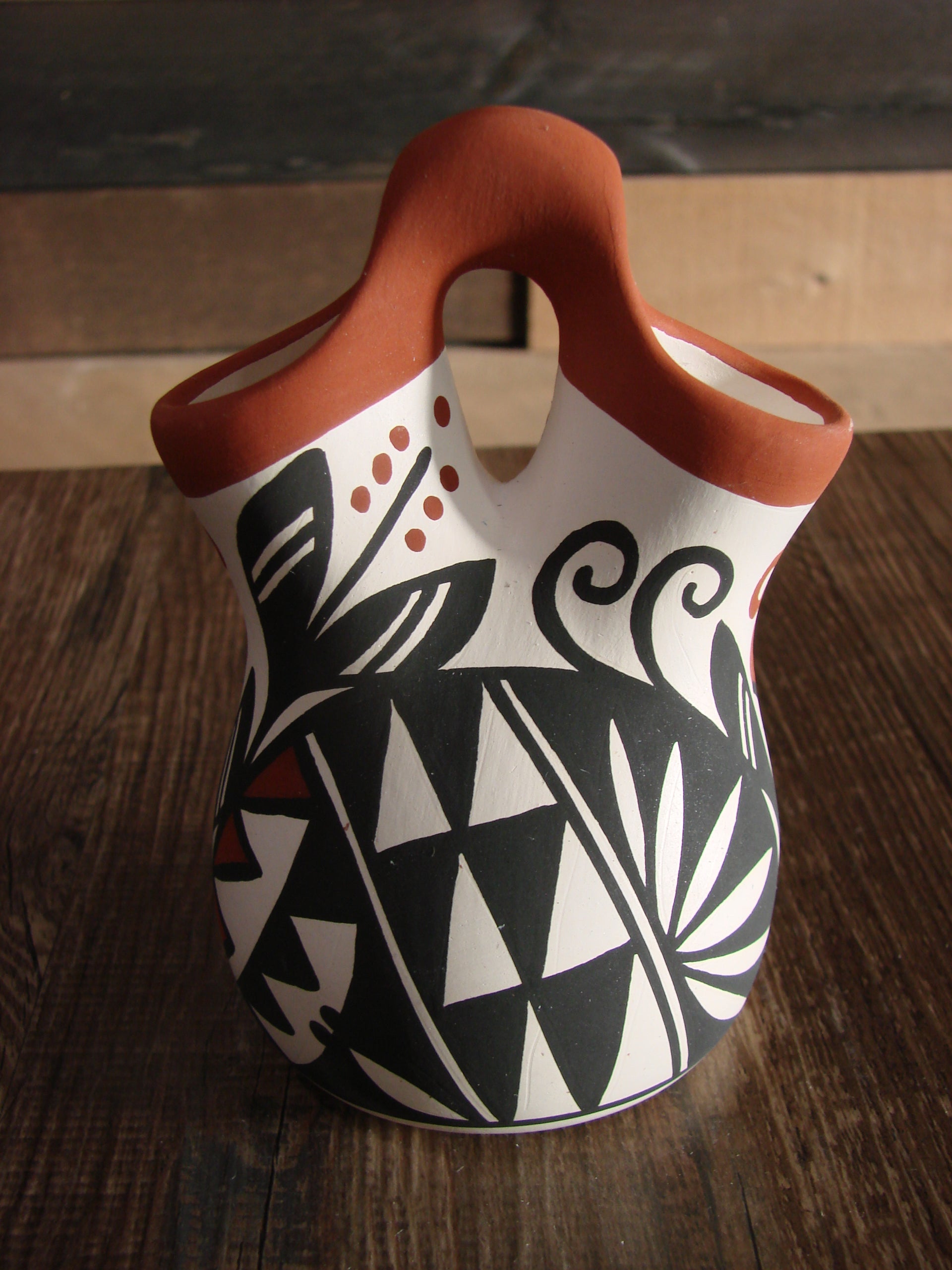 Genuine Native American Acoma Pueblo Indian Hand Painted Wedding Vase Pottery from Western New Mexico. This Small piece of pottery features Stunning natural pigment hand painted patterns throughout. The detail is exquisite! Masterfully Hand painted by Acoma artist Keith Sr. The bottom is signed "Keith Sr. Acoma N.M". Free Shipping included!