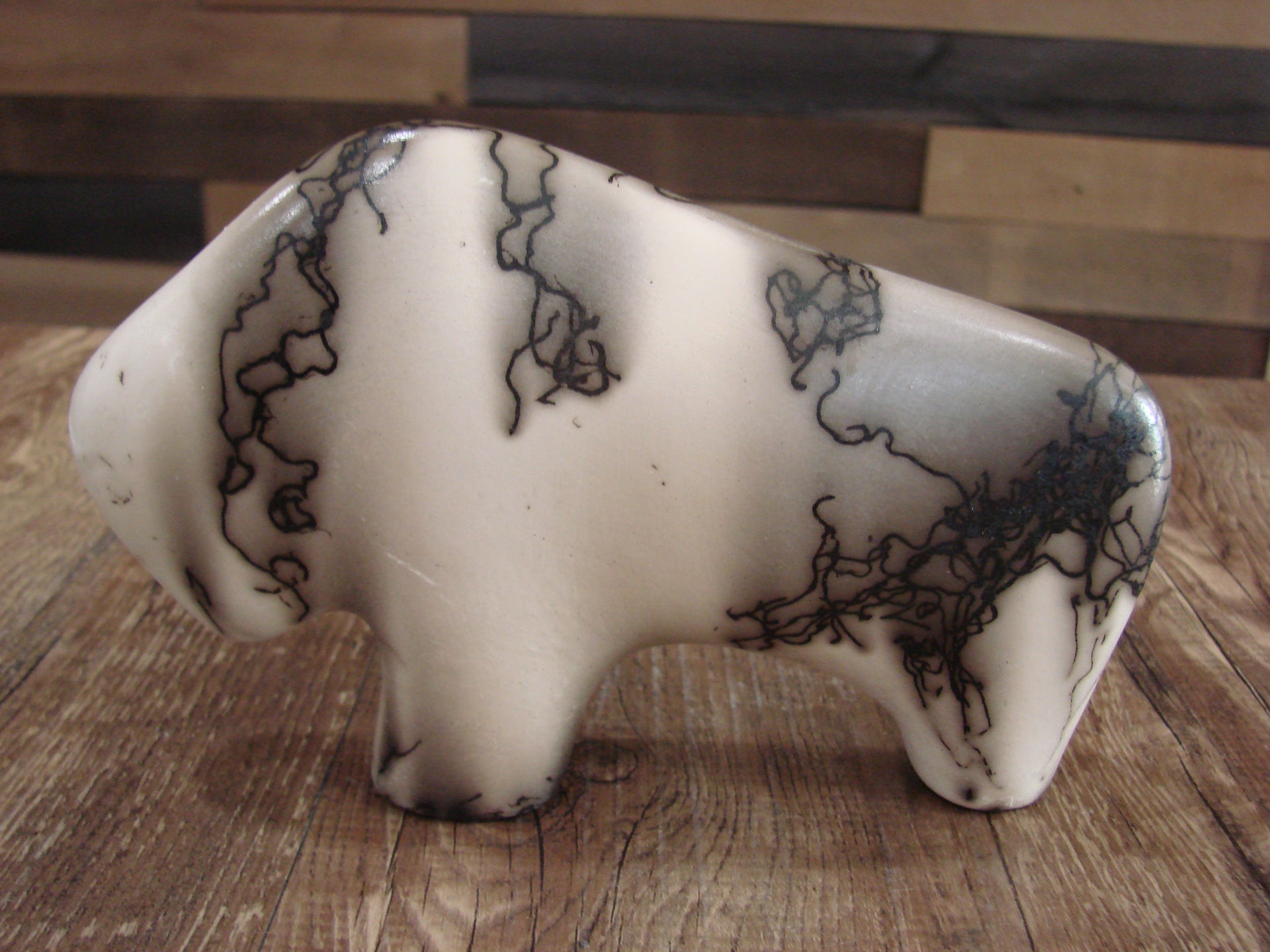 Genuine Native American Navajo Indian Horse Hair Buffalo Sculpture from Western New Mexico. This Small Bear sculpture features beautiful horse hair throughout. The Horse hair is laid over this piece during firing, the result is a beautiful one of a kind look! Hand etched by Navajo artist Vail. Signed on the bottom. Free Shipping included!