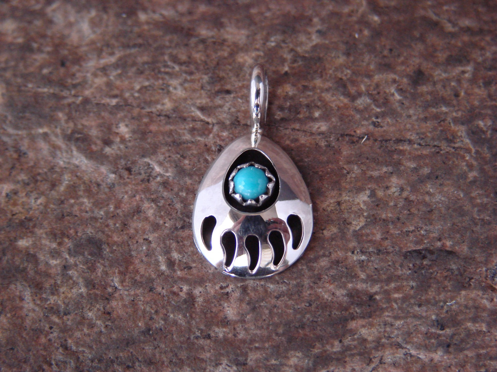 Native American Navajo Indian Sterling Silver Turquoise Bear Paw Charm Pendant from Western New Mexico. This tiny Charm features a Turquoise stone set into a crown sterling silver bezel. The Bear Paw is cut out around the stone giving it a very nice shadow box look. Handmade by Leta Parker. Stamped Sterling on the back. Free Shipping with a Gift Box!
