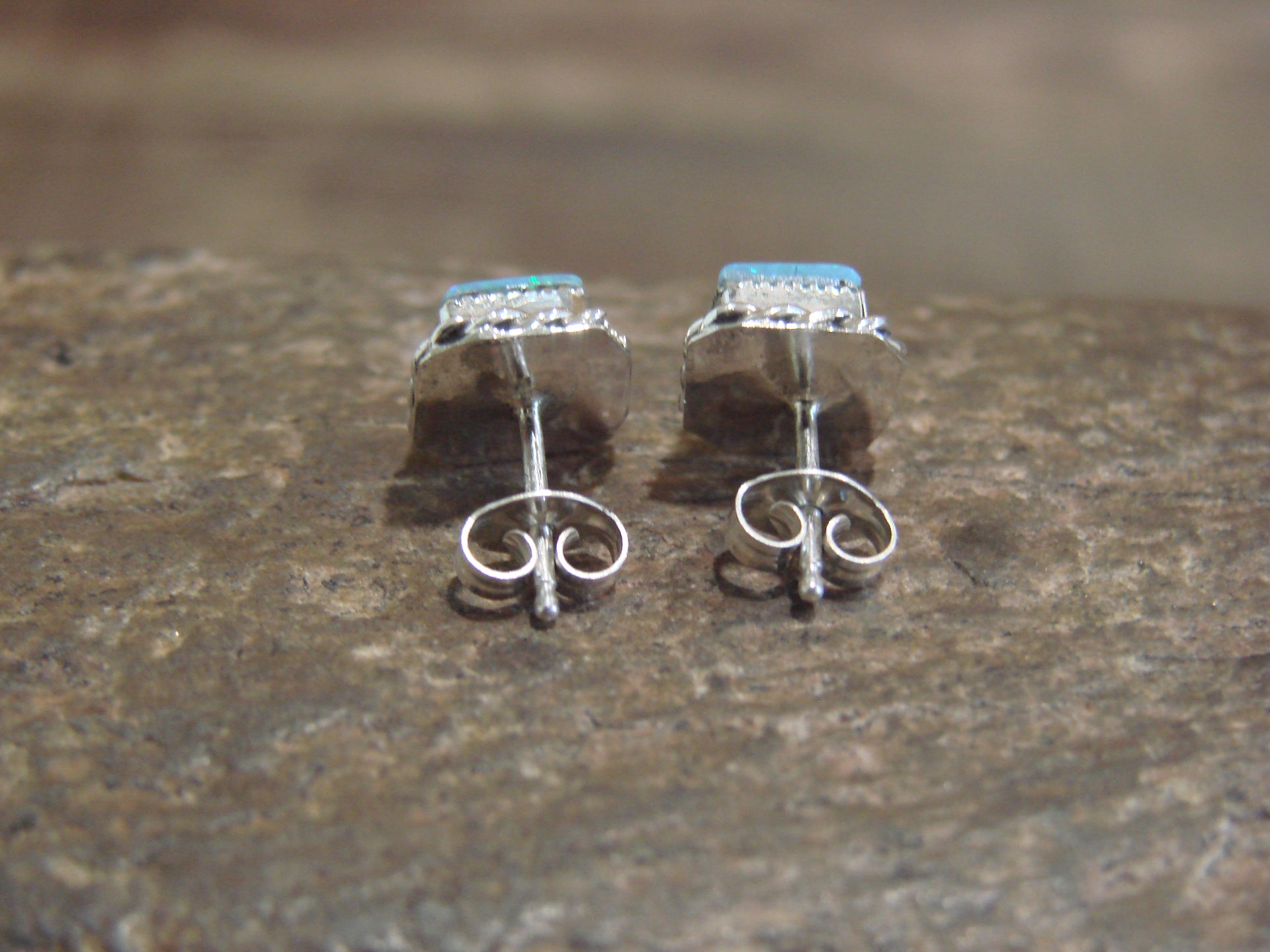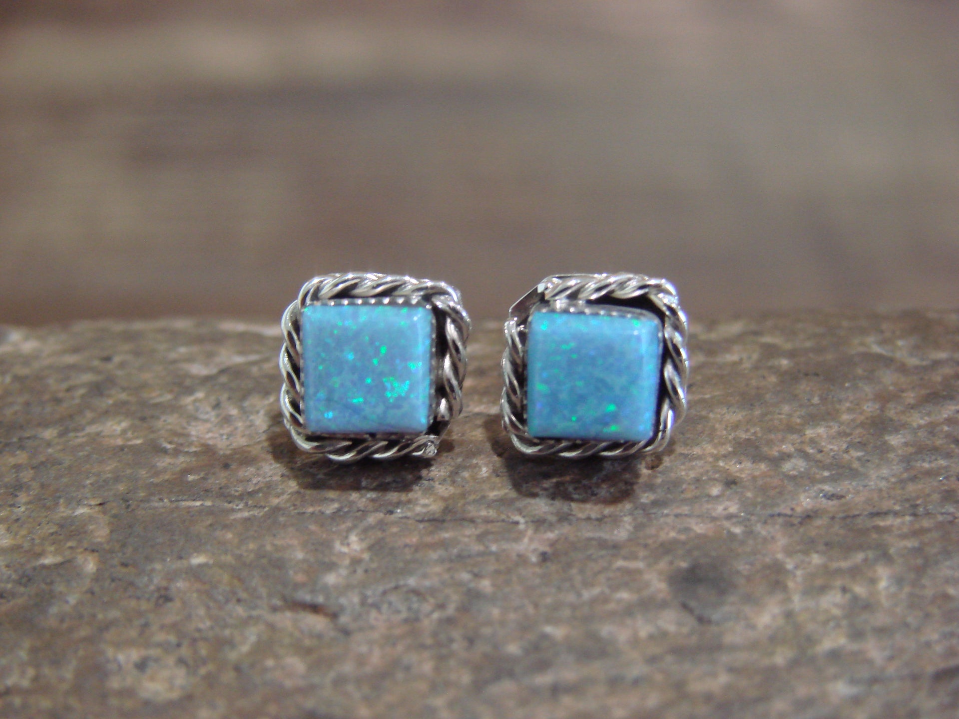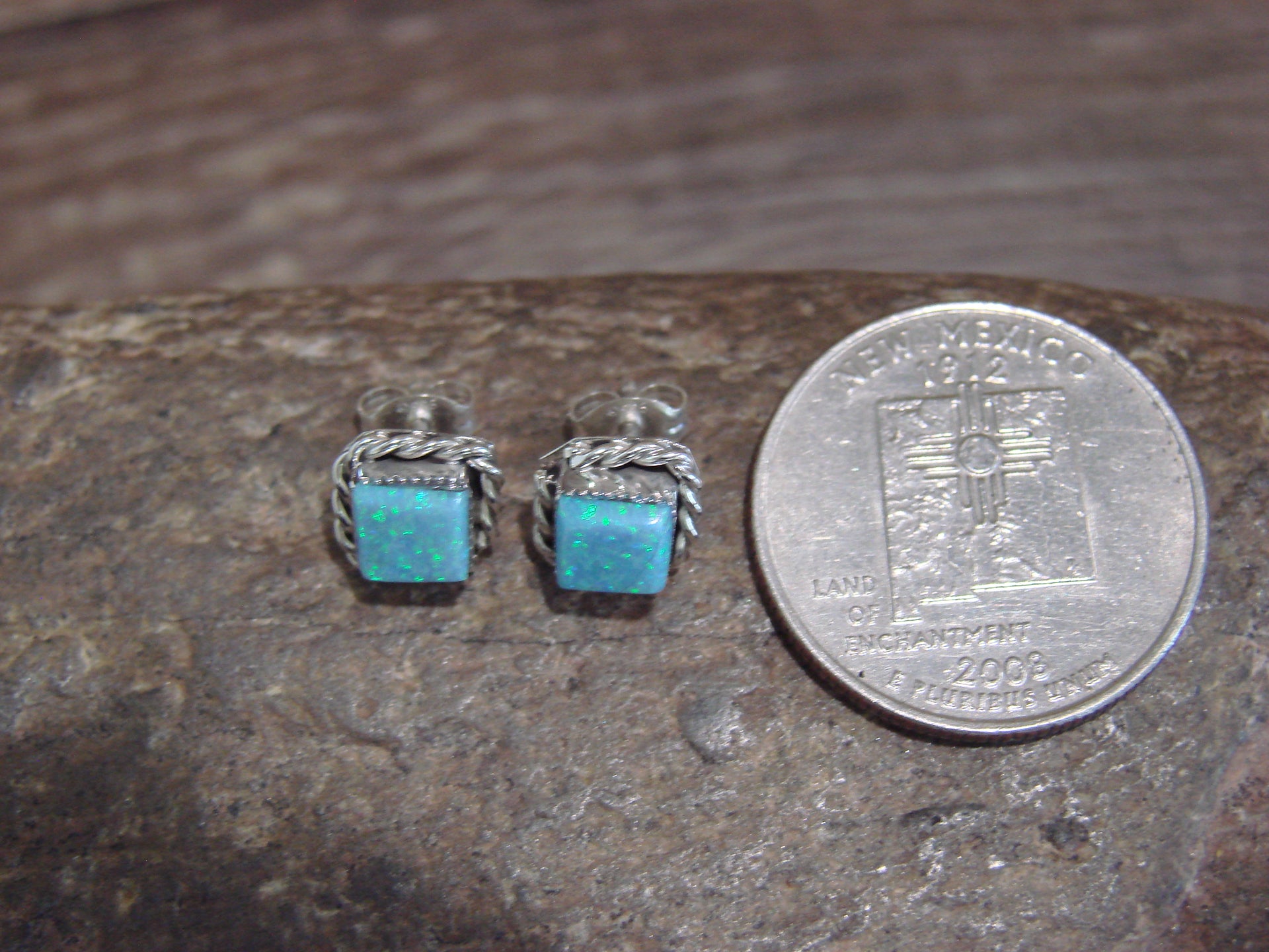 Zuni Indian Sterling Silver Square Blue Opal Post Earrings by Leander Cachini
