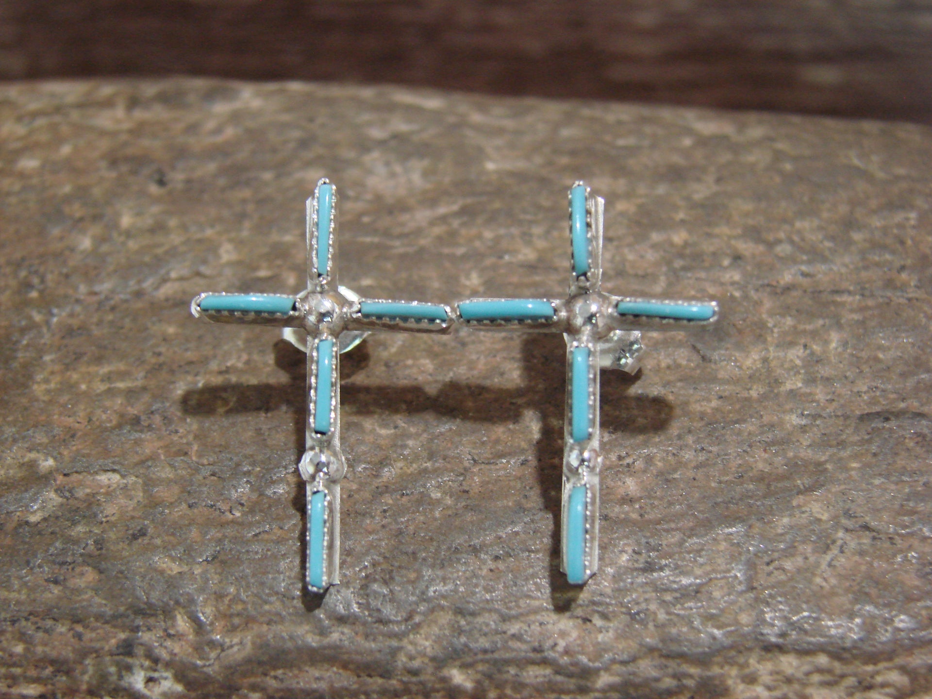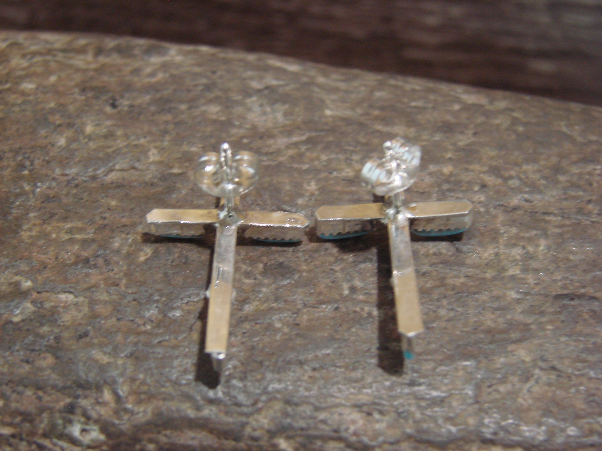 Native American Zuni Indian Sterling Silver Cross Post Earrings from Western New Mexico. These earrings feature 5 beautiful Turquoise stones each. Each stone is set into a sterling silver bezel and beautifully polished. These have a great look! Zuni Indian handmade by Leekity. Free shipping with a gift box included!