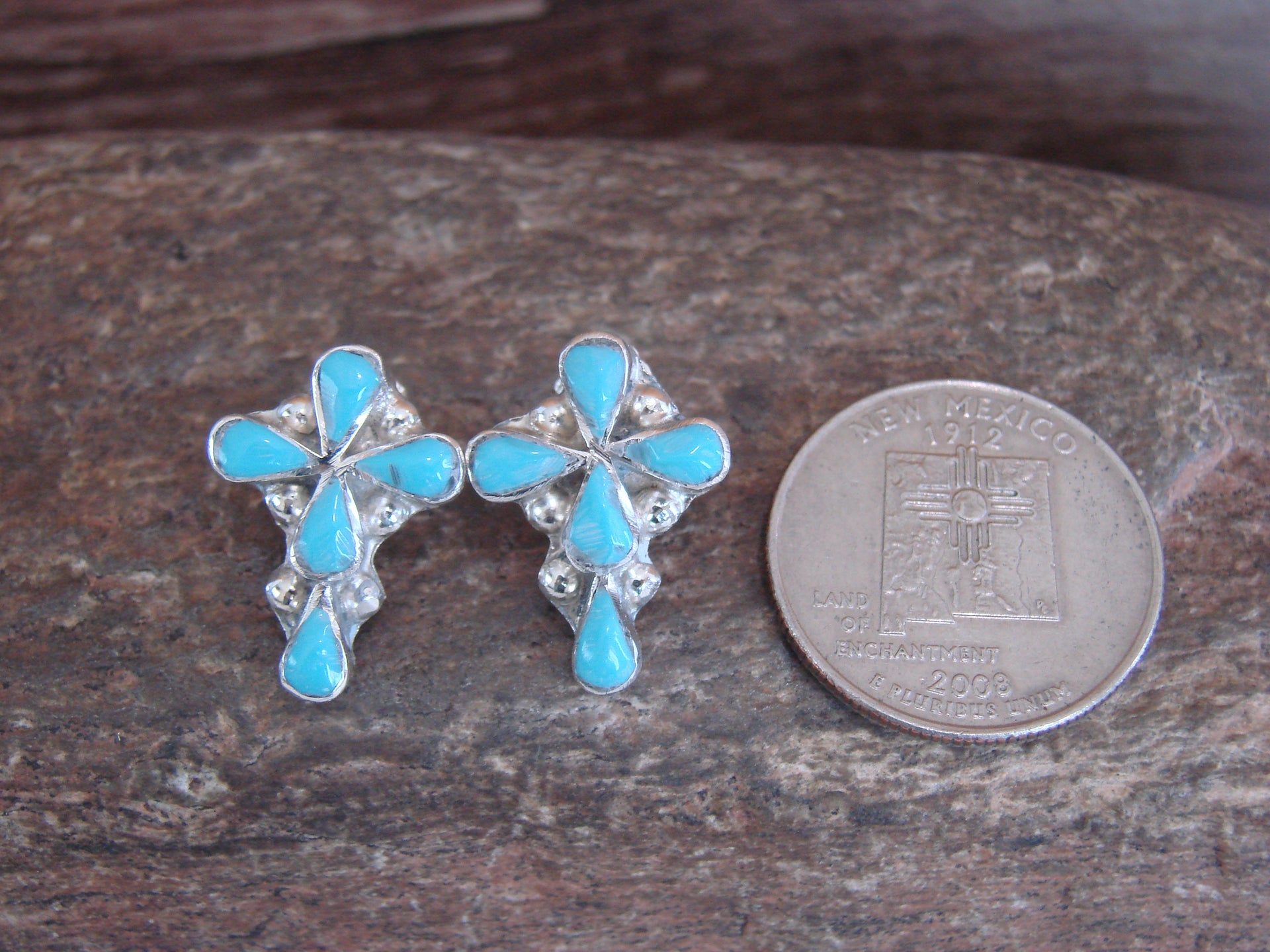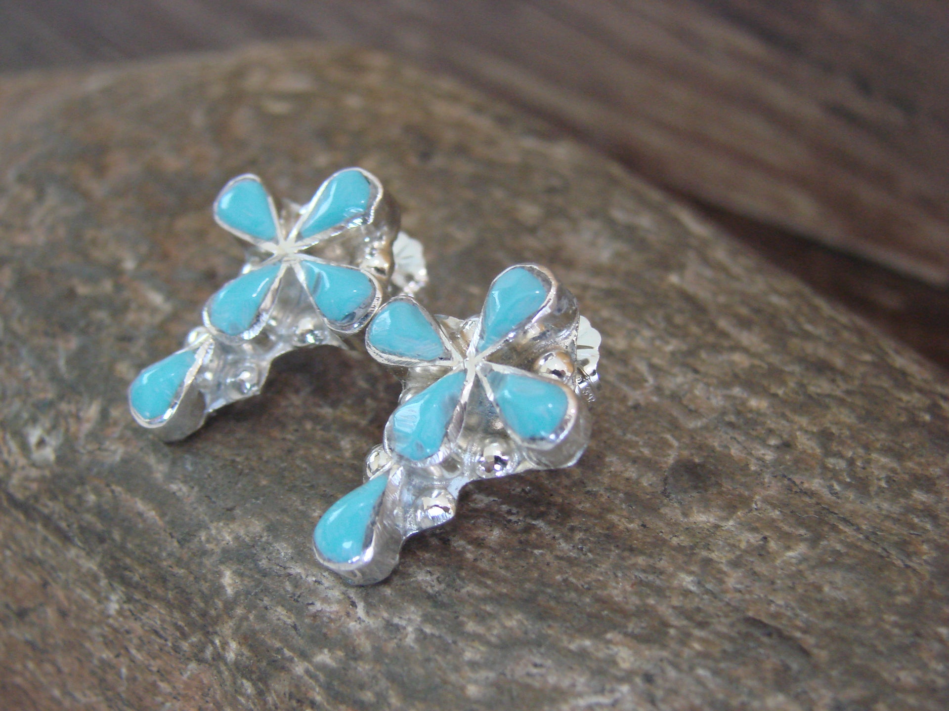 Native American Zuni Indian Sterling Silver Turquoise Cross Earrings from Western New Mexico. These earrings feature 5 genuine Turquoise stones each. Each stone is set into a smooth sterling silver bezel setting and nicely polished. These earrings have a great look! Free gift box included! Zuni Indian handmade by Pino Yunie. Unsigned. Free shipping and gift box included!