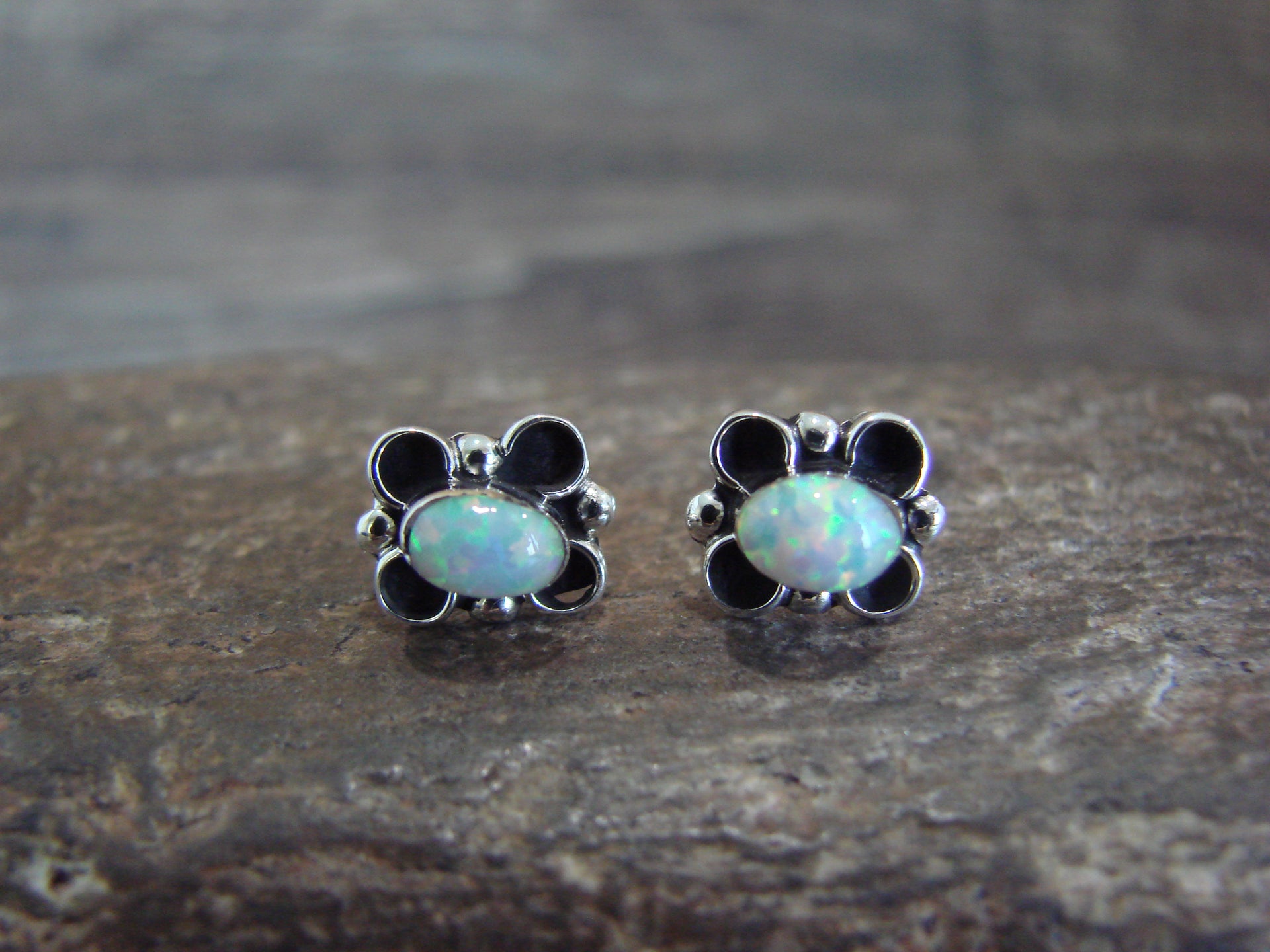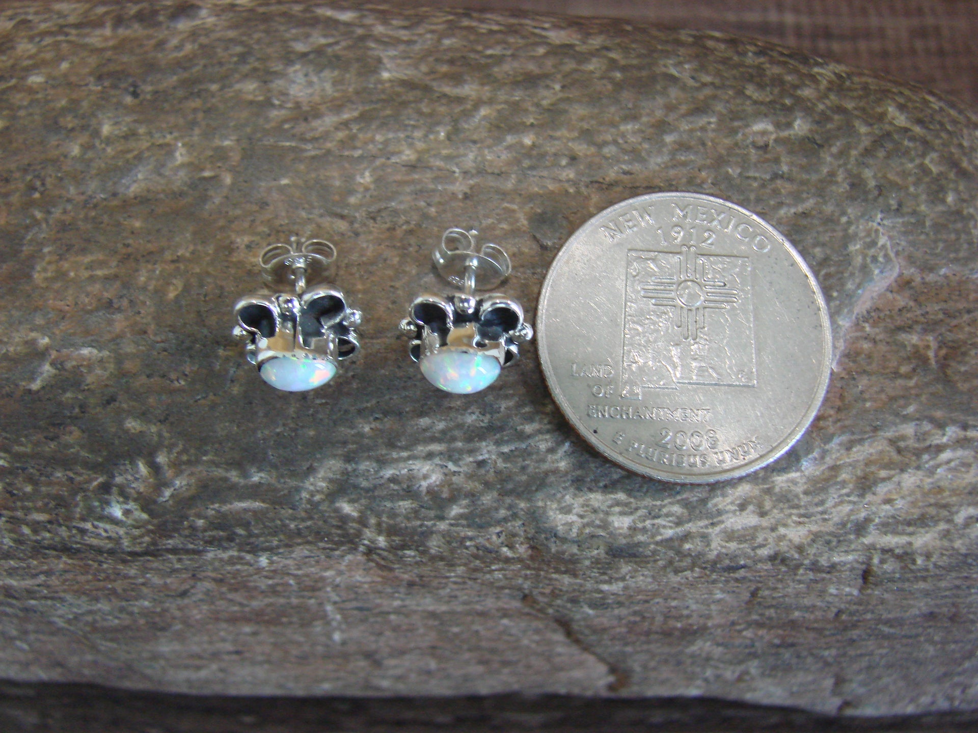 Native American Zuni Indian Sterling Silver & Opal Stud Earrings from Western New Mexico. These earrings feature beautiful White Lab Opal stones set into smooth sterling silver bezel settings. The sterling silver work surrounding the earrings is very nicely detailed and polished! Handmade by Lloyd Kanesta. Unsigned. Free shipping and gift box included!